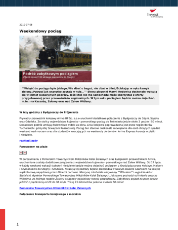 2010-07-08 Weekendowy pociąg ""Wsiąść do pociągu byle jakiego,/Nie dbać o bagaż, nie dbać o bilet,/Ściskając w ręku kamyk zielony,/Patrzeć jak wszystko zostaje w tyle..."" Słowa piosenki Maryli Rodowicz doskonale wpisują się w klimat wakacyjnych podróży. Jeśli ktoś nie ma samochodu może skorzystać z oferty przygotowanej przez przewoźników regionalnych. W tym roku pociągiem będzie można dojechać, m.in.: na Kaszuby, Żuławy oraz nad Zalew Wiślany. W trzy godziny z Bydgoszczy do Trójmiasta Prywatny przewoźnik kolejowy Arriva RP Sp. z.o.o uruchomił dodatkowe połączenia z Bydgoszczy do Gdyni, Sopotu oraz Gdańska. Ze stolicy województwa kujawsko - pomorskiego pociąg do Trójmiasta jedzie około 2 godzin i 50 minut. Dodatkowo podróż umilają malownicze widoki za okna. Linia kolejowa poprowadzona jest przez region Borów Tucholskich i górzystej Szwajcarii Kaszubskiej. Pociąg ten stanowi doskonałe rozwiązanie dla osób chcących spędzić weekend nad morzem oraz dla studentów wracających na weekendy do domów. Arriva Express kursuje w piątki i niedziele. rozkład jazdy Parowozem na plaże W porozumieniu z Pomorskim Towarzystwem Miłośników Kolei Żelaznych oraz bydgoskim przewoźnikiem Arriva, uruchomione zostały dodatkowe połączenia z województwa kujawsko - pomorskiego nad Zalew Wiślany. Od 17 lipca, w każdy weekend wakacji (soboty i niedziele) będzie można dojechać pociągiem z Grudziądza przez Kwidzyn, Malbork i Szymankowo do Stegny i Sztutowa. Atrakcją tej podróży będzie przesiadka w Nowym Dworze Gdańskim na kolejkę wąskotorową napędzaną przez 60-letni parowóz. Maszynę zdrobniale nazywamy ""Wilusiem""- wyjaśnia Artur Stefański, dyrektor Pomorskiego Towarzystwa Miłośników Kolei Żelaznych. Jej nazwa pochodzi od imienia cesarza Wilhelma, za którego rządów Żuławy osiągnęły największy rozwój gospodarczy. Zabytkowy pojazd na parę będzie jeździć z prędkością od 20 do 30 km/h. Trasę 15 kilometrów pokona w około 50 minut. Pomorskie Towarzystwo Miłośników Kolei Żelaznych Połączenie transportu kolejowego z morskim 1 Kolejną ciekawą ofertą turystyczną jest niedzielny pociąg z Grudziądza przez Malbork do miejscowości Tolkmicka, w której to pasażerowie przesiadają się na statek pływający po Zalewie Wiślanym. Po 45 minutowym rejsie docierają do jednego z najpiękniejszych polskich kurortów nadmorskich jakim jest Krynica Morska. Ze względu na ograniczoną liczbę miejsc na statku, bilety do Krynicy będą do nabycia wyłącznie w przedsprzedaży. Na czas wakacji dodatkowo reaktywowano nieczynną od 4 lat linie kolejową łączącą stacje Tolkmick ze stacją Braniewo. (Szczegółowe informacje na stronie Arriva Express ) Na północ regionu Jak co roku w sezonie letnim, pociągiem będzie można dojechać również na Hel oraz do Łeby i Ustki. Na Półwysep Helski kursować będzie wiele pociągów jadącymi bezpośrednio z Gdyni oraz z Gdańska. Do Łeby z Gdyni jeździć będą codziennie dwa pociągi zaś do Ustki tylko jeden. Magdalena Wroniak Zobacz także: Pociągiem z Gdyni do Kartuz! Autor MW 2