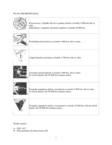 PLAN SMAROWANIA Przerywacze, wkładka filcowa i punkty obrotu co każde 5 000 km lub co roku. Odśrodkowy regulator momentu zapłonu co każde 30 000 km. Przekładnia kierownicza co każde 5 000 km, lub co roku. Cięgła hamulca ręcznego co każde 1 500 km, lub co roku. Zwrotnica kół przednich co każde 5 000 km, lub co roku. Po trzech latach, lub 30 000 km zmiana smaru. Przeguby napędowe półosi, zewnętrzne co każde 5 000 km, lub co roku. Po trzech latach, lub 30 000 km zmiana smaru. Przeguby napędowe półosi, wewnętrzne co każde 20 000 km, lub po trzech latach, lub 30 000 km zmiana smaru. Środki smarne: A - SWC 423 B - Olej specjalny do przerywaczy B2 1 Pompa hamulcowa - jak ją wymontować, rozłożyć na części pierwsze i zamontować. Wymontowanie pompy hamulcowej należy przeprowadzić w sposób następujący: - Wyciągnąć zawleczkę i wybić sworzeń z widełek popychacza przy pompie hamulcowej. - Wyjąć popychacz. - Rozłączyć złącza wtykowe włącznika świateł STOP. - Odkręcić przewody sztywne od końcówki rozdzielającej. - Odkręcić nakrętki mocowania pompy hamulcowej do przegrody czołowej i wyjąc pompę hamulcową do przodu. Zakładanie odbywa się w kolejności odwrotnej do wyjmowania. Po wmontowaniu napełnić układ płynem i odpowietrzyć. Elementy pompy hamulcowej: 1 -- Włącznik świateł STOP, 2 -- Końcówka rozdzielająca, 3 -- Końcówka zamykająca, 4 -- Gniazdo zaworka, 5 -- Zaworek kapturkowy, 6 -- Sprężyna, 7 -- Uszczelka, 8 -- Tłok, 9 -- Uszczelka pierścieniowa, 10 -Kadłub pompy, Demontaż: Demontaż pompy hamulcowej, po jej wymontowaniu z samochodu, należy przeprowadzić w następujący sposób: 1. W miarę potrzeby odkręcić pokrywę zbiornika płynu i opróżnić pojemnik. 2 2. Wykręcić końcówkę zamykająca pompy hamulcowej wraz z końcówką rozdzielającą i włącznikiem światła STOP 3. Pod wpływem niewielkiego nacisku można wysunąć do przodu tłok z uszczelką, srężyne, zaworek kapturkowy i gniazdo zaworka 4. Wyjąć z kadłuba pompy pierścień osadczy. 5. Posługując się kluczem nasadowym odkręcić plastikowy zbiorniczek płynu hamulcowego od kadłuba pompy. Składanie: Przed składaniem należy umyć wszystkie części metalowe w benzynie do mycia. Części gumowe i plastikowe należy jedynie wytrzeć szmatką, względnie wymienić na nowe jeżeli wykazują ślady zużycia. Następnie należy przeprowadzić składanie pompy w odwrotnej kolejności do rozbierania. 1. Przed przykręceniem plastikowego zbiorniczka płynu hamulcowego należy miedzy kadłub pompy i zbiorniczek założyć nową uszczelkę. Pomiędzy zbiorniczkiem i śrubą przelotową musi znajdować się podkładka. 2. Założyc tłok, uszczelkę, sprężynę, zaworek kapturkowy i gniazdo zaworka w prawidłowej kolejności do wewnątrz kadłuba pompy i włożyć z tyłu do kadłuba pierścień osadczy. 3. Przed wkręceniem końcówki zamykajacej z końcówką rozdzielającą i włącznikiem światła STOP należy między kadłub i końcówkę zamykającą założyć podkładkę z miękkiej blachy. Po założeniu pompy hamulcowej do pojazdu, należy najpierw odpowietrzyć końcówkę rozdzielającą, a następnie koła w normalnie stosowanej kolejności. 1 - Śruba mocowania krzywki; 2 - Kondensator; 3 - Poduszka filcowa krzywki; 4 - Przerywacz cylindra #1; 5 - Przerywacz cylindra #2; 6 - Plytka przerywaczy; 7 - Wkręt regulacji odstępu styków; 8 - Wkręty mocowania płytki przerywaczy; 9 - Wkręt regulacyjny płytki przerywaczy; 10 - Wkręt regulacyjny płytki przerywacza cylindra #2 Kontrola i regulacja według znaków na kole pasowym powinna przebiegać w następujący sposób: 3 • • • • • • • • • • • • zdjąć końcówki wysokiego napięcia ze świec zapłonowych; wykręcić świece; zdjąć pokrywę obudowy przerywaczy; założyć na krzywkę przyrząd do rozchylania ciężarków regulatora całkowicie rozchylamy ciężarki regulatora i je unieruchamiamy przy pomocy przyrządu, jeśli takiego nie mamy, wszelkie pomiary przeprowadzamy przy rozchylonych ciężarkach regulatora ustawić kolejno obydwa tłoki w zwrocie zewnętrznym (ZZ) i przy tym położeniu tłoków oraz przy rozchylonych ciężarkach regulatora ustawić przerwę między stykami przerywaczy na 0,35...0,45mm; do pomiaru przerwy użyć szczelinomierza; włączyćlampkę kontrolną między młoteczek pierwszego przerywacza a masę; włączyć zapłon; obracać wał korbowy silnika ręką przez wentylator dmuchawy lub pasek klinowy w prawo (w kierunku normalnych obrotów silnika) aż do pokrycia się kreski pojedynczej) na kole pasowym z płaszczyzną podziału skrzyni korbowej z lewej strony osi wału; w tym położeniu lampka kontrolna powinna się zaświecić; jeżeli lampka zaświeci się przed lub poza właściwym położeniem należy poluzować (bardzo lekko) śruby mocujące podstawę przerywaczy, ustawić koło pasowe tak, aby jego kreska pokrywała się z płaszczyzną styku połówek skrzyni korbowej, obrócić podstawę do oporu w prawo i następnie powoli obracać w lewo aż do chwili zaświecenia się lampki kontrolnej; odkręcić śruby mocujące podstawę i sprawdzić regulację zapłonu obracając wał korbowy silnika ręką; rozłączyć lampkę kontrolną i włączyć ją między styki przerywacza drugiego drugiego cylindra; ustawić tłok drugiego cylindra w ZZ; sprawdzić wyprzedzenie zapłonu drugiego cylindra, w tym celu odszukać na kole pasowym naciętą podwójną kreskę (po przeciwnej stronie pojedynczej kreski) oznaczającą punkt zapłonu dla drugiego cylindra; w miarę potrzeby, ustawić wyprzedzenie zapłonu dla drugiego cylindra za pomocą płytki regulacyjnej drugiego przerywacza. Kontrola i regulacja za pomocą czujnika w swej początkowj fazie (pierwszych siedem czynności) przebiega tak samo, jak kontrola wg znaków na kole pasowym. Pozostałe czynności są następujące: • • • • • wkręcić prowadnic