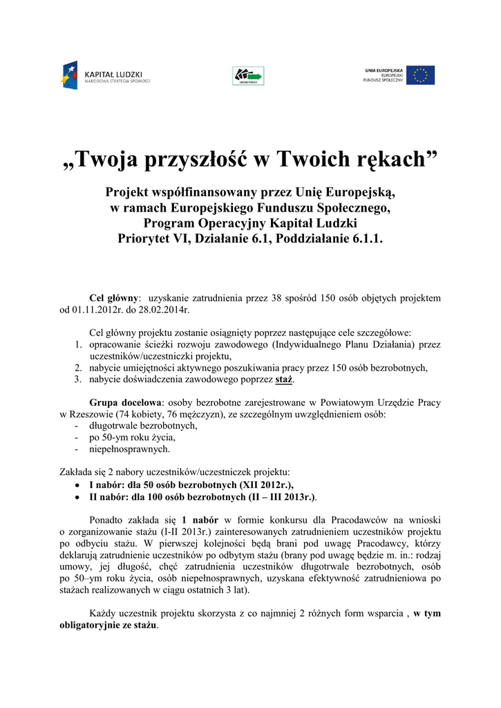 „Twoja przyszłość w Twoich rękach” Projekt współfinansowany przez Unię Europejską, w ramach Europejskiego Funduszu Społecznego, Program Operacyjny Kapitał Ludzki Priorytet VI, Działanie 6.1, Poddziałanie 6.1.1. Cel główny: uzyskanie zatrudnienia przez 38 spośród 150 osób objętych projektem od 01.11.2012r. do 28.02.2014r. Cel główny projektu zostanie osiągnięty poprzez następujące cele szczegółowe: 1. opracowanie ścieżki rozwoju zawodowego (Indywidualnego Planu Działania) przez uczestników/uczestniczki projektu, 2. nabycie umiejętności aktywnego poszukiwania pracy przez 150 osób bezrobotnych, 3. nabycie doświadczenia zawodowego poprzez staż. Grupa docelowa: osoby bezrobotne zarejestrowane w Powiatowym Urzędzie Pracy w Rzeszowie (74 kobiety, 76 mężczyzn), ze szczególnym uwzględnieniem osób: - długotrwale bezrobotnych, - po 50-ym roku życia, - niepełnosprawnych. Zakłada się 2 nabory uczestników/uczestniczek projektu: I nabór: dla 50 osób bezrobotnych (XII 2012r.), II nabór: dla 100 osób bezrobotnych (II – III 2013r.). Ponadto zakłada się 1 nabór w formie konkursu dla Pracodawców na wnioski o zorganizowanie stażu (I-II 2013r.) zainteresowanych zatrudnieniem uczestników projektu po odbyciu stażu. W pierwszej kolejności będą brani pod uwagę Pracodawcy, którzy deklarują zatrudnienie uczestników po odbytym stażu (brany pod uwagę będzie m. in.: rodzaj umowy, jej długość, chęć zatrudnienia uczestników długotrwale bezrobotnych, osób po 50–ym roku życia, osób niepełnosprawnych, uzyskana efektywność zatrudnieniowa po stażach realizowanych w ciągu ostatnich 3 lat). Każdy uczestnik projektu skorzysta z co najmniej 2 różnych form wsparcia , w tym obligatoryjnie ze stażu. Ponadto wszyscy uczestnicy/uczestniczki zostaną objęci usługą pośrednictwa pracy i poradnictwa zawodowego przez cały okres realizacji projektu. Poprzez indywidualny i bezpośredni kontakt z pośrednikami pracy i doradcami zawodowymi, osoby bezrobotne zostaną zaktywizowane w oparciu o posiadane przez nie kwalifikacje, oczekiwania i predyspozycje. Wszyscy uczestnicy projektu zostaną objęci Indywidualnym Planem Działania mającym na celu opracowanie ich ścieżki rozwoju zawodowego, a tym samym dopasowanie form wsparcia do ich potrzeb, oczekiwań i napotykanych barier, w celu doprowadzenia do podjęcia zatrudnienia. W zależności od zdiagnozowanych potrzeb uczestnicy/uczestniczki zostaną objęci: 3 tygodniowym szkolenia z aktywnego poszukiwania pracy dla 48 osób (24K, 24M), lub 4 dniowymi zajęciami aktywizacyjnymi dla 102 osób (50K, 52M.), oraz stażem wynoszącym maksymalnie 6 miesięcy (150 osób bezrobotnych). Dodatkowym wsparciem zaplanowanym dla uczestników/uczestniczek projektu „Twoja przyszłość w Twoich rękach” jest zwrot kosztów dojazdu (dla 70 osób z terenów wiejskich). Koszty te będą zwracane uczestnikom, których miejsce zamieszkania jest inne niż miejsce odbywania formy wsparcia. Ponadto dla 5 osób zaplanowano zwrot kosztów opieki nad dzieckiem do lat 7 lub osobą zależną w trakcie odbywania stażu. Termin realizacji projektu: 01.11. 2012 r. do 28.02.2014 r. Biuro projektu: Powiatowy Urząd Pracy w Rzeszowie – Centrum Aktywizacji Zawodowej, al. Batalionów Chłopskich 7, 35-038 Rzeszów Osoba do kontaktu: Grzegorz Ryba – koordynator projektu tel. 17 25 00 243