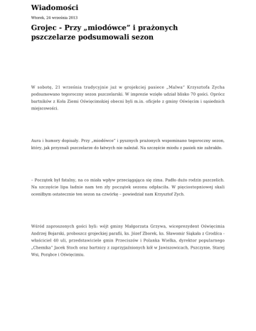 Wiadomości Wtorek, 24 września 2013 Grojec - Przy „miodówce” i prażonych pszczelarze podsumowali sezon W sobotę, 21 września tradycyjnie już w grojekciej pasiece „Malwa” Krzysztofa Zycha podsumowano tegoroczny sezon pszczelarski. W imprezie wzięło udział blisko 70 gości. Oprócz bartników z Koła Ziemi Oświęcimskiej obecni byli m.in. oficjele z gminy Oświęcim i sąsiednich miejscowości. Aura i humory dopisały. Przy „miodówce” i pysznych prażonych wspominano tegoroczny sezon, który, jak przyznali pszczelarze do łatwych nie należał. Na szczęście miodu z pasiek nie zabrakło. – Początek był fatalny, na co miała wpływ przeciągająca się zima. Padło dużo rodzin pszczelich. Na szczęście lipa ładnie nam ten zły początek sezonu odpłaciła. W pięciostopniowej skali oceniłbym ostatecznie ten sezon na czwórkę – powiedział nam Krzysztof Zych. Wśród zaproszonych gości byli: wójt gminy Małgorzata Grzywa, wiceprezydent Oświęcimia Andrzej Bojarski, proboszcz grojeckiej parafii, ks. Józef Zborek, ks. Sławomir Siąkała z Grodźca właściciel 40 uli, przedstawiciele gmin Przeciszów i Polanka Wielka, dyrektor popularnego „Chemika” Jacek Stoch oraz bartnicy z zaprzyjaźnionych kół w Jawiszowicach, Pszczynie, Starej Wsi, Porąbce i Oświęcimiu.