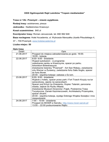 XXIX Ogólnopolski Rajd Leśników "Tropem niedźwiedzia" Trasa nr 12b: Przemyśl – miasto wyjątkowe. Rodzaj trasy: autokarowa, piesza Jednostka : Nadleśnictwo Krasiczyn Koszt uczestnictwa: 840 zł Koordynator trasy: Roman Januszczak, tel. 690 992 948 Baza noclegowa: Hotel Accademia, ul. Wybrzeże Marszałka Józefa Piłsudskiego 4, 37 – 700 Przemyśl, www.hotelaccademia.pl Liczba miejsc: 50 Opis trasy Dzień 21.06.2017 22.06.2017 23.06.2017 24.06.2017 Opis Przyjazd do miejsca zakwaterowania po godz. 16:00. 18:00 - kolacja. 8:00- 9:00 - śniadanie. Wyjazd autokarem - w programie: zwiedzanie zamku w Krasiczynie, spacer po parku. Arboretum Bolestraszyce. Zwiedzanie twierdzy "Przemyśl" - fort San Rideau, zwiedzanie ortu Werner w Żurawicy, zwiedzanie fortu Salis Soglio, spacer do fortu Borek. 20:00 - wspólna kolacja i zabawa z DJ-em. 8:00- 9:00 - śniadanie. Wyjście z hotelu, spacer przez park i Fort Trzech Krzyży na tor saneczkowy, zjazdy na saneczkach. Spacer pod Krzyż na Zniesieniu, Kopiec Tatarski, panorama miasta, zejście do Rynku Miasta. Zwiedzanie Muzeum Dzwonów i Fajek, Podziemna Trasa Turystyczna, Zamek Kazimierzowski, Archikatedry Przemyskie, spacer ulicami. 20:00 - wspólna kolacja, występ Dobrego Wojaka Szwejka i inne niespodzianki. 7:00 – 10:00 - śniadanie. Przyjazd do MOSiR w Sanoku. http://www.mosir-sanok.pl/ 13:00 – 22:00 podsumowanie Rajdu. Krasiczyn 12b: Przemyśl - miasto wyjątkowe https://drive.google.com/open?id=1uscbpgHUuTpCvz3in2O4dRH-Q_M&usp=sharing