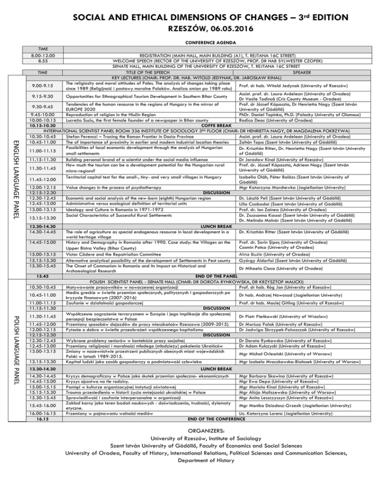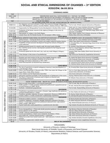 SOCIAL AND ETHICAL DIMENSIONS OF CHANGES – 3rd EDITION RZESZÓW, 06.05.2016 CONFERENCE AGENDA TIME 8.00-12.00 8.55 ENGLISH LANGUAGE PANEL POLISH LANGUAGE PANEL REGISTRATION (MAIN HALL, MAIN BUILDING (A1), T. REJTANA 16C STREET) WELCOME SPEECH (RECTOR OF THE UNIVERSITY OF RZESZÓW, PROF. DR HAB SYLWESTER CZOPEK) SENATE HALL, MAIN BUILDING OF THE UNIVERSITY OF RZESZÓW, T. REJTANA 16C STREET TIME TITLE OF THE SPEECH SPEAKER KEY LECTURES (CHAIR: PROF. DR. HAB. WITOLD JEDYNAK, DR. JAROSŁAW KINAL) The religiosity and moral attitudes of Poles. The analysis of changes taking place 9.00-9.15 Prof. dr hab. Witold Jedynak (University of Rzeszów) since 1989 (Religijność i postawy moralne Polaków. Analiza zmian po 1989 roku) Assist. prof. dr. Laura Ardelean (University of Oradea) 9.15-9.30 Opportunities for Ethnographical Tourism Development in Southern Bihor County Dr Vasile Todincă (Cris County Museum - Oradea) Tendencies of the human resource in the regions of Hungary in the mirror of Prof. dr József Káposzta, Dr Henrietta Nagy (Szent István 9.30-9.45 EUROPE 2020 University of Gödöllő) 9.45-10.00 Reproduction of religion in the Hlučín Region PhDr. Daniel Topinka, Ph.D. (Palacky University of Olomouc) 10.00-10.15 Lucreţia Suciu, the first female founder of a newspaper in Bihor county Rodica Deac (University of Oradea) 10.15-10.30 COFFE BREAK INTERNATIONAL SCIENTIST PANEL ROOM 336 INSTITUTE OF SOCIOLOGY 3RD FLOOR (CHAIR: DR HENRIETTA NAGY, DR MAGDALENA POKRZYWA) 10.30-10.45 Assist. prof. dr. Laura Ardelean (University of Oradea) Ștefan Ferenczi – Tracing the Roman Frontier in Dacia Province 10.45-11.00 The of importance of proximity in earlier and modern industrial location theories Zoltán Topa (Szent István University of Gödöllő) Possibilities of local economic development through the analysis of Hungarian Dr. Krisztián Ritter, Dr. Henrietta Nagy (Szent István University 11.00-11.15 small settlements of Gödöllő) 11.15-11.30 Building personal brand of a scientist under the social media influence Dr Jarosław Kinal (University of Rzeszów) How much the tourism can be a development potential for the Hungarian rural Prof. dr. József Káposzta, Adrienn Nagy (Szent István 11.30-11.45 University of Gödöllő) micro-regions? Territorial capital test for the small-, tiny- and very small villages in Hungary Izabella Oláh, Péter Balázs (Szent István University of 11.45-12.00 Gödöllő) 12.00-12.15 Value changes in the process of psychotherapy Mgr Katarzyna Marchewka (Jagiellonian University) 12.15-12.30 DISCUSSION 12.30-12.45 Economic and social analysis of the new-born (eighth) Hungarian region Dr. László Peli (Szent István University of Gödöllő) 12.45-13.00 Administrative versus ecological definition of territorial units Lilla Czabadai (Szent István University of Gödöllő) 13.00-13.15 Ideology and Culture in Romania in 1971-1972 Prof. dr. Ion Zainea (University of Oradea) Social Characteristics of Successful Rural Settlements Dr. Zsuzsanna Kassai (Szent István University of Gödöllő) 13.15-13.30 Dr. Melinda Molnár (Szent István University of Gödöllő) 13.30-14.30 LUNCH BREAK 14.30-14.45 The role of agriculture as special endogenous resource in local development in a Dr. Krisztián Ritter (Szent István University of Gödöllő) world heritage village 14.45-15.00 History and Demography in Romania after 1990. Case study: the Villages on the Prof. dr. Sorin Şipoş (University of Oradea) Cosmin Patca (University of Oradea) Upper Bistra Valley (Bihor County) 15.00-15.15 Victor Cădere and the Repatriation Committee Alina Buzle (University of Oradea) 15.15-15.30 Alternative analytical possibility of the development of Settlements in Pest county György Áldorfai (Szent István University of Gödöllő) 15.30-15.45 The Onset of Communism in Romania and Its Impact on Historical and Dr Mihaela Cioca (University of Oradea) Archaeological Research 15.45 END OF THE PANEL POLISH SCIENTIST PANEL - SENATE HALL (CHAIR: DR DOROTA RYNKOWSKA, DR KRZYSZTOF MALICKI) 10.30-10.45 Motywowanie pracowników w nowoczesnej organizacji Prof. dr hab. Róg Jan (University of Rzeszów) Media greckie w świetle przemian społecznych, politycznych i gospodarczych po 10.45-11.00 Dr hab. Andrzej Nowosad (Jagiellonian University) kryzysie finansowym (2007-2016) 11.00-11.15 Zaufanie w działalności gospodarczej Prof. dr hab. Maciej Gitling (University of Rzeszów) 11.15-11.30 DISCUSSION Współczesne zagrożenie terroryzmem w Europie i jego implikacje dla społecznej 11.30-11.45 Dr Piotr Pieńkowski (University of Wroclaw) percepcji bezpieczeństwa w Polsce 11.45-12.00 Przemiany sposobów dojazdów do pracy mieszkańców Rzeszowa (2009-2015). Dr Mariusz Palak (University of Rzeszów) 12.00-12.15 Pytanie o dobro w świetle przeobrażeń współczesnego kapitalizmu Dr Jadwiga Skrzypek-Faluszczak (University of Rzeszów) 12.15-12.30 DISCUSSION 12.30-12.45 Wybrane problemy seniorów w kontekście pracy socjalnej Dr Dorota Rynkowska (University of Rzeszów) 12.45-13.00 Przemiany religijności i moralności młodego (młodzieży) pokolenia Ukraińców Dr Adam Kulczycki (University of Rzeszów) 13.00-13.15 Zmiany w nazewnictwie przestrzeni publicznych obecnych miast wojewódzkich Mgr Michał Orleański (University of Warsaw) Polski w latach 1989-2015. 13.15-13.30 Kapitał ludzki jako zasób gospodarczy a podmiotowość człowieka Mgr Izabela Mroczkowska-Białasek (University of Warsaw) 13.30-14.30 14.30-14.45 14.45-15.00 15.00-15.15 15.15-15.30 15.30-15.45 15.45-16.00 16.00-16.15 16.15 LUNCH BREAK Kryzys demograficzny w Polsce jako skutek przemian społeczno- ekonomicznych Mgr Barbara Skawina (University of Rzeszów) Kryzys ojcostwa na tle rodziny. Mgr Ewa Depa (University of Rzeszów) Pamięć w kulturze organizacyjnej instytucji oświatowej Mgr Mariola Kinal (University of Rzeszów) Trauma przesiedlenia w historii życia mniejszości ukraińskiej w Polsce Mgr Alicja Maliszewska (University of 