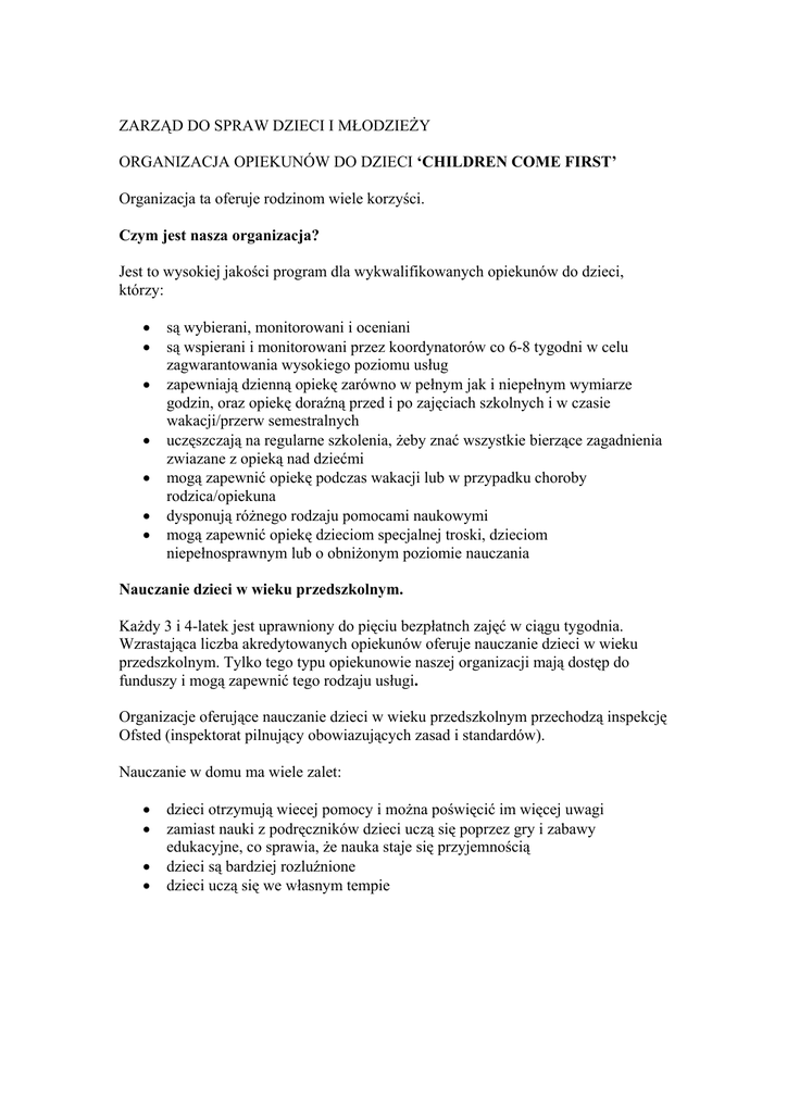 ZARZĄD DO SPRAW DZIECI I MŁODZIEŻY ORGANIZACJA OPIEKUNÓW DO DZIECI ‘CHILDREN COME FIRST’ Organizacja ta oferuje rodzinom wiele korzyści. Czym jest nasza organizacja? Jest to wysokiej jakości program dla wykwalifikowanych opiekunów do dzieci, którzy: • • • • • • • są wybierani, monitorowani i oceniani są wspierani i monitorowani przez koordynatorów co 6-8 tygodni w celu zagwarantowania wysokiego poziomu usług zapewniają dzienną opiekę zarówno w pełnym jak i niepełnym wymiarze godzin, oraz opiekę doraźną przed i po zajęciach szkolnych i w czasie wakacji/przerw semestralnych uczęszczają na regularne szkolenia, żeby znać wszystkie bierzące zagadnienia zwiazane z opieką nad dziećmi mogą zapewnić opiekę podczas wakacji lub w przypadku choroby rodzica/opiekuna dysponują różnego rodzaju pomocami naukowymi mogą zapewnić opiekę dzieciom specjalnej troski, dzieciom niepełnosprawnym lub o obniżonym poziomie nauczania Nauczanie dzieci w wieku przedszkolnym. Każdy 3 i 4-latek jest uprawniony do pięciu bezpłatnch zajęć w ciągu tygodnia. Wzrastająca liczba akredytowanych opiekunów oferuje nauczanie dzieci w wieku przedszkolnym. Tylko tego typu opiekunowie naszej organizacji mają dostęp do funduszy i mogą zapewnić tego rodzaju usługi. Organizacje oferujące nauczanie dzieci w wieku przedszkolnym przechodzą inspekcję Ofsted (inspektorat pilnujący obowiazujących zasad i standardów). Nauczanie w domu ma wiele zalet: • • • • dzieci otrzymują wiecej pomocy i można poświęcić im więcej uwagi zamiast nauki z podręczników dzieci uczą się poprzez gry i zabawy edukacyjne, co sprawia, że nauka staje się przyjemnością dzieci są bardziej rozluźnione dzieci uczą się we własnym tempie Rola koordynatora: • • • zapewnia on rodziców o jakości świadczonych usług; monitoruje opiekunów odwiedzając ich w domach w czasie zajęć z dziećmi, żeby ocenić ich wiedzę i umiejętności oraz upewnić się, że utrzymany jest wymagany poziom; oferuje poradę i wsparcie dla rodziców, którzy szukają opiekuna lub już korzystają z naszej organizacji ‘Children Come First’ STATUS JAKOŚCI STOWARZYSZENIA NCMA (National Childminding Association) Stowarzyszenie to wymaga, aby opiekunowie przestrzegali wymienionych poniżej zasad i zachowali wymagane standardy. Uderzenie dziecka oraz palenie papierosów są surowo wzbronione. 1. status opiekuna 2. nacisk na edukację i rozwój dziecka 3. współpraca z rodzicami 4. dobre zachowanie dzieci 5. równouprawnienie 6. poufnośc 7. bezpieczenstwo dziecka 8. dobre odżywianie 9. stabilizacja 10. zachowanie według obowiązujących zasad 11. wsparcie i współpraca KONTAKTY Więcej informacji otrzymać możesz od koordynatorów: Tewkesbury Sarah Spencer: tel. 01684 299763 kom. 07879 487 663 e-mail. [email protected] Forest of Dean Michelle Hutchesson: tel. 01594 825941 kom. 07766 440455 e-mail [email protected] Stroud Julie Ridley: tel. 01453 792151 kom. 07879 487 664 e-mail [email protected] Cotswolds Karen Cairns: tel. 01608 812496 kom. 07795 301 742 e-mail [email protected] Cheltenham Elaine Warner: tel. 01242 268994 kom. 07795 665 863 e-mail [email protected] Gloucester Kay Jones: tel. 01452 312338 kom. 07917 277844 e-mail [email protected]