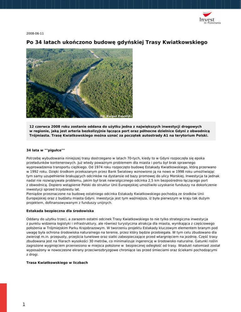 2008-06-11 Po 34 latach ukończono budowę gdyńskiej Trasy Kwiatkowskiego 12 czerwca 2008 roku zostanie oddana do użytku jedna z największych inwestycji drogowych w regionie, jaką jest arteria bezkolizyjnie łącząca port oraz północne dzielnice Gdyni z obwodnicą Trójmiasta. Trasę Kwiatkowskiego można uznać za początek autostrady A1 na terytorium Polski. 34 lata w ""pigułce"" Potrzebę wybudowania niniejszej trasy dostrzegano w latach 70-tych, kiedy to w Gdyni rozpoczęła się epoka przeładunków kontenerowych. Już wtedy poważnym problemem dla miasta i portu był brak sprawnego wyprowadzenia transportu ciężkiego. Od 1974 roku rozpoczęto budowę Estakady Kwiatkowskiego, którą przerwano w 1992 roku. Dzięki środkom przekazanym przez Bank Światowy wznowiono ją na nowo w 1998 roku umożliwiając tym samy uzupełnienie brakujących odcinków na dystansie od bazy promowej do ulicy Morskiej. Inwestycja ta jednak nadal nie rozwiązywała problemu, jakim był brak newralgicznego odcinka 2,5 km bezpośrednio łączącego port z obwodnicą. Dopiero wstąpienie Polski do struktur Unii Europejskiej umożliwiło uzyskanie funduszy na dokończenie inwestycji sprzed trzydziestu lat. Pieniądze przeznaczone na budowę ostatniego odcinka Estakady Kwiatkowskiego pochodzą ze środków Unii Europejskiej oraz z budżetu miasta Gdyni. Inwestycja jest tym ważniejsza, iż była pierwszym w kraju tak dużym projektem, dofinansowywanym z funduszy unijnych. Estakada bezpieczna dla środowiska Oddany do użytku trzeci, a zarazem ostatni odcinek Trasy Kwiatkowskiego to nie tylko strategiczna inwestycja z punktu widzenia logistyki i infrastruktury, ale również turystyczna atrakcja dla miasta, wynikająca z częściowego położenia w Trójmiejskim Parku Krajobrazowym. W tworzeniu projektu Estakady kluczowym elementem branym pod uwagę była ochrona środowiska naturalnego na terenie, przez który będzie przebiegała. W tym celu zbudowano dla zwierząt m.in. przepusty, przejścia tunelowe oraz siatki zabezpieczające przed wtargnięciem na jezdnię. Część trasy zbudowana jest na filarach wysokości 30 metrów, co minimalizuje ingerencję w środowisko naturalne. Gatunki roślin zagrożone wyginięciem przeniesiono w miejsca położone w bezpiecznej odległość od trasy. Wiadukt natomiast został wyposażony w nowoczesne ekrany przeciwrozbryzgowe chroniące las przed śmieciami oraz ściekami pochodzącymi z drogi. Trasa Kwiatkowskiego w liczbach 1 Jak przewidują eksperci, pełne otwarcie Trasy Kwiatkowskiego już w przeciągu roku zmniejszy o 4,4 % ilość stłuczek oraz wypadków na terenie Gdyni. Tranzyt transportu ciężkiego generowanego, przez port zmniejszy się o 80%. Nastąpi poprawa płynności ruchu na odcinku terminalu BTC w Porcie Gdynia do Trójmiejskiej Obwodnicy. Czas na pokonanie tego dystansu zmniejszy się o 55%. Dzięki Estakadzie o 16% szybciej będzie można dojechać z portu do autostrady A1. Źródło: Materiały prasowe opracowane przez Urząd Miasta Gdyni Autor MW 2