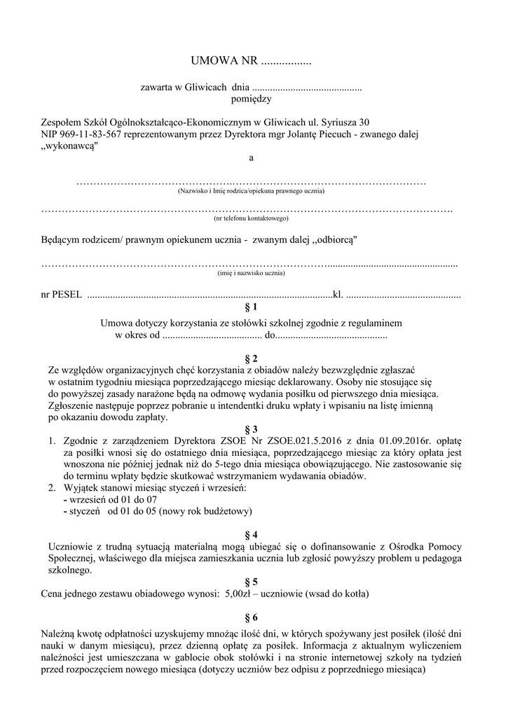 UMOWA NR ................. zawarta w Gliwicach dnia ........................................... pomiędzy Zespołem Szkół Ogólnokształcąco-Ekonomicznym w Gliwicach ul. Syriusza 30 NIP 969-11-83-567 reprezentowanym przez Dyrektora mgr Jolantę Piecuch - zwanego dalej „wykonawcą'' a ……………………………………….………………………………………………… (Nazwisko i Imię rodzica/opiekuna prawnego ucznia) …………………………………………………………………………………………………………. (nr telefonu kontaktowego) Będącym rodzicem/ prawnym opiekunem ucznia - zwanym dalej ,,odbiorcą'' …………………………………………………………………………................................................... (imię i nazwisko ucznia) nr PESEL ................................................................................................kl. ............................................. §1 Umowa dotyczy korzystania ze stołówki szkolnej zgodnie z regulaminem w okres od ....................................... do............................................ §2 Ze względów organizacyjnych chęć korzystania z obiadów należy bezwzględnie zgłaszać w ostatnim tygodniu miesiąca poprzedzającego miesiąc deklarowany. Osoby nie stosujące się do powyższej zasady narażone będą na odmowę wydania posiłku od pierwszego dnia miesiąca. Zgłoszenie następuje poprzez pobranie u intendentki druku wpłaty i wpisaniu na listę imienną po okazaniu dowodu zapłaty. §3 1. Zgodnie z zarządzeniem Dyrektora ZSOE Nr ZSOE.021.5.2016 z dnia 01.09.2016r. opłatę za posiłki wnosi się do ostatniego dnia miesiąca, poprzedzającego miesiąc za który opłata jest wnoszona nie później jednak niż do 5-tego dnia miesiąca obowiązującego. Nie zastosowanie się do terminu wpłaty będzie skutkować wstrzymaniem wydawania obiadów. 2. Wyjątek stanowi miesiąc styczeń i wrzesień: - wrzesień od 01 do 07 - styczeń od 01 do 05 (nowy rok budżetowy) §4 Uczniowie z trudną sytuacją materialną mogą ubiegać się o dofinansowanie z Ośrodka Pomocy Społecznej, właściwego dla miejsca zamieszkania ucznia lub zgłosić powyższy problem u pedagoga szkolnego. §5 Cena jednego zestawu obiadowego wynosi: 5,00zł – uczniowie (wsad do kotła) §6 Należną kwotę odpłatności uzyskujemy mnożąc ilość dni, w których spożywany jest posiłek (ilość dni nauki w danym miesiącu), przez dzienną opłatę za posiłek. Informacja z aktualnym wyliczeniem należności jest umieszczana w gablocie obok stołówki i na stronie internetowej szkoły na tydzień przed rozpoczęciem nowego miesiąca (dotyczy uczniów bez odpisu z poprzedniego miesiąca) §7 Należność, zgodną z wyliczeniem za dany okres, wpłaca się: 1. Przelewem na konto bankowe szkoły w: ING Bank Śląski o/Gliwice nr konta 74 1050 1298 1000 0002 0352 4012 2. Wpłatą na konto za pośrednictwem punktów pobierających opłaty: poczta, sklep, oddziały banków (w ING Bank Śląski bez prowizji). 3. Na dowodzie wpłaty konieczne jest podanie imienia i nazwiska ucznia korzystającego z obiadów (nie rodzica lub opiekuna), klasy do której uczęszcza, oraz miesiąc za jaki posiłki są opłacane. §8 Podstawę do wydania obiadu stanowi okazanie potwierdzenia dokonania wpłaty lub przesłanie go elektronicznie do intendentki ([email protected] ). §9 Korzystający z obiadów mają prawo do odpisu za niewykorzystane obiady, pod warunkiem zgłoszenia tego faktu u intendentki przed nastąpieniem absencji. Odpisu dokonuje się od dnia następnego po zgłoszeniu, jeżeli zgłoszenie nastąpi do godziny 10:00. Jeśli zgłoszenie zostanie dokonane po godz. 10:00 odliczenie następuje po 2 dniach. Zgłoszenia można dokonać osobiście, telefonicznie (032/234-41-13 wew. 112), e-mailem na adres: [email protected], lub w sekretariacie szkoły. Kwotę odpisu pomniejsza się o wpłatę za następny miesiąc nie jest zwracana w formie gotówki. Nierozliczona nadpłata będzie przekazana na wskazany rachunek bankowy po zakończeniu roku szkolnego. Ewentualną nadpłatę proszę przekazać na rachunek bankowy nr………………………………………………………………………………………………... (nr rachunku bankowego rodzica/ opiekuna prawnego ucznia) § 10 Osobą upoważnioną przez dyrektora ZSOE do wyjaśniania kwestii spornych jest starszy intendent urzędujący na terenie stołówki szkolnej w godzinach pracy Poniedziałek – nie pracuje Wtorek - od 07:00 do 15:00 Środa - od 07:00 do 15:00 Czwartek - od 07:00 do 11:00 Piątek - nie pracuje Harmonogram pracy może ulec zmianie § 11 Prosimy rodziców o uczulenie uczniów na stosowne zachowywanie się na stołówce szkolnej podczas posiłku. Osoby niestosownie zachowujące się na stołówce szkolnej nie będą mogły korzystać z obiadów do końca roku. § 12 Umowę sporządzono w dwóch jednobrzmiących egzemplarzach, po jednym dla każdej ze stron. ........................................ rodzic/opiekun prawny 1. 2. ….................................... dyrektor ZSOE Oświadczam, że zgodnie z Ustawą o ochronie danych osobowych z dnia 29 sierpnia 1997r. (Dz.U. z 2002r. nr 101, poz.926 z późń. zm.) wyrażam/y zgodę na wykorzystywanie moich/naszych i dziecka danych osobowych na potrzeby związane z działalnością szkoły. Oświadczam, że zapoznałem się z zasadami odpłatności i pełną treścią regulaminu korzystania z obiadów, akceptuję i zobowiązuję się je przestrzegać. ……….…..…..……………………………. Podpis rodziców/opiekunów lub odbiorcy