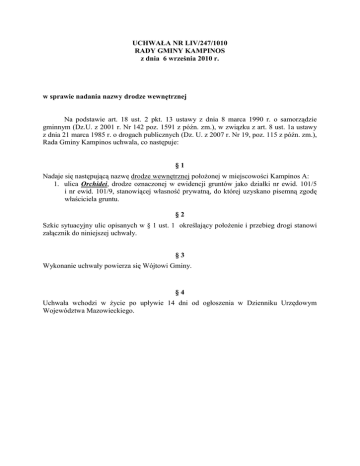 UCHWAŁA NR LIV/247/1010 RADY GMINY KAMPINOS z dnia 6 września 2010 r. w sprawie nadania nazwy drodze wewnętrznej Na podstawie art. 18 ust. 2 pkt. 13 ustawy z dnia 8 marca 1990 r. o samorządzie gminnym (Dz.U. z 2001 r. Nr 142 poz. 1591 z późn. zm.), w związku z art. 8 ust. 1a ustawy z dnia 21 marca 1985 r. o drogach publicznych (Dz. U. z 2007 r. Nr 19, poz. 115 z późn. zm.), Rada Gminy Kampinos uchwala, co następuje: §1 Nadaje się następującą nazwę drodze wewnętrznej położonej w miejscowości Kampinos A: 1. ulica Orchidei, drodze oznaczonej w ewidencji gruntów jako działki nr ewid. 101/5 i nr ewid. 101/9, stanowiącej własność prywatną, do której uzyskano pisemną zgodę właściciela gruntu. §2 Szkic sytuacyjny ulic opisanych w § 1 ust. 1 określający położenie i przebieg drogi stanowi załącznik do niniejszej uchwały. §3 Wykonanie uchwały powierza się Wójtowi Gminy. §4 Uchwała wchodzi w życie po upływie 14 dni od ogłoszenia w Dzienniku Urzędowym Województwa Mazowieckiego. Uzasadnienie Obowiązująca od dnia 10 października 2005 r. nowelizacja ustawy o samorządzie gminnym oraz o drogach publicznych opublikowana w (Dz. U. z 2005 r. Nr 172, poz. 1441) uposażyła rady gmin w uprawnienia do nadawania nazw ulic i placów, które są drogami publicznymi lub nazw dróg wewnętrznych w rozumieniu przepisów ustawy z dnia 21 marca 1985 r. o drogach publicznych (Dz. U. z 2004 r. Nr 204, poz. 2086 z późn. zm.). Drogami wewnętrznymi w rozumieniu ustawy o drogach publicznych są drogi nie zaliczone do żadnej kategorii dróg publicznych w szczególności drogi w osiedlach mieszkaniowych, dojazdowe do gruntów rolnych i leśnych, dojazdowe do obiektów użytkowanych przez przedsiębiorców, place przed dworcami kolejowymi, autobusowymi i portami oraz pętle autobusowe. Nowela ustawy o drogach publicznych wymaga też aby przed podjęciem przez radę gminy uchwały w sprawie nadania nazwy drogom wewnętrznym uzyskać pisemną zgodę właścicieli terenów, na których zlokalizowana jest droga wewnętrzna. Dla nieruchomości objętych niniejszą uchwałą stanowiących drogę wewnętrzną wymagane zgody właścicieli uzyskano (wniosek o nadanie nazwy). Nadanie proponowanej nazwy rozwiąże ponadto praktyczny problem z adresami domów stojących przy tej drodze. Nadawanie nazw ulic w gminie Kampinos w poszczególnych miejscowościach odbywa się tematycznie. Ponieważ w miejscowości Kampinos A tematem przewodnim nazewnictwa dróg gminnych są kwiaty proponowana nazwa właścicieli jest więc zgodna z tą tematyką. Powołując się na art.18 ust. 2 pkt. 13 ustawy o samorządzie gminnym oraz art. 8 ust. 1 a ustawy o drogach publicznych podjecie niniejszej uchwały jest zasadne. Podjecie niniejszej uchwały przedkłada Wójt Gminy Kampinos.