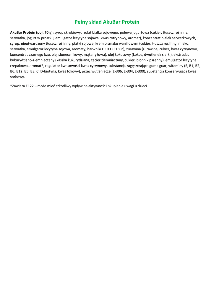 Pełny skład AkuBar Protein AkuBar Protein (poj. 70 g): syrop skrobiowy, izolat białka sojowego, polewa jogurtowa (cukier, tłuszcz roślinny, serwatka, jogurt w proszku, emulgator lecytyna sojowa, kwas cytrynowy, aromat), koncentrat białek serwatkowych, syrop, nieutwardzony tłuszcz roślinny, płatki sojowe, krem o smaku waniliowym (cukier, tłuszcz roślinny, mleko, serwatka, emulgator lecytyna sojowa, aromaty, barwniki E 100 i E160c), żurawina (żurawina, cukier, kwas cytrynowy, koncentrat czarnego bzu, olej słonecznikowy, mąka ryżowa), olej kokosowy (kokos, dwutlenek siarki), ekstrudat kukurydziano-ziemniaczany (kaszka kukurydziana, zacier ziemniaczany, cukier, błonnik pszenny), emulgator lecytyna rzepakowa, aromat*, regulator kwasowości kwas cytrynowy, substancja zagęszczająca guma guar, witaminy (E, B1, B2, B6, B12, B5, B3, C, D-biotyna, kwas foliowy), przeciwutleniacze (E-306, E-304, E-300), substancja konserwująca kwas sorbowy. *Zawiera E122 – może mieć szkodliwy wpływ na aktywność i skupienie uwagi u dzieci.
