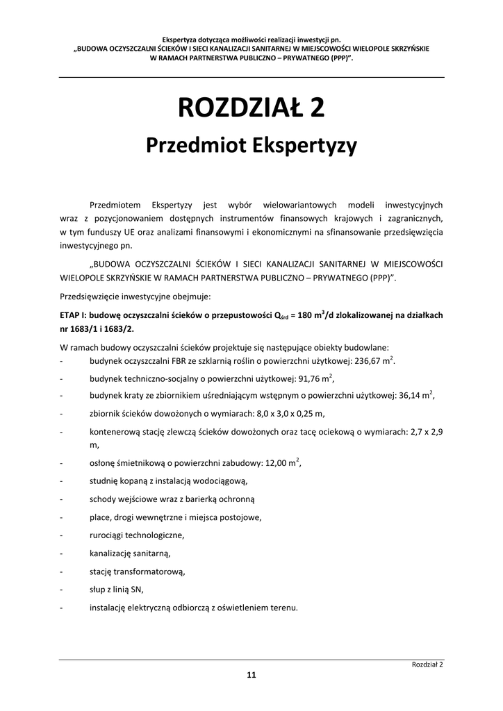 Ekspertyza dotycząca możliwości realizacji inwestycji pn. „BUDOWA OCZYSZCZALNI ŚCIEKÓW I SIECI KANALIZACJI SANITARNEJ W MIEJSCOWOŚCI WIELOPOLE SKRZYŃSKIE W RAMACH PARTNERSTWA PUBLICZNO – PRYWATNEGO (PPP)”. ROZDZIAŁ 2 Przedmiot Ekspertyzy Przedmiotem Ekspertyzy jest wybór wielowariantowych modeli inwestycyjnych wraz z pozycjonowaniem dostępnych instrumentów finansowych krajowych i zagranicznych, w tym funduszy UE oraz analizami finansowymi i ekonomicznymi na sfinansowanie przedsięwzięcia inwestycyjnego pn. „BUDOWA OCZYSZCZALNI ŚCIEKÓW I SIECI KANALIZACJI SANITARNEJ W MIEJSCOWOŚCI WIELOPOLE SKRZYŃSKIE W RAMACH PARTNERSTWA PUBLICZNO – PRYWATNEGO (PPP)”. Przedsięwzięcie inwestycyjne obejmuje: ETAP I: budowę oczyszczalni ścieków o przepustowości Qśrd = 180 m3/d zlokalizowanej na działkach nr 1683/1 i 1683/2. W ramach budowy oczyszczalni ścieków projektuje się następujące obiekty budowlane: budynek oczyszczalni FBR ze szklarnią roślin o powierzchni użytkowej: 236,67 m2. - budynek techniczno-socjalny o powierzchni użytkowej: 91,76 m2, - budynek kraty ze zbiornikiem uśredniającym wstępnym o powierzchni użytkowej: 36,14 m2, - zbiornik ścieków dowożonych o wymiarach: 8,0 x 3,0 x 0,25 m, - kontenerową stację zlewczą ścieków dowożonych oraz tacę ociekową o wymiarach: 2,7 x 2,9 m, - osłonę śmietnikową o powierzchni zabudowy: 12,00 m2, - studnię kopaną z instalacją wodociągową, - schody wejściowe wraz z barierką ochronną - place, drogi wewnętrzne i miejsca postojowe, - rurociągi technologiczne, - kanalizację sanitarną, - stację transformatorową, - słup z linią SN, - instalację elektryczną odbiorczą z oświetleniem terenu. Rozdział 2 11 Ekspertyza dotycząca możliwości realizacji inwestycji pn. „BUDOWA OCZYSZCZALNI ŚCIEKÓW I SIECI KANALIZACJI SANITARNEJ W MIEJSCOWOŚCI WIELOPOLE SKRZYŃSKIE W RAMACH PARTNERSTWA PUBLICZNO – PRYWATNEGO (PPP)”. Bilans terenu działki wg stanu projektowego: - powierzchnia działki 3 492 m2 - powierzchnia terenów zieleni 2 393,83 m2 - powierzchnia zabudowy budynkami i obiektami- 304,85 m2 - powierzchnia dróg i placów 793,32 m2 - powierzchnia odprowadzenia wód opadowych - (rozprowadzenie powierzchniowe wód czystych) 1 098,17 m2 procent powierzchni biologicznie czynnej 68,55>30% ETAP II: budowa sieci kanalizacji sanitarnej o długości 2800 m z podłączeniem do 150 gospodarstw domowych. ETAP III: budowa sieci kanalizacji sanitarnej o długości 11 000 m z podłączeniami do 250 gospodarstw domowych. Łącznie szacunkowy budżet inwestycji wynosi: 10 254 065.00 zł (netto). Lokalizacja inwestycji: Wielopole Skrzyńskie, gmina Wielopole Skrzyńskie, powiat ropczycko - sędziszowski, województwo Podkarpackie. W ramach Ekspertyzy do realizacji tego przedsięwzięcia inwestycyjnego wypracowane zostały 4 MODELE FINANSOWE: Przedmiot inwestycji: MODEL FINANSOWY I „Budowa oczyszczalni ścieków i sieci kanalizacji sanitarnej w miejscowości Wielopole Skrzyńskie” z uwzględnieniem PPP Termin realizacji: II kwartał 2014 – II kwartał 2016 FINANSOWANIE PROJEKTU Partnerstwo Publiczno -Prywatne PPP zaprojektuj, buduj, finansuj, udostępniaj, operatorowi DBFOT – Referat Urzędu Gminy (Design-Build-Finance-OperateTransfer) –realizowane przez Inwestora Prywatnego 100% BUDŻET INWESTYCJI 100% 10 254 065,00 PLN /netto/ Rozdział 2 12 Ekspertyza dotycząca możliwości realizacji inwestycji pn. „BUDOWA OCZYSZCZALNI ŚCIEKÓW I SIECI KANALIZACJI SANITARNEJ W MIEJSCOWOŚCI WIELOPOLE SKRZYŃSKIE W RAMACH PARTNERSTWA PUBLICZNO – PRYWATNEGO (PPP)”. ŹRÓDŁO SPŁATY Operator: Referat Urzędu Gminy Wielopole Skrzyńskie Operatorem jest Referat Urzędu Gminy Wielopole Skrzyńskie, który z uzyskanych przychodów i rocznych dotacji z budżetu gminy spłaca Inwestorowi Prywatnemu zainwestowane środki. OKRES SPŁATY WARIANT I WARIANT II WARIANT III 15 lat 20 lat 25 lat Przedmiot inwestycji: MODEL FINANSOWY II „Budowa oczyszczalni ścieków i sieci kanalizacji sanitarnej w miejscowości Wielopole Skrzyńskie” z uwzględnieniem PPP Termin realizacji: II kwartał 2014 – II kwartał 2016 FINANSOWANIE PROJEKTU Partnerstwo Publiczno -Prywatne PPP zaprojektuj, buduj, finansuj, udostępniaj, operatorowi DBFOT – spółka komunalna (Design-Build-Finance-Operate-Transfer) –realizowane przez Inwestora Prywatnego 100% BUDŻET INWESTYCJI 100% 10 254 065,00 PLN /netto/ ŹRÓDŁO SPŁATY Operator: Spółka komunalna Operatorem jest Spółka Komunalna powołana przez Gminę Wielopole Skrzyńskie, która z uzyskanych przychodów i rocznych dotacji z budżetu gminy spłaca Inwestorowi Prywatnemu zainwestowane środki. OKRES SPŁATY WARIANT I WARIANT II WARIANT III 15 lat 20 lat 25 lat Przedmiot inwestycji: MODEL FINANSOWY III „Budowa oczyszczalni ścieków i sieci kanalizacji sanitarnej w miejscowości Wielopole Skrzyńskie” z uwzględnieniem PPP Rozdział 2 13 Ekspertyza dotycząca możliwości realizacji inwestycji pn. „BUDOWA OCZYSZCZALNI ŚCIEKÓW I SIECI KANALIZACJI SANITARNEJ W MIEJSCOWOŚCI WIELOPOLE SKRZYŃSKIE W RAMACH PARTNERSTWA PUBLICZNO – PRYWATNEGO (PPP)”. Termin realizacji: II kwartał 2014 – II kwartał 2016 FINANSOWANIE PROJEKTU Emisja obligacji komunalnych 100% BUDŻET INWESTYCJI 100% 10 254 065,00 PLN /netto/ - III ETAPY 8 896 836,00 PLN /netto/ - II ETAPY Uwaga! W tym MODELU FINANSOWYM został wyłączony ETAP II - BUDOWA SIECI KANALIZACJI SANITARNEJ 2800m, ze względu na otrzymanie dotacji i charakter wykupu obligacji. 1. Powołanie przez Gminę Wielopole Skrzyńskie spółki komunalnej, która będzie zarządzała projektem. 2. Emisja przez spółkę komunalną obligacji komunalnych 15, 20 lub 25 -letnich z oprocentowaniem stałym wynoszącym 5,5% w ofercie prywatnej do 99 Partnerów. 3. Z uzyskanych środków finansowych ze sprzedaży obligacji spółka komunalna realizuje inwestycję pn. „Budowa oczyszczalni ścieków i sieci kanalizacji sanitarnej w miejsc