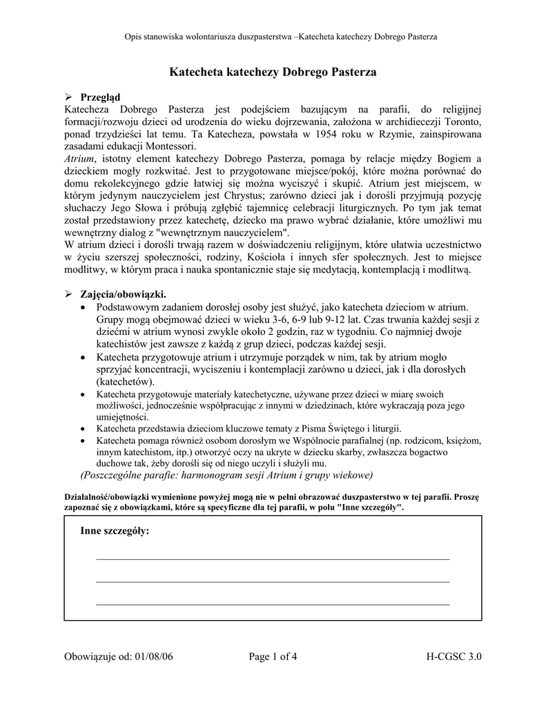 Opis stanowiska wolontariusza duszpasterstwa –Katecheta katechezy Dobrego Pasterza Katecheta katechezy Dobrego Pasterza Przegląd Katecheza Dobrego Pasterza jest podejściem bazującym na parafii, do religijnej formacji/rozwoju dzieci od urodzenia do wieku dojrzewania, założona w archidiecezji Toronto, ponad trzydzieści lat temu. Ta Katecheza, powstała w 1954 roku w Rzymie, zainspirowana zasadami edukacji Montessori. Atrium, istotny element katechezy Dobrego Pasterza, pomaga by relacje między Bogiem a dzieckiem mogły rozkwitać. Jest to przygotowane miejsce/pokój, które można porównać do domu rekolekcyjnego gdzie łatwiej się można wyciszyć i skupić. Atrium jest miejscem, w którym jedynym nauczycielem jest Chrystus; zarówno dzieci jak i dorośli przyjmują pozycję słuchaczy Jego Słowa i próbują zgłębić tajemnicę celebracji liturgicznych. Po tym jak temat został przedstawiony przez katechetę, dziecko ma prawo wybrać działanie, które umożliwi mu wewnętrzny dialog z "wewnętrznym nauczycielem". W atrium dzieci i dorośli trwają razem w doświadczeniu religijnym, które ułatwia uczestnictwo w życiu szerszej społeczności, rodziny, Kościoła i innych sfer społecznych. Jest to miejsce modlitwy, w którym praca i nauka spontanicznie staje się medytacją, kontemplacją i modlitwą. Zajęcia/obowiązki. Podstawowym zadaniem dorosłej osoby jest służyć, jako katecheta dzieciom w atrium. Grupy mogą obejmować dzieci w wieku 3-6, 6-9 lub 9-12 lat. Czas trwania każdej sesji z dziećmi w atrium wynosi zwykle około 2 godzin, raz w tygodniu. Co najmniej dwoje katechistów jest zawsze z każdą z grup dzieci, podczas każdej sesji. Katecheta przygotowuje atrium i utrzymuje porządek w nim, tak by atrium mogło sprzyjać koncentracji, wyciszeniu i kontemplacji zarówno u dzieci, jak i dla dorosłych (katechetów). Katecheta przygotowuje materiały katechetyczne, używane przez dzieci w miarę swoich możliwości, jednocześnie współpracując z innymi w dziedzinach, które wykraczają poza jego umiejętności. Katecheta przedstawia dzieciom kluczowe tematy z Pisma Świętego i liturgii. Katecheta pomaga również osobom dorosłym we Wspólnocie parafialnej (np. rodzicom, księżom, innym katechistom, itp.) otworzyć oczy na ukryte w dziecku skarby, zwłaszcza bogactwo duchowe tak, żeby dorośli się od niego uczyli i służyli mu. (Poszczególne parafie: harmonogram sesji Atrium i grupy wiekowe) Działalność/obowiązki wymienione powyżej mogą nie w pełni obrazować duszpasterstwo w tej parafii. Proszę zapoznać się z obowiązkami, które są specyficzne dla tej parafii, w polu "Inne szczegóły". Inne szczegóły: ________________________________________________________________________ ________________________________________________________________________ ________________________________________________________________________ Obowiązuje od: 01/08/06 Page 1 of 4 H-CGSC 3.0 Opis stanowiska wolontariusza duszpasterstwa –Katecheta katechezy Dobrego Pasterza Umiejętności, doświadczenie i kwalifikacje Jest członkiem w pełni zainicjowanym w Kościele katolickim, zgodnie z wymogami. Musi mieć, co najmniej 18 lat. Jest znana w parafii, jako osoba o dobrej reputacji. Katecheta jest chętny i zdolny do obserwacji i badania niezbędnych potrzeb dziecka i ich przejawy na różnych etapach rozwoju dziecka. Dziecko, szczególnie religijne życie dziecka, leży w centrum zainteresowania i zaangażowania katechety katechezy Dobrego Pasterza. Katecheta i dziecko przeżywają wspólnie doświadczenia religijne według nauczania Ewangelii: “Jeśli się nie odmienicie i nie staniecie jak dzieci, nie wejdziecie do królestwa niebieskiego" (Mateusz 18:3) Katecheta ma stale chęć by zagłębiać się w chrześcijańskie przesłanie poprzez znajomość źródeł biblijnych i liturgicznych i bieżącej żywej tradycji Kościoła, w tym teologiczne, społeczne i ekumeniczny ruchy, które ożywiają dziś Kościół. Katecheta jest zdolny do pracy z osobami dorosłymi, w różnych sytuacjach, w sposób dojrzały, przyjazny i otwarty na współpracę. Katecheta ma możliwości i chęci poświęcić wymaganą ilość czasu. W nagłych przypadkach wie, z kim się kontaktować i/lub zna procedury. Osobiste cechy i zalety Katecheta jest w stanie współpracować z innymi katechistami w duchu jedności i harmonii, w zgodzie z planem Boga do komunii w historii zbawienia i zgodnie z duchem jedności, tak silnie wyrażonym w przypowieści o Dobrym Pasterzu (Jan 10:1ff ). Oferuje hojnie swoje talenta i doświadczenie dla dobra wszystkich. (22) Ta ścisła współpraca ukazana jest na wielu poziomach Wspólnoty w ramach katechezy Dobrego Pasterza. Katecheta ma głębokie poczucie duchowości i ciągłe pragnienie pogłębiania i karmienia życia wiary. Postawa dorosłych ma być naznaczona pokorą przed możliwościami dziecka, ustanawiając właściwe relacje z dzieckiem, to znaczy, w poszanowaniu osobowości dziecka i czekając aż dziecko samo się otworzy. Nie ma problemu z byciem rozliczanym oraz przestrzega właściwych granic. Orientacja i szkolenia Standardowy program orientacji parafii. Katecheta brał udział w, i spełnił wszystkie wymagania poziomu I: Kurs podstawy; Dzieci wieku od narodzin - 6 lat, części katechezy, świadectwo ukończenia programu Dobry Pasterz, oferowanego wspólnie przez Biuro Dobry Pasterz /Archidiecezję Toronto i dział kształcenia ustawicznego Uniwersytetu Św. Michała (st.Michael's College). Przed pracą w atrium ze starszymi dziećmi wymagane jest ukończenie II poziomu: dzieci w wieku 6-9 i poziom III: dzieci w wieku 9-12. Katecheta osobiście przygotował kompleksową i ciągle rozwijającą się kolekcję (album ) materiałów do prezentacji dzieciom. Katecheta osobiście przygotował kompleksową i ciągle rozwijającą się, kolekcję źródeł teologicznych do prezentacji. Katecheta osobiście przygotował kompleksową i ci