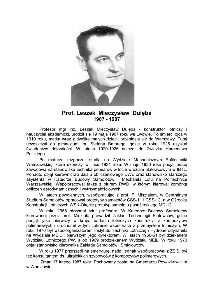 Prof. Leszek Mieczysław Dulęba 1907 - 1987 Profesor mgr inż. Leszek Mieczysław Dulęba - konstruktor lotniczy i nauczyciel akademicki, urodził się 19 maja 1907 roku we Lwowie. Po śmierci ojca w 1910 roku, matka wraz z dwójka małych dzieci, przeniosła się do Warszawy. Tutaj uczęszczał do gimnazjum im. Stefana Batorego, gdzie w roku 1925 uzyskał świadectwo dojrzałości. W latach 1920-1926 należał do Związku Harcerstwa Polskiego. Po maturze rozpoczął studia na Wydziale Mechanicznym Politechniki Warszawskiej, które ukończył w lipcu 1931 roku. W maju 1930 roku podjął pracę zawodową na stanowisku technika pomiarów w locie w dziale płatowcowym w IBTL. Ponadto objął kierownictwo działu obliczeniowego DWL oraz stanowisko starszego asystenta w Katedrze Budowy Samolotów i Mechaniki Lotu na Politechnice Warszawskiej. Współpracował także z biurem RWD, w którym kierował komórką obliczeń aerodynamicznych i wytrzymałościowych. W latach powojennych, współpracując z prof. F. Misztalem, w Centralnym Studium Samolotów opracował prototypy samolotów CSS-11 i CSS-12, a w Ośrodku Konstrukcji Lotniczych WSK-Okęcie prototyp samolotu pasażerskiego MD-12. W roku 1958 otrzymał tytuł profesora. W Katedrze Budowy Samolotów kierowanej przez prof. Misztala prowadził Zakład Technologii Płatowców, gdzie podjął, jako pierwszy w kraju, badania lotniczych konstrukcji z kompozytów polimerowych i uruchomił w tym zakresie współpracę z przemysłem lotniczym. W roku 1970 był współorganizatorem Instytutu Techniki Lotniczej i Hydroaerodynamiki na Wydziale MEiL i pierwszym jego dyrektorem. W latach 1960-61 był dziekanem Wydziału Lotniczego PW, a od 1969 prodziekanem Wydziału MEiL. W roku 1970 objął stanowisko kierownika Zakładu Samolotów i Śmigłowców. W roku 1977 przeszedł na emeryturę, nadal jednak współpracował z ZSiŚ, był też konsultantem ds. ultralekkich szybowców z kompozytów polimerowych. Zmarł 17 lutego 1987 roku. Pochowany został na Cmentarzu Powązkowskim w Warszawie.
