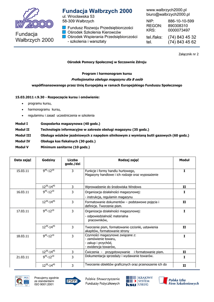 Fundacja Wałbrzych 2000 ul. Wrocławska 53 58-309 Wałbrzych Fundusz Rozwoju Przedsiębiorczości Ośrodek Szkolenia Kierowców Ośrodek Wspierania Przedsiębiorczości - szkolenia i warsztaty www.walbrzych2000.pl [email protected] NIP: REGON: KRS: 886-10-10-599 890308310 0000073497 tel./faks: tel. (74) 843 45 32 (74) 843 45 62 Załącznik nr 2 Ośrodek Pomocy Społecznej w Szczawnie Zdroju Program i harmonogram kursu Profesjonalna obsługa magazynu dla 8 osób współfinansowanego przez Unię Europejską w ramach Europejskiego Funduszu Społecznego 15.03.2011 r.9.30 - Rozpoczęcie kursu i omówienie: programu kursu, harmonogramu kursu, regulaminu i zasad uczestniczenia w szkolenia Moduł I Gospodarka magazynowa (40 godz.) Moduł II Technologie informacyjne w zakresie obsługi magazynu (35 godz.) Moduł III Obsługa wózków jezdniowych z napędem silnikowym z wymianą butli gazowych (60 godz.) Moduł IV Obsługa kas fiskalnych (30 godz.) Moduł V Minimum sanitarne (10 godz.) Data zajęć Godziny Liczba godz./dzi 15.03.11 945-1210 3 Funkcje i formy handlu hurtowego, Magazyny handlowe i ich rodzaje oraz wyposażenie I 1230-1445 3 Wprowadzenie do środowiska Windows II 945-1210 3 Organizacja działalności magazynowej: I 1230-1445 3 Formatowanie dokumentów – podstawowe pojęcia i definicje. Tworzenie pism. II 945-1210 3 Organizacja działalności magazynowej: I 16.03.11 Rodzaj zajęć Moduł - instrukcja, regulamin magazynu 17.03.11 - odpowiedzialność materialna pracowników, 18.03.11 21.03.11 1230-1445 3 945-1210 3 1230-1445 3 45 9 -12 10 1230-1445 Pracujemy zgodnie ze standardami ISO 9001:2001 Tworzenie pism, formatowanie czcionki, ustawienia akapitów, formatowanie strony Czynności magazynowe związane z: - zamówienie towaru, - zakup i przychód, - ewidencja towarów, II II 3 Ćwiczenia - przygotowywanie i formatowanie pism. Dokumentacja sprzedaży i wydawanie towarów. 3 Tworzenie obiektów graficznych oraz przenoszenie ich do II I I Fundacja Wałbrzych 2000 ul. Wrocławska 53 58-309 Wałbrzych Fundusz Rozwoju Przedsiębiorczości Ośrodek Szkolenia Kierowców Ośrodek Wspierania Przedsiębiorczości - szkolenia i warsztaty www.walbrzych2000.pl [email protected] NIP: REGON: KRS: 886-10-10-599 890308310 0000073497 tel./faks: tel. (74) 843 45 32 (74) 843 45 62 dokumentu. 22.03.11 23.03.11 24.03.11 45 9 -12 10 1230-1445 3 945-1210 3 1230-1445 3 45 9 -12 10 1230-1445 25.03.11 45 9 -12 10 1.04.11 I II 3 Typy klientów, Indywidualizacja klientów I 3 Formatowanie komórki – typy danych II 3 Potrzeby i motywy kierującymi klientami I 3 II 1230-1445 3 4 Techniki wywierania wpływu: I 3 Obsługa magazynu Sprzedaż towarów - wystawianie faktur, - zakładanie kartotek nabywców, - ewidencjonowanie sprzedaży w rejestrach VAT, - rozchód towarów z magazynu. Radzenie sobie z trudnymi zachowaniami, II 45 9 -12 45 10 12 -14 31.03.11 II 3 30 30.03.11 I 945-1210 12 -14 29.03.11 Inwentaryzacyjna zasobów magazynowych: - rodzaje inwentaryzacji, - etapy inwentaryzacji, - niedobory towarowe, - spisy z natury, Wprowadzenie do programu Excel. Budowa arkuszy danych, wiersze , kolumny, komórki. Gospodarka zapasami towarów. Niedobór towarów. Przygotowanie elementów faktury Podstawowe zalety i wady programów księgowomagazynowych Komunikacja w kontakcie z klientem: - uniwersalna, - werbalna, Rejestracja zdarzeń gospodarczych 30 28.03.11 3 45 I II 900-1210 4 1230-1400 2 Podsumowanie materiału Test – praca na komputerze II 900-1030 2 I 1030-1400 5 Podsumowanie materiału Test Minimum sanitarne V 5 Minimum sanitarne V 00 1330 9 - I Data zajęć Godziny Liczba godz./d Rodzaj zajęć Moduł 4.04.11 800-1400 6 Typy stosowanych wózków jezdniowych. Budowa wózka. III 00 00 6 Budowa wózka c.d. III 6.04.11 00 8 -14 00 6 Czynności kierowcy przy obsłudze wózków przed podjęciem prac i po pracy wózkami. III 7.04.11 800-1400 6 Czynności kierowcy w czasie pracy wózkiem III 8.04.11 800-1400 6 Wiadomości z zakresu ładunkoznawstwa III 11.04.11 800-1400 6 Praktyczna nauka jazdy III 6 Praktyczna nauka jazdy III 5.04.11 8 -14 Wiadomości z zakresu BHP 12.04.11 00 8 -14 00 Pracujemy zgodnie ze standardami ISO 9001:2001 Fundacja Wałbrzych 2000 ul. Wrocławska 53 58-309 Wałbrzych Fundusz Rozwoju Przedsiębiorczości Ośrodek Szkolenia Kierowców Ośrodek Wspierania Przedsiębiorczości - szkolenia i warsztaty www.walbrzych2000.pl [email protected] NIP: REGON: KRS: 886-10-10-599 890308310 0000073497 tel./faks: tel. (74) 843 45 32 (74) 843 45 62 13.04.11 800-1400 7 Wiadomości o dozorze technicznym. Bezpieczna wymiana i obsługa butli gazowych w wózkach. III 14.04.11 800-1400 7 c.d. Bezpieczna wymiana i obsługa butli. III 15.04.11 800-1120 4 Egzamin. III Data zajęć Godziny Liczba godz./d Rodzaj zajęć Moduł 18.04.11 800-1400 6 Podstawy prawne w zakresie użytkowania kas IV Klasyfikacja i budowa kas Materiały eksploatacyjne 00 00 6 Programowanie kasy (ćwiczenia) IV 20.04.11 00 8 -14 00 6 IV 21.04.11 800-1400 6 Sprzedaż towarów, schematy, kolejne czynności w czasie obsługi kas Paragon i opcje z nim związane Sprzedaż z zastosowaniem urządzeń (waga elektroniczna), kodów kreskowych, innych symboli i oznaczeń. Ćwiczenia 22.04.11 800-1400 6 Rozliczanie opakowań i zwrot kaucji IV 19.04.11 8 -14 Raporty i rozliczanie sprzedaży Egzamin Zakończenie szkolenia, wręczenie certyfikatów i zaświadczeń Pracujemy zgodnie ze standardami ISO 9001:2001 IV