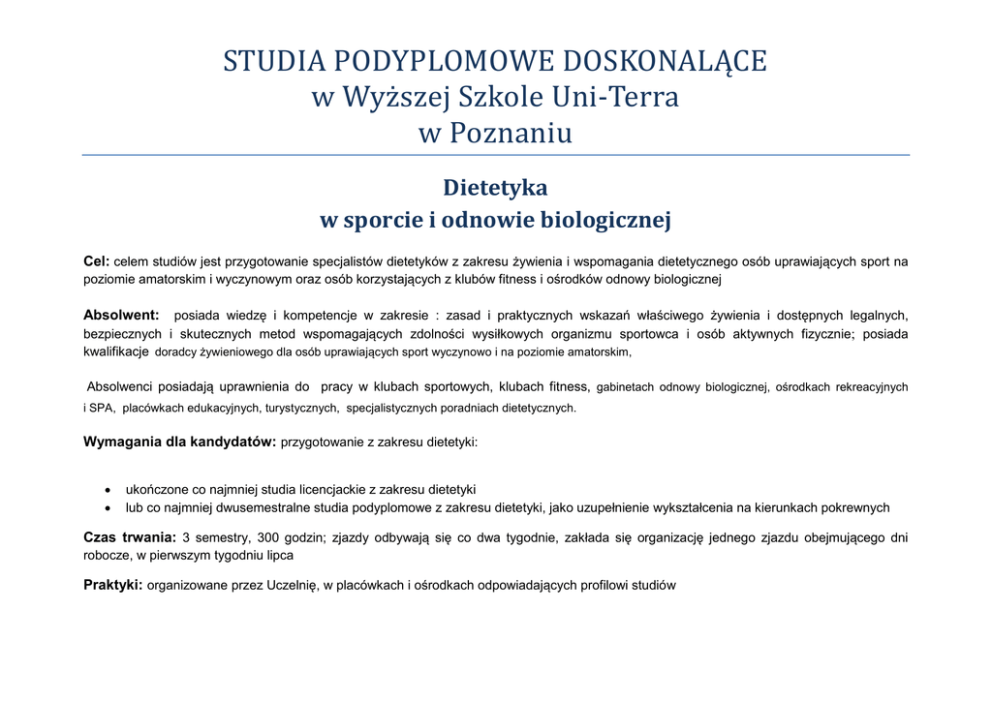 STUDIA PODYPLOMOWE DOSKONALĄCE w Wyższej Szkole Uni-Terra w Poznaniu Dietetyka w sporcie i odnowie biologicznej Cel: celem studiów jest przygotowanie specjalistów dietetyków z zakresu żywienia i wspomagania dietetycznego osób uprawiających sport na poziomie amatorskim i wyczynowym oraz osób korzystających z klubów fitness i ośrodków odnowy biologicznej posiada wiedzę i kompetencje w zakresie : zasad i praktycznych wskazań właściwego żywienia i dostępnych legalnych, bezpiecznych i skutecznych metod wspomagających zdolności wysiłkowych organizmu sportowca i osób aktywnych fizycznie; posiada kwalifikacje doradcy żywieniowego dla osób uprawiających sport wyczynowo i na poziomie amatorskim, Absolwent: Absolwenci posiadają uprawnienia do pracy w klubach sportowych, klubach fitness, gabinetach odnowy biologicznej, ośrodkach rekreacyjnych i SPA, placówkach edukacyjnych, turystycznych, specjalistycznych poradniach dietetycznych. Wymagania dla kandydatów: przygotowanie z zakresu dietetyki: ukończone co najmniej studia licencjackie z zakresu dietetyki lub co najmniej dwusemestralne studia podyplomowe z zakresu dietetyki, jako uzupełnienie wykształcenia na kierunkach pokrewnych Czas trwania: 3 semestry, 300 godzin; zjazdy odbywają się co dwa tygodnie, zakłada się organizację jednego zjazdu obejmującego dni robocze, w pierwszym tygodniu lipca Praktyki: organizowane przez Uczelnię, w placówkach i ośrodkach odpowiadających profilowi studiów