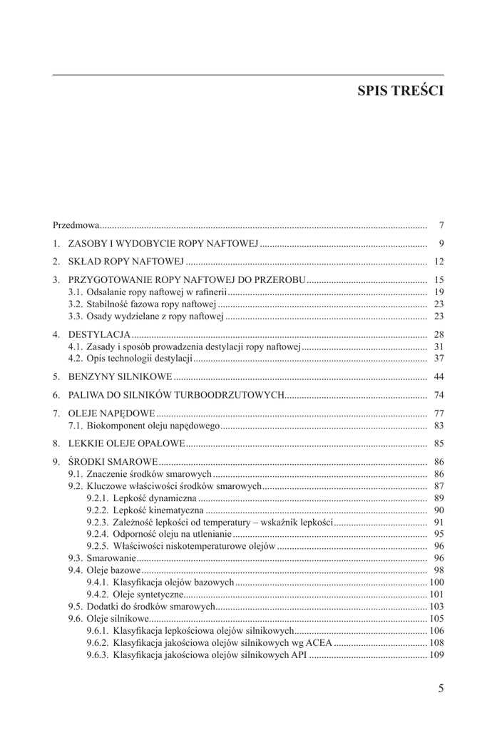 SPIS TREŚCI Przedmowa..................................................................................................................................... 7 1. ZASOBY I WYDOBYCIE ROPY NAFTOWEJ .................................................................... 9 2. SKŁAD ROPY NAFTOWEJ .................................................................................................. 12 3. PRZYGOTOWANIE ROPY NAFTOWEJ DO PRZEROBU ................................................. 3.1. Odsalanie ropy naftowej w rafinerii ................................................................................. 3.2. Stabilność fazowa ropy naftowej ..................................................................................... 3.3. Osady wydzielane z ropy naftowej .................................................................................. 15 19 23 23 4. DESTYLACJA ........................................................................................................................ 28 4.1. Zasady i sposób prowadzenia destylacji ropy naftowej ................................................... 31 4.2. Opis technologii destylacji ............................................................................................... 37 5. BENZYNY SILNIKOWE ....................................................................................................... 44 6. PALIWA DO SILNIKÓW TURBOODRZUTOWYCH.......................................................... 74 7. OLEJE NAPĘDOWE .............................................................................................................. 77 7.1. Biokomponent oleju napędowego .................................................................................... 83 8. LEKKIE OLEJE OPAŁOWE .................................................................................................. 85 9. ŚRODKI SMAROWE ............................................................................................................. 86 9.1. Znaczenie środków smarowych ....................................................................................... 86 9.2. Kluczowe właściwości środków smarowych ................................................................... 87 9.2.1. Lepkość dynamiczna ............................................................................................. 89 9.2.2. Lepkość kinematyczna .......................................................................................... 90 9.2.3. Zależność lepkości od temperatury – wskaźnik lepkości ...................................... 91 9.2.4. Odporność oleju na utlenianie ............................................................................... 95 9.2.5. Właściwości niskotemperaturowe olejów ............................................................. 96 9.3. Smarowanie ...................................................................................................................... 96 9.4. Oleje bazowe .................................................................................................................... 98 9.4.1. Klasyfikacja olejów bazowych .............................................................................. 100 9.4.2. Oleje syntetyczne................................................................................................... 101 9.5. Dodatki do środków smarowych...................................................................................... 103 9.6. Oleje silnikowe................................................................................................................. 105 9.6.1. Klasyfikacja lepkościowa olejów silnikowych ...................................................... 106 9.6.2. Klasyfikacja jakościowa olejów silnikowych wg ACEA ...................................... 108 9.6.3. Klasyfikacja jakościowa olejów silnikowych API ................................................ 109 5 9.7. Technologia olejów bazowych......................................................................................111 9.7.1. Źródła mineralnych olejów bazowych .............................................................111 9.7.2. Produkcja i właściwości olejów grupy I w klasyfikacji API .......................... 113 9.7.3. Produkcja olejów bazowych grupy II API ...................................................... 133 9.7.4. Produkcja olejów grupy III API ...................................................................... 140 10. SMARY PLASTYCZNE ........................................................................................................ 146 10.1. Zagęszczacze ............................................................................................................... 149 10.2. Stabilność smarów plastycznych ................................................................................. 150 10.3. Skład smarów plastycznych ......................................................................................... 150 10.3.1. Zagęszczacze mydlane (mydła proste i kompleksowe) .................................. 151 10.3.2. Smary zagęszczane kompleksowymi mydłami litowymi ............................... 152 10.3.3. Smary zagęszczane kompleksowymi mydłami wapniowymi, sodowymi i glinowymi............................................................................................................ 152 10.3.4. Smary zagęszczane substancjami nieorganicznymi........................................ 153 11. WOSKI NAFTOWE ............................................................................................................... 154 12. INNE PRODUKTY OTRZYMYWANE Z POZOSTAŁOŚCI PO DESTYLACJI PRÓŻNIOWEJ ROPY NAFTOWEJ ................................................................................................ 156 12.1. Pozostałość po destylacji ropy naftowej ...................................................................... 156 12.1.1. Żywice naftowe.................