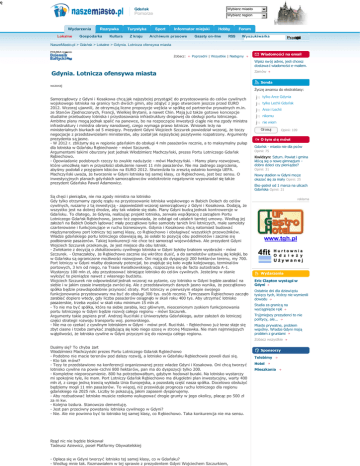 ę Wydarzenia Lokalne Rozrywka Gospodarka Kultura Gdańsk Wybierz miasto Pomorze Wybierz region Turystyka Z kraju Sport Informator miejski Archiwum prasowe Hobby Gazety on-line RSS Forum Wyszukiwarka Prześl kwjerind NaszeMiasto.pl > Gdańsk > Lokalne > Gdynia. Lotnicza ofensywa miasta Zobacz: Poprzedni | Wszystkie | Następny Wiadomości na email Wpisz swój adres, jesli chcesz dostawać wiadomości e-mailem. Gdynia. Lotnicza ofensywa miasta Zamów Sonda wczoraj Życzę awansu do ekstraklasy: Samorządowcy z Gdyni i Kosakowa chcą jak najszybciej przystąpić do przystosowania do celów cywilnych wojskowego lotniska na granicy tych dw óch gmin, aby zdążyć z jego otwarciem jeszcze przed EURO 2012. Wczoraj ujawnili, że otrzymują liczne propozycje wejścia w spółkę od partnerów prywatnych m.in. ze Stanów Zjednoczonych, Francji, Wielkiej Brytanii, a nawet Chin. Mają już także gotowe koncepcje studialne przebudowy lotniska i przystosowania infrastruktury drogowej do obsługi portu lotniczego. Ambitne plany mogą jednak spalić na panewce, bo na rozpocz ęcie inwestycji ciągle nie ma zgody ministra infrastruktury i ministra obrony narodowej, czego wymaga prawo lotnicze. Wniosek le ży na ministerialnych biurkach od 5 miesięcy. Prezydent Gdyni Wojciech Szczurek powiedział wczoraj, że toczy negocjacje z przedstawicielami ministerstw, aby został jak najszybciej pozytywnie rozpatrzony. Argumenty prezydenta są jasne. - W 2012 r. zbliżymy się w regionie gdańskim do obsługi 4 mln pasażerów rocznie, a to maksymalny pułap dla lotniska w Gdańsku Rębiechowie - mówi Szczurek. Argumentami takimi oburzony jest jednak Włodzimierz Machczyński, prezes Portu Lotniczego Gdańsk Rębiechowo. - Opowiadanie podobnych rzeczy to zwykłe nadużycie - mówi Machczyński. - Mamy plany rozwojowe, które umożliwią nam w przyszłości obsłużenie nawet 11 mln pasażerów. Nie ma żadnego zagrożenia, abyśmy podołali z przyjęciem kibiców na EURO 2012. Stwierdziła to zresztą ostatnio komisja UEFA. Machczyński uważa, że tworzenie w Gdyni lotniska tej samej klasy, co Rębiechowo, jest bez sensu. O inwestycyjnych planach gdyńskich samorządowc ów wielokrotnie negatywnie wypowiadał się także prezydent Gdańska Paweł Adamowicz. Są chęci i pieniądze, nie ma zgody ministra na lotnisko Gdy tylko otrzymamy zgodę rządu na przystosowanie lotniska wojskowego w Babich Dołach do celów cywilnych, ruszamy z tą inwestycją - zapowiedzieli wczoraj samorządowcy z Gdyni i Kosakowa. Dodają, że wszystko jest na dobrej drodze, aby tak właśnie się stało. Plany Gdyni budzą jednak kontrowersje w Gdańsku. To dlatego, że Gdynia, realizując projekt lotniska, zerwała współpracę z zarządem Portu Lotniczego Gdańsk Rębiechowo, jasno też zapowiada, że odst ąpi od ustaleń tamtej umowy. Według jej założeń na Babich Dołach lądować miały początkowo tylko samoloty tanich linii lotniczych, małe samoloty czarterowane i funkcjonujące w ruchu biznesowym. Gdynia i Kosakowo chcą natomiast budować międzynarodowy port lotniczy tej samej klasy, co Rębiechowo i obsługiwać wszystkich przewoźników. Władze gdańskiego portu lotniczego obawiają się, że osłabi to pozycję obu podmiotów i zacznie się podbieranie pasażerów. Takiej konkurencji nie chce te ż samorząd wojew ództwa. Ale prezydent Gdyni Wojciech Szczurek przekonuje, że jest miejsce dla obu lotnisk. - Zwlekanie z decyzją o zlokalizowaniu cywilnego lotniska w Gdyni byłoby brakiem wyobraźni - mówi Szczurek. - Oznaczałoby, że Rębiechowo zacznie się wkrótce dusić, a do samolotów ustawią się kolejki, bo w Gdańsku są ograniczone możliwości rozwojowe. Oni maj ą do dyspozycji 200 hektar ów terenu, my 700. Port lotniczy w Gdyni miałby doskonały potencjał, bo znajduje się koło w ęzła kolejowego, terminal ów portowych, 3 km od niego, na Trasie Kwiatkowskiego, rozpoczyna si ę de facto autostrada A-1. Wystarczy 100 mln zł, aby przystosować istniejące lotnisko do cel ów cywilnych. Jeste śmy w stanie wyłożyć te pieniądze nawet z własnego budżetu. Wojciech Szczurek nie odpowiedział jednak wczoraj na pytanie, czy lotnisko w Gdyni b ędzie zarabiać na siebie i w jakim czasie inwestycja zwróci się. Ale z przedstawionych danych jasno wynika, że początkowo spółka będzie prawdopodobnie przynosić straty. Port lotniczy w pierwszym etapie swojego funkcjonowania przystosowany ma być do obsługi 300 tys. osób rocznie. Tymczasem Rębiechowo zaczęło zarabiać dopiero wtedy, gdy liczba pasa żerów osiągnęło w skali roku 400 tys. Aby utrzymać lotnisko pasażerskie, trzeba wydać w skali roku minimum 15 mln zł. - To nie ma być spółka, która na siebie zarabia, lecz głównym, nieocenionym zyskiem funkcjonowania portu lotniczego w Gdyni będzie rozwój całego regionu - mówi Szczurek. Argumenty takie popiera prof. Andrzej Ruciński z Uniwersytetu Gdańskiego, autor założeń do lotniczej części strategii rozwoju transportu woj. pomorskiego. - Nie ma co czekać z cywilnym lotniskiem w Gdyni - mówi prof. Ruciński. - Rębiechowo ju ż teraz staje się zbyt ciasne i trzeba zamykać znajdującą się koło niego szosę w stronę Miszewka. Nie mam najmniejszych wątpliwości, że lotnisko cywilne w Gdyni przyczyni się do rozwoju całego regionu. j tylko Arce Gdynia k l m n j tylko Lechii Gdańsk k l m n j Arce i Lechii k l m n j nikomu k l m n j nie wiem k l m n Gł osuj Opinii: 109 O tym się mówi Gdańsk - miasto nie dla psów Opinii: 75 Kwidzyn: Sztum. Powiat i gmina kłócą się o nowe gimnazjum dobro dzieci czy pieniądze? Opinii: 31 Nowy stadion w Gdyni może okazać się za mały Opinii: 25 Eko-patrol od 1 marca na ulicach Gdańska Opinii: 21 reklama Wydarzenia Eric Clapton wystąpi w Gdyni Ostatnie dni dla dziewięciu tysięcy tych, którzy nie wymienili dowodu Studia za granicą na wyciągnięcie ręki Trójmiejscy prezydenci to nie politycy, ale... Miasto prywatne, p