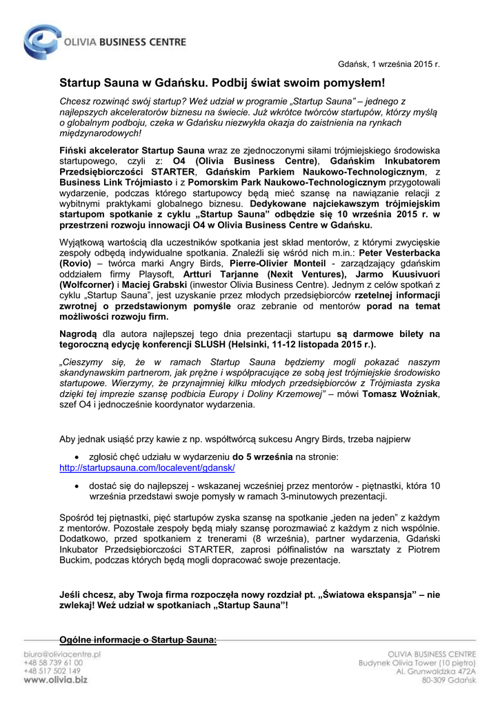 Gdańsk, 1 września 2015 r. Startup Sauna w Gdańsku. Podbij świat swoim pomysłem! Chcesz rozwinąć swój startup? Weź udział w programie „Startup Sauna” – jednego z najlepszych akceleratorów biznesu na świecie. Już wkrótce twórców startupów, którzy myślą o globalnym podboju, czeka w Gdańsku niezwykła okazja do zaistnienia na rynkach międzynarodowych! Fiński akcelerator Startup Sauna wraz ze zjednoczonymi siłami trójmiejskiego środowiska startupowego, czyli z: O4 (Olivia Business Centre), Gdańskim Inkubatorem Przedsiębiorczości STARTER, Gdańskim Parkiem Naukowo-Technologicznym, z Business Link Trójmiasto i z Pomorskim Park Naukowo-Technologicznym przygotowali wydarzenie, podczas którego startupowcy będą mieć szansę na nawiązanie relacji z wybitnymi praktykami globalnego biznesu. Dedykowane najciekawszym trójmiejskim startupom spotkanie z cyklu „Startup Sauna” odbędzie się 10 września 2015 r. w przestrzeni rozwoju innowacji O4 w Olivia Business Centre w Gdańsku. Wyjątkową wartością dla uczestników spotkania jest skład mentorów, z którymi zwycięskie zespoły odbędą indywidualne spotkania. Znaleźli się wśród nich m.in.: Peter Vesterbacka (Rovio) – twórca marki Angry Birds, Pierre-Olivier Monteil - zarządzający gdańskim oddziałem firmy Playsoft, Artturi Tarjanne (Nexit Ventures), Jarmo Kuusivuori (Wolfcorner) i Maciej Grabski (inwestor Olivia Business Centre). Jednym z celów spotkań z cyklu „Startup Sauna”, jest uzyskanie przez młodych przedsiębiorców rzetelnej informacji zwrotnej o przedstawionym pomyśle oraz zebranie od mentorów porad na temat możliwości rozwoju firm. Nagrodą dla autora najlepszej tego dnia prezentacji startupu są darmowe bilety na tegoroczną edycję konferencji SLUSH (Helsinki, 11-12 listopada 2015 r.). „Cieszymy się, że w ramach Startup Sauna będziemy mogli pokazać naszym skandynawskim partnerom, jak prężne i współpracujące ze sobą jest trójmiejskie środowisko startupowe. Wierzymy, że przynajmniej kilku młodych przedsiębiorców z Trójmiasta zyska dzięki tej imprezie szansę podbicia Europy i Doliny Krzemowej” – mówi Tomasz Woźniak, szef O4 i jednocześnie koordynator wydarzenia. Aby jednak usiąść przy kawie z np. współtwórcą sukcesu Angry Birds, trzeba najpierw zgłosić chęć udziału w wydarzeniu do 5 września na stronie: http://startupsauna.com/localevent/gdansk/ dostać się do najlepszej - wskazanej wcześniej przez mentorów - piętnastki, która 10 września przedstawi swoje pomysły w ramach 3-minutowych prezentacji. Spośród tej piętnastki, pięć startupów zyska szansę na spotkanie „jeden na jeden” z każdym z mentorów. Pozostałe zespoły będą miały szansę porozmawiać z każdym z nich wspólnie. Dodatkowo, przed spotkaniem z trenerami (8 września), partner wydarzenia, Gdański Inkubator Przedsiębiorczości STARTER, zaprosi półfinalistów na warsztaty z Piotrem Buckim, podczas których będą mogli dopracować swoje prezentacje. Jeśli chcesz, aby Twoja firma rozpoczęła nowy rozdział pt. „Światowa ekspansja” – nie zwlekaj! Weź udział w spotkaniach „Startup Sauna”! Ogólne informacje o Startup Sauna: Startup Sauna to akcelerator działający na zasadzie non profit przy Aalto University (Helsinki), prowadzony przez fundację Startup Sauna Foundation, organizującą SLUSH, czyli największą na świecie imprezę startupową. W ramach swojej działalności fiński akcelerator pomógł już ponad 150 młodym przedsiębiorcom, którym udało się zebrać dofinansowanie o łącznej kwocie 43 milionów dolarów. Harmonogram wydarzenia: 5 września - zamknięcie rekrutacji. Zapisy poprzez stronę: http://startupsauna.com/localevent/gdansk/ 8 września (od 9:00 do 16:00) - Gdański Inkubator Przedsiębiorczości STARTER – szkolenie dla startupów z Piotrem Buckim 10 września 2015 (od 9:00 do 16:00) - O4, budynek Olivia Four, Olivia Business Centre – spotkania z międzynarodowymi mentorami: Peter Vesterbacka, PierreOlivier Monteil, Artturi Tarjanne, Jarmo Kuusivuori, Maciej Grabski Więcej informacji, zapisy na wydarzenie: http://startupsauna.com/localevent/gdansk/ https://www.facebook.com/events/1474970986137135/ Informacji udziela: Monika Bogdanowicz, Communications & Community Manager, Olivia Business Centre Mob: +48 730 005 672 E-mail: [email protected]