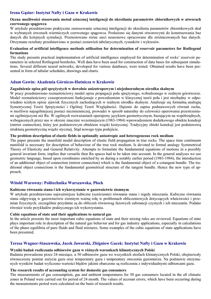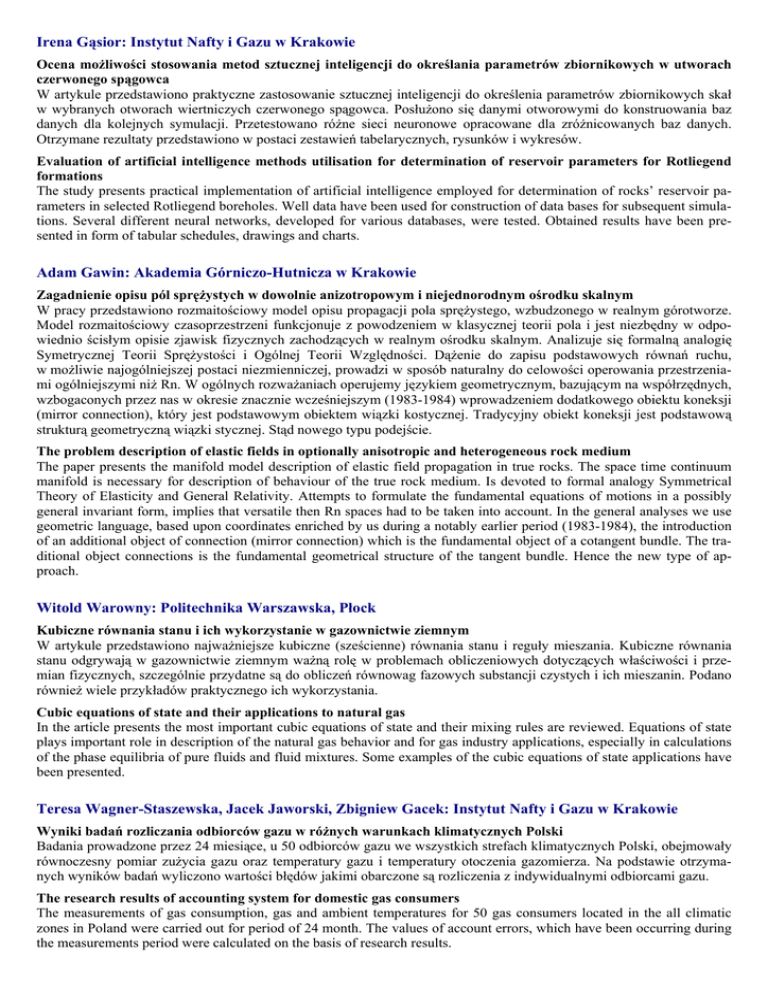 Irena Gąsior: Instytut Nafty i Gazu w Krakowie Ocena możliwości stosowania metod sztucznej inteligencji do określania parametrów zbiornikowych w utworach czerwonego spągowca W artykule przedstawiono praktyczne zastosowanie sztucznej inteligencji do określenia parametrów zbiornikowych skał w wybranych otworach wiertniczych czerwonego spągowca. Posłużono się danymi otworowymi do konstruowania baz danych dla kolejnych symulacji. Przetestowano różne sieci neuronowe opracowane dla zróżnicowanych baz danych. Otrzymane rezultaty przedstawiono w postaci zestawień tabelarycznych, rysunków i wykresów. Evaluation of artificial intelligence methods utilisation for determination of reservoir parameters for Rotliegend formations The study presents practical implementation of artificial intelligence employed for determination of rocks’ reservoir parameters in selected Rotliegend boreholes. Well data have been used for construction of data bases for subsequent simulations. Several different neural networks, developed for various databases, were tested. Obtained results have been presented in form of tabular schedules, drawings and charts. Adam Gawin: Akademia Górniczo-Hutnicza w Krakowie Zagadnienie opisu pól sprężystych w dowolnie anizotropowym i niejednorodnym ośrodku skalnym W pracy przedstawiono rozmaitościowy model opisu propagacji pola sprężystego, wzbudzonego w realnym górotworze. Model rozmaitościowy czasoprzestrzeni funkcjonuje z powodzeniem w klasycznej teorii pola i jest niezbędny w odpowiednio ścisłym opisie zjawisk fizycznych zachodzących w realnym ośrodku skalnym. Analizuje się formalną analogię Symetrycznej Teorii Sprężystości i Ogólnej Teorii Względności. Dążenie do zapisu podstawowych równań ruchu, w możliwie najogólniejszej postaci niezmienniczej, prowadzi w sposób naturalny do celowości operowania przestrzeniami ogólniejszymi niż Rn. W ogólnych rozważaniach operujemy językiem geometrycznym, bazującym na współrzędnych, wzbogaconych przez nas w okresie znacznie wcześniejszym (1983-1984) wprowadzeniem dodatkowego obiektu koneksji (mirror connection), który jest podstawowym obiektem wiązki kostycznej. Tradycyjny obiekt koneksji jest podstawową strukturą geometryczną wiązki stycznej. Stąd nowego typu podejście. The problem description of elastic fields in optionally anisotropic and heterogeneous rock medium The paper presents the manifold model description of elastic field propagation in true rocks. The space time continuum manifold is necessary for description of behaviour of the true rock medium. Is devoted to formal analogy Symmetrical Theory of Elasticity and General Relativity. Attempts to formulate the fundamental equations of motions in a possibly general invariant form, implies that versatile then Rn spaces had to be taken into account. In the general analyses we use geometric language, based upon coordinates enriched by us during a notably earlier period (1983-1984), the introduction of an additional object of connection (mirror connection) which is the fundamental object of a cotangent bundle. The traditional object connections is the fundamental geometrical structure of the tangent bundle. Hence the new type of approach. Witold Warowny: Politechnika Warszawska, Płock Kubiczne równania stanu i ich wykorzystanie w gazownictwie ziemnym W artykule przedstawiono najważniejsze kubiczne (sześcienne) równania stanu i reguły mieszania. Kubiczne równania stanu odgrywają w gazownictwie ziemnym ważną rolę w problemach obliczeniowych dotyczących właściwości i przemian fizycznych, szczególnie przydatne są do obliczeń równowag fazowych substancji czystych i ich mieszanin. Podano również wiele przykładów praktycznego ich wykorzystania. Cubic equations of state and their applications to natural gas In the article presents the most important cubic equations of state and their mixing rules are reviewed. Equations of state plays important role in description of the natural gas behavior and for gas industry applications, especially in calculations of the phase equilibria of pure fluids and fluid mixtures. Some examples of the cubic equations of state applications have been presented. Teresa Wagner-Staszewska, Jacek Jaworski, Zbigniew Gacek: Instytut Nafty i Gazu w Krakowie Wyniki badań rozliczania odbiorców gazu w różnych warunkach klimatycznych Polski Badania prowadzone przez 24 miesiące, u 50 odbiorców gazu we wszystkich strefach klimatycznych Polski, obejmowały równoczesny pomiar zużycia gazu oraz temperatury gazu i temperatury otoczenia gazomierza. Na podstawie otrzymanych wyników badań wyliczono wartości błędów jakimi obarczone są rozliczenia z indywidualnymi odbiorcami gazu. The research results of accounting system for domestic gas consumers The measurements of gas consumption, gas and ambient temperatures for 50 gas consumers located in the all climatic zones in Poland were carried out for period of 24 month. The values of account errors, which have been occurring during the measurements period were calculated on the basis of research results. Marcin Diakonowicz: Deloitte Audit Sp. z o.o., Warszawa Szanse i wyzwania dla przedsiębiorstw branży paliwowej i gazowej w obliczu rozwoju rynku Przed branżą paliwową stoi obecnie wiele wyzwań, na czele których plasuje się postępująca konsolidacja. To obecnie bez wątpienia jeden z najbardziej charakterystycznych aspektów funkcjonowania tego sektora. Oczywiście, w różnych okresach występuje ona w różnym natężeniu, dotyka różnych segmentów rynku, a jej przyczyny bywają bardzo odmienne, ale mimo to można przyjąć, że właśnie intensywność procesów konsolidacyjnych i wielorakość ich przyczyn określa obraz branży naftowej krajów europejskich. Opportunities and Challenges for Oil & Gas Sector in View of the Development of the Market Currently, the fuel business faces many challenges of which the most important is 