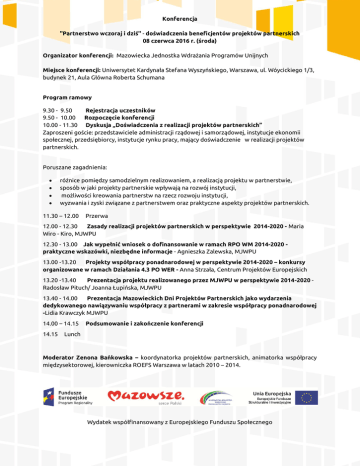 Konferencja "Partnerstwo wczoraj i dziś" - doświadczenia beneficjentów projektów partnerskich 08 czerwca 2016 r. (środa) Organizator konferencji: Mazowiecka Jednostka Wdrażania Programów Unijnych Miejsce konferencji: Uniwersytet Kardynała Stefana Wyszyńskiego, Warszawa, ul. Wóycickiego 1/3, budynek 21, Aula Główna Roberta Schumana Program ramowy 9.30 - 9.50 Rejestracja uczestników 9.50 - 10.00 Rozpoczęcie konferencji 10.00 - 11.30 Dyskusja „Doświadczenia z realizacji projektów partnerskich” Zaproszeni goście: przedstawiciele administracji rządowej i samorządowej, instytucje ekonomii społecznej, przedsiębiorcy, instytucje rynku pracy, mający doświadczenie w realizacji projektów partnerskich. Poruszane zagadnienia: różnice pomiędzy samodzielnym realizowaniem, a realizacją projektu w partnerstwie, sposób w jaki projekty partnerskie wpływają na rozwój instytucji, możliwości kreowania partnerstw na rzecz rozwoju instytucji, wyzwania i zyski związane z partnerstwem oraz praktyczne aspekty projektów partnerskich. 11.30 – 12.00 Przerwa 12.00 - 12.30 Zasady realizacji projektów partnerskich w perspektywie 2014-2020 - Maria Wiro - Kiro, MJWPU 12.30 - 13.00 Jak wypełnić wniosek o dofinansowanie w ramach RPO WM 2014-2020 praktyczne wskazówki, niezbędne informacje - Agnieszka Zalewska, MJWPU 13.00 -13.20 Projekty współpracy ponadnarodowej w perspektywie 2014-2020 – konkursy organizowane w ramach Działania 4.3 PO WER - Anna Strzała, Centrum Projektów Europejskich 13.20 -13.40 Prezentacja projektu realizowanego przez MJWPU w perspektywie 2014-2020 Radosław Pituch/ Joanna Łupińska, MJWPU 13.40 - 14.00 Prezentacja Mazowieckich Dni Projektów Partnerskich jako wydarzenia dedykowanego nawiązywaniu współpracy z partnerami w zakresie współpracy ponadnarodowej -Lidia Krawczyk MJWPU 14.00 – 14.15 14.15 Podsumowanie i zakończenie konferencji Lunch Moderator Zenona Bańkowska – koordynatorka projektów partnerskich, animatorka współpracy międzysektorowej, kierowniczka ROEFS Warszawa w latach 2010 – 2014. Wydatek współfinansowany z Europejskiego Funduszu Społecznego