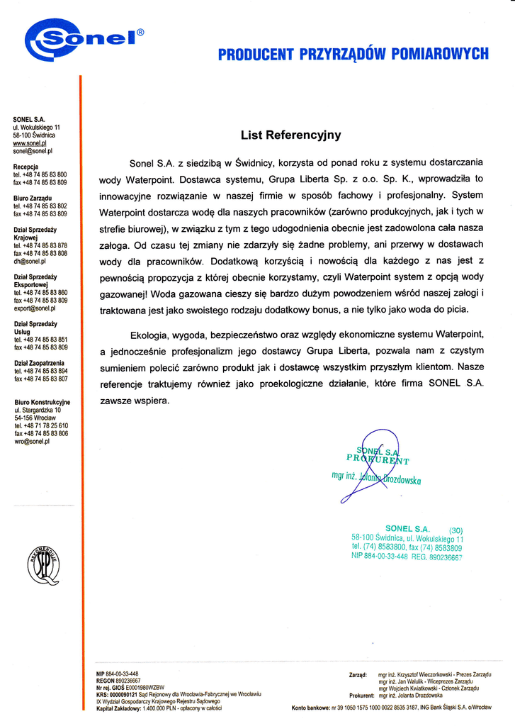referencje traktujemy również jako proekologiczne działanie, które firma SONEL S.A.