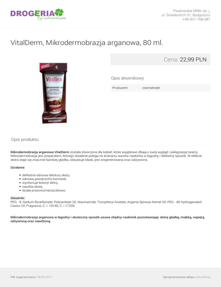 Piastowska Miller sp. j. ul. Śniadeckich 51, Bydgoszcz +48 501-768-087 VitalDerm, Mikrodermobrazja arganowa, 80 ml. Cena: 22,99 PLN Opis słownikowy Producent cosmatrade Opis produktu Mikrodermobrazja arganowa VitalDerm została stworzona dla kobiet, które wyjątkowo dbają o swój wygląd i pielęgnację twarzy. Mikrodermobrazja jest preparatem, którego działanie polega na ścieraniu warstw naskórka w łagodny i delikatny sposób. W efekcie skóra staje się znacznie bardziej gładka, odzyskuje blask, jest zregenerowana oraz odżywiona. Działanie: delikatna odnowa tekstury skóry, odnowa powierzchni komórek, wyrównuje koloryt skóry, nawilża skórę, działa przeciwzmarszczkowo. Składniki: PEG - 8, Sodium Bicarbonate, Polysorbate 20, Niacinamide, Tocopheryl Acetate, Argania Spinosa Kernel Oil, PEG - 40 Hydrogenated Castor Oil, Fragrance, C. I. 19140, C. I 17200. Mikrodermobrazja arganowa w łagodny i skuteczny sposób usuwa zbędny naskórek pozostawiając skórę gładką, miękką, napiętą, odżywioną oraz nawilżoną. Plik wygenerowano: 08-03-2017 Powered by TCPDF (www.tcpdf.org) Oprogramowanie sklepu: AptusShop