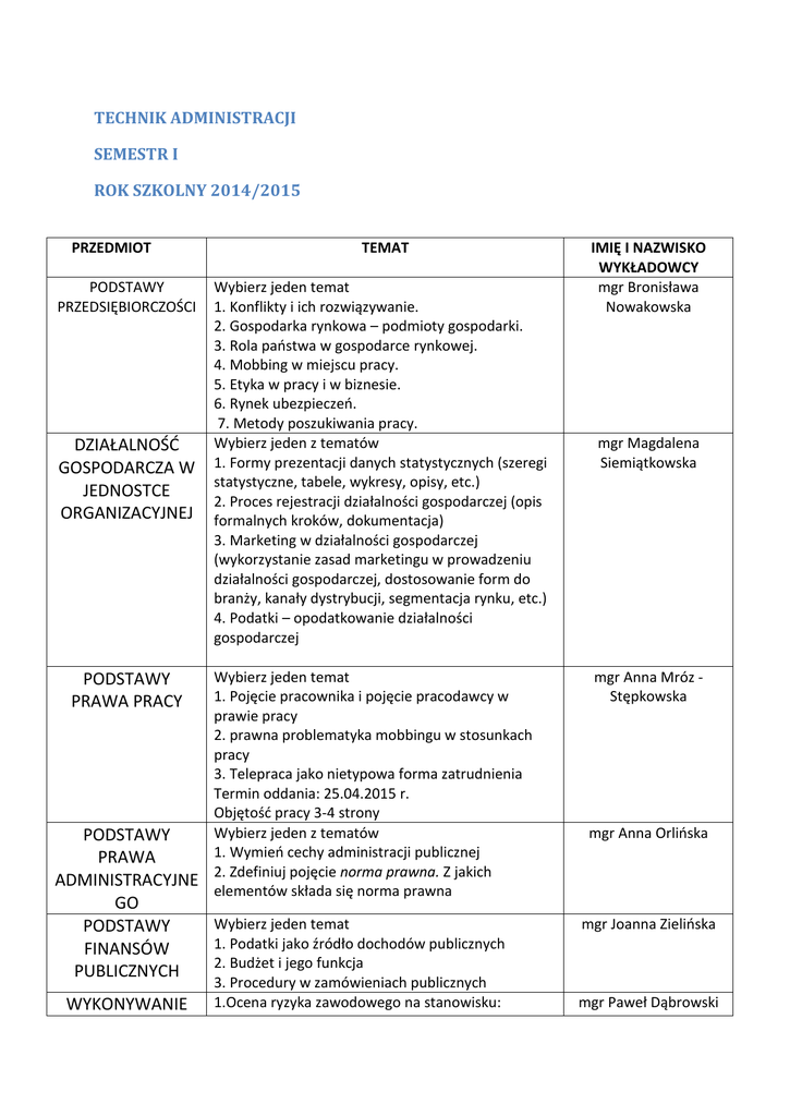 TECHNIK ADMINISTRACJI SEMESTR I ROK SZKOLNY 2014/2015 PRZEDMIOT PODSTAWY PRZEDSIĘBIORCZOŚCI DZIAŁALNOŚĆ GOSPODARCZA W JEDNOSTCE ORGANIZACYJNEJ TEMAT Wybierz jeden temat 1. Konflikty i ich rozwiązywanie. 2. Gospodarka rynkowa – podmioty gospodarki. 3. Rola państwa w gospodarce rynkowej. 4. Mobbing w miejscu pracy. 5. Etyka w pracy i w biznesie. 6. Rynek ubezpieczeń. 7. Metody poszukiwania pracy. Wybierz jeden z tematów 1. Formy prezentacji danych statystycznych (szeregi statystyczne, tabele, wykresy, opisy, etc.) 2. Proces rejestracji działalności gospodarczej (opis formalnych kroków, dokumentacja) 3. Marketing w działalności gospodarczej (wykorzystanie zasad marketingu w prowadzeniu działalności gospodarczej, dostosowanie form do branży, kanały dystrybucji, segmentacja rynku, etc.) 4. Podatki – opodatkowanie działalności gospodarczej Wybierz jeden temat 1. Pojęcie pracownika i pojęcie pracodawcy w prawie pracy 2. prawna problematyka mobbingu w stosunkach pracy 3. Telepraca jako nietypowa forma zatrudnienia Termin oddania: 25.04.2015 r. Objętość pracy 3-4 strony Wybierz jeden z tematów PODSTAWY 1. Wymień cechy administracji publicznej PRAWA ADMINISTRACYJNE 2. Zdefiniuj pojęcie norma prawna. Z jakich elementów składa się norma prawna PODSTAWY PRAWA PRACY GO PODSTAWY FINANSÓW PUBLICZNYCH WYKONYWANIE Wybierz jeden temat 1. Podatki jako źródło dochodów publicznych 2. Budżet i jego funkcja 3. Procedury w zamówieniach publicznych 1.Ocena ryzyka zawodowego na stanowisku: IMIĘ I NAZWISKO WYKŁADOWCY mgr Bronisława Nowakowska mgr Magdalena Siemiątkowska mgr Anna Mróz Stępkowska mgr Anna Orlińska mgr Joanna Zielińska mgr Paweł Dąbrowski PRACY BIUROWEJ kosmetyczka. 2. Organy nadzoru zewnętrznego i wewnętrznego nad warunkami pracy. 3. Pomieszczenia pracy stałej i czasowej.