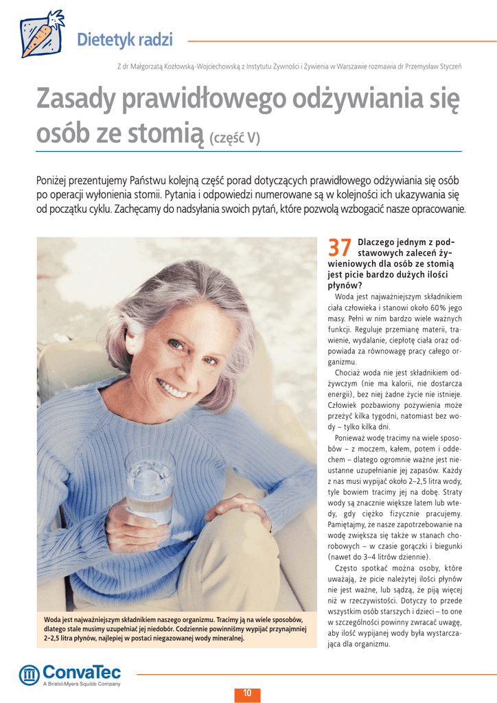 Dietetyk radzi Z dr Małgorzatą Kozłowską-Wojciechowską z Instytutu Żywności i Żywienia w Warszawie rozmawia dr Przemysław Styczeń Zasady prawidłowego odżywiania się osób ze stomią (część V) Poniżej prezentujemy Państwu kolejną część porad dotyczących prawidłowego odżywiania się osób po operacji wyłonienia stomii. Pytania i odpowiedzi numerowane są w kolejności ich ukazywania się od początku cyklu. Zachęcamy do nadsyłania swoich pytań, które pozwolą wzbogacić nasze opracowanie. 37 Dlaczego jednym z podstawowych zaleceń żywieniowych dla osób ze stomią jest picie bardzo dużych ilości płynów? Woda jest najważniejszym składnikiem naszego organizmu. Tracimy ją na wiele sposobów, dlatego stale musimy uzupełniać jej niedobór. Codziennie powinniśmy wypijać przynajmniej 2-2,5 litra płynów, najlepiej w postaci niegazowanej wody mineralnej. 10 Woda jest najważniejszym składnikiem ciała człowieka i stanowi około 60% jego masy. Pełni w nim bardzo wiele ważnych funkcji. Reguluje przemianę materii, trawienie, wydalanie, ciepłotę ciała oraz odpowiada za równowagę pracy całego organizmu. Chociaż woda nie jest składnikiem odżywczym (nie ma kalorii, nie dostarcza energii), bez niej żadne życie nie istnieje. Człowiek pozbawiony pożywienia może przeżyć kilka tygodni, natomiast bez wody – tylko kilka dni. Ponieważ wodę tracimy na wiele sposobów – z moczem, kałem, potem i oddechem – dlatego ogromnie ważne jest nieustanne uzupełnianie jej zapasów. Każdy z nas musi wypijać około 2–2,5 litra wody, tyle bowiem tracimy jej na dobę. Straty wody są znacznie większe latem lub wtedy, gdy ciężko fizycznie pracujemy. Pamiętajmy, że nasze zapotrzebowanie na wodę zwiększa się także w stanach chorobowych – w czasie gorączki i biegunki (nawet do 3–4 litrów dziennie). Często spotkać można osoby, które uważają, że picie należytej ilości płynów nie jest ważne, lub sądzą, że piją więcej niż w rzeczywistości. Dotyczy to przede wszystkim osób starszych i dzieci – to one w szczególności powinny zwracać uwagę, aby ilość wypijanej wody była wystarczająca dla organizmu. 38 Czy płyny należy pić również wtedy, gdy nie odczuwamy pragnienia? Zdecydowanie tak. Wiele osób uważa, że skoro nie odczuwa pragnienia, to znaczy, że nie musi pić. Nic bardziej mylnego! Aby wszystkie procesy w organizmie przebiegały prawidłowo, należy dostarczyć mu tyle wody, ile jej traci. Za niezbędne minimum uważa się 8–10 szklanek płynów, które należy wypić równomiernie w ciągu całego dnia. Trzeba przy tym zaznaczyć, że przynajmniej połowa tej ilości powinna być dostarczona w postaci wody mineralnej lub innych niesłodzonych napojów. Jak robić soki? Soki owocowe i warzywne najlepiej przygotowywać samemu. Są cennym źródłem witamin, błonnika pokarmowego oraz mikro- i makroelementów. Soki z warzyw są znacznie lepiej tolerowane przez osoby ze stomią niż soki z owoców, ponieważ nie zwiększają fermentacji jelitowej i nie zwiększają produkcji gazów jelitowych. 39 Osoby, które piją mało płynów, mają często skłonność do zaparć. Należna podaż płynów jest więc jedną z metod ich zapobiegania, a w przypadku wystąpienia jest również jedną z metod ich leczenia. Biegunki nigdy nie należy „leczyć” poprzez ograniczenie ilości wypijanych płynów. Wręcz przeciwnie – picie odpowiedniej ilości wody jest niezbędne, aby zapobiec odwodnieniu organizmu, które może postępować bardzo szybko. Nie należy obawiać się, że nasili to kolejne wypróżnienia, pod warunkiem że płyny są wypijane powoli. Jak i kiedy pić wodę? Regularnie, małymi łykami – małe ilości lepiej się wchłaniają i są wolniej wydalane. Szklanka wody wypita 30 minut przed posiłkiem zmniejsza apetyt. Lepiej nie pić w trakcie jedzenia, bo zmniejsza to stężenie enzymów trawiennych. 40 Jakie płyny można pić do woli, a jakich powinno się unikać? Najzdrowsza i najbezpieczniejsza jest niegazowana woda mineralna. Jest ona FOT. T. PERCZYŃSKI W jaki sposób wypijane płyny wpływają na konsystencję stolca u stomików? najlepsza dla każdego, bez względu na wiek i stan zdrowia. Uwaga – należy pamiętać, że woda powinna zostać wypita w ciągu kilku, kilkunastu godzin po otwarciu butelki. Najlepiej przechowywać ją wtedy w lodówce. W otwartej butelce z wodą mnożą się dość szybko mikroorganizmy – bakterie, grzyby i pleśnie – i jeżeli wypijemy wodę z butelki otwartej już 3–4 dni, to jest wielce prawdopodobne, że nabawimy się kłopotów z żołądkiem. Można także pić wodę gazowaną. Wydaje się często smaczniejsza, ale może – nawet u zdrowych osób, a tym bardziej u stomików – powodować zgagę, wzdęcia oraz kwaśne odbijanie się. Jest ona zdecydowanie przeciwwskazana u osób z chorobą wrzodową żołądka i dwunastnicy oraz chorobą refluksową przełyku. Do woli można pić herbatę, która posiada bardzo wiele korzystnych właściwości. Z ziołami natomiast należy uważać. Wiele z nich działa w sposób, który nie zawsze jest korzystny dla osób ze stomią. Przykładem jest np. liść mięty pieprzowej, której napar powoduje zwiększoną produkcję gazów jelitowych oraz wzmaga wydzielanie soku żołądkowego i żółci. Napoje słodzone (oranżada, coca-cola) powinno się całkowicie wyeliminować 11 z diety. Po pierwsze, są one gazowane i często powodują zgagę oraz wzdęcia. Po drugie, zawierają cukier (puste kalorie) i sprzyjają powstawaniu nadwagi oraz otyłości. Po trzecie, zwiększają fermentację jelitową, która może być szczególnie przykra dla osób z przetoką jelitową. Wzmożona fermentacja jelitowa może bowiem powodować wzdęcia oraz powstanie przykrego uczucia „przelewania się” w jelitach. Może być także przyczyną biegunki, na którą w szczególności narażone są osoby z ileostomią. Soki owoc