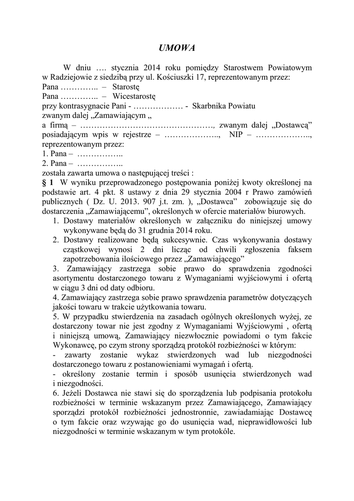 UMOWA W dniu …. stycznia 2014 roku pomiędzy Starostwem Powiatowym w Radziejowie z siedzibą przy ul. Kościuszki 17, reprezentowanym przez: Pana ………….. – Starostę Pana ………….. – Wicestarostę przy kontrasygnacie Pani - ……………… - Skarbnika Powiatu zwanym dalej „Zamawiającym „ a firmą – …………………………………………, zwanym dalej „Dostawcą” posiadającym wpis w rejestrze – ……………….., NIP – ……………….., reprezentowanym przez: 1. Pana – …………….. 2. Pana – …………….. została zawarta umowa o następującej treści : § 1 W wyniku przeprowadzonego postępowania poniżej kwoty określonej na podstawie art. 4 pkt. 8 ustawy z dnia 29 stycznia 2004 r Prawo zamówień publicznych ( Dz. U. 2013. 907 j.t. zm. ), „Dostawca” zobowiązuje się do dostarczenia „Zamawiającemu”, określonych w ofercie materiałów biurowych. 1. Dostawy materiałów określonych w załączniku do niniejszej umowy wykonywane będą do 31 grudnia 2014 roku. 2. Dostawy realizowane będą sukcesywnie. Czas wykonywania dostawy cząstkowej wynosi 2 dni licząc od chwili zgłoszenia faksem zapotrzebowania ilościowego przez „Zamawiającego” 3. Zamawiający zastrzega sobie prawo do sprawdzenia zgodności asortymentu dostarczonego towaru z Wymaganiami wyjściowymi i ofertą w ciągu 3 dni od daty odbioru. 4. Zamawiający zastrzega sobie prawo sprawdzenia parametrów dotyczących jakości towaru w trakcie użytkowania towaru. 5. W przypadku stwierdzenia na zasadach ogólnych określonych wyżej, ze dostarczony towar nie jest zgodny z Wymaganiami Wyjściowymi , ofertą i niniejszą umową, Zamawiający niezwłocznie powiadomi o tym fakcie Wykonawcę, po czym strony sporządzą protokół rozbieżności w którym: - zawarty zostanie wykaz stwierdzonych wad lub niezgodności dostarczonego towaru z postanowieniami wymagań i ofertą. - określony zostanie termin i sposób usunięcia stwierdzonych wad i niezgodności. 6. Jeżeli Dostawca nie stawi się do sporządzenia lub podpisania protokołu rozbieżności w terminie wskazanym przez Zamawiającego, Zamawiający sporządzi protokół rozbieżności jednostronnie, zawiadamiając Dostawcę o tym fakcie oraz wzywając go do usunięcia wad, nieprawidłowości lub niezgodności w terminie wskazanym w tym protokóle. § 2 1. „Dostawca” będzie stosował ceny na materiały biurowe zgodnie z ofertą, stanowiącą załącznik do niniejszej umowy. 2. Wynagrodzenie za realizację przedmiotu umowy wyliczane będzie na podstawie cen jednostkowych określonych w ofercie i wyniesie nie więcej niż : ……………………………………….. złotych brutto. 3. Wynagrodzenie określone w ust. 3 obejmuje wszelkie koszty związane z realizacją przedmiotu niniejszej umowy włącznie z kosztami własnymi Dostawcy, takimi jak w szczególności: koszty dostarczenia towaru do miejsc dostawy, opakowania, ubezpieczenia na czas transportu i nie podlega zmianie. § 3 1. „Dostawca” zobowiązuje się na własny koszt dostarczyć „Zamawiającemu” przedmiot umowy określony w § 1 do siedziby Starostwa Powiatowego w Radziejowie ul. Kościuszki 17 ( biuro nr 17 ). 2. Dostarczone towary będą nieregenerowane, fabrycznie nowe w oryginalnym opakowaniu opatrzonym nazwą / lub znakiem towarowym producenta, wskazującym typ i model urządzenia do którego jest przeznaczony z ważnym terminem przydatności do użycia wynoszącym dla tuszów nie mniej niż 12 miesięcy od daty dostawy oraz z dożywotnią gwarancją dla tonerów. 3. Zamawiający zastrzega sobie prawo określenia ilości towaru składającego się na przedmiot zamówienia w zależności od faktycznych potrzeb w związku z czym Dostawca otrzyma wynagrodzenie za rzeczywiście wykonane dostawy. § 4 „Zamawiający” zapłaci „Dostawcy” należność za dostarczone materiały biurowe, przelewem w terminie 14 dni od dnia otrzymania faktury VAT. § 5 Strony ustanawiają odpowiedzialność za niewykonanie lub nienależyte wykonanie umowy w formie kar umownych w następujących przypadkach: 1. Za zwłokę w dostawie przedmiotu umowy „Dostawca” zapłaci ”Zamawiającemu” karę umowną w wysokości 2 % wartości opóźnionej dostawy za każdy dzień zwłoki. 2. Za opóźnienia w płatności zgodnie z § 4 „Zamawiający” zapłaci „Dostawcy” odsetki ustawowe. § 6 W przypadku nieuzasadnionego zerwania umowy przez „Dostawcę”, zapłaci on „Zamawiającemu” odszkodowanie w wysokości 20% wartości niezrealizowanego zamówienia. § 7 Wszelkie spory powstałe na tle wykonania postanowień niniejszej umowy będą rozstrzygane przez właściwy dla Zamawiającego miejscowo Sąd. § 8 Umowę sporządzono w trzech jednobrzmiących egzemplarzach, dwa egzemplarze dla Zamawiającego, jeden dla Dostawcy. Dostawca: Zamawiający: Załącznik: 1. Oferta materiałów biurowych z dnia ………………… r.