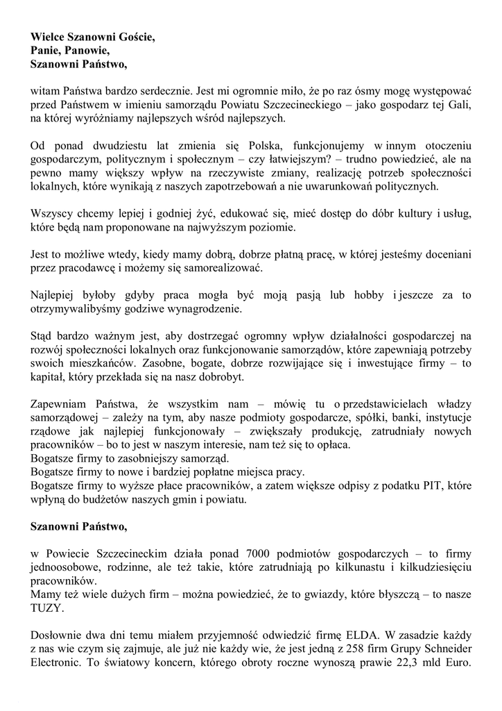 Wielce Szanowni Goście, Panie, Panowie, Szanowni Państwo, witam Państwa bardzo serdecznie. Jest mi ogromnie miło, że po raz ósmy mogę występować przed Państwem w imieniu samorządu Powiatu Szczecineckiego – jako gospodarz tej Gali, na której wyróżniamy najlepszych wśród najlepszych. Od ponad dwudziestu lat zmienia się Polska, funkcjonujemy w innym otoczeniu gospodarczym, politycznym i społecznym – czy łatwiejszym? – trudno powiedzieć, ale na pewno mamy większy wpływ na rzeczywiste zmiany, realizację potrzeb społeczności lokalnych, które wynikają z naszych zapotrzebowań a nie uwarunkowań politycznych. Wszyscy chcemy lepiej i godniej żyć, edukować się, mieć dostęp do dóbr kultury i usług, które będą nam proponowane na najwyższym poziomie. Jest to możliwe wtedy, kiedy mamy dobrą, dobrze płatną pracę, w której jesteśmy doceniani przez pracodawcę i możemy się samorealizować. Najlepiej byłoby gdyby praca mogła być moją pasją lub hobby i jeszcze za to otrzymywalibyśmy godziwe wynagrodzenie. Stąd bardzo ważnym jest, aby dostrzegać ogromny wpływ działalności gospodarczej na rozwój społeczności lokalnych oraz funkcjonowanie samorządów, które zapewniają potrzeby swoich mieszkańców. Zasobne, bogate, dobrze rozwijające się i inwestujące firmy – to kapitał, który przekłada się na nasz dobrobyt. Zapewniam Państwa, że wszystkim nam – mówię tu o przedstawicielach władzy samorządowej – zależy na tym, aby nasze podmioty gospodarcze, spółki, banki, instytucje rządowe jak najlepiej funkcjonowały – zwiększały produkcję, zatrudniały nowych pracowników – bo to jest w naszym interesie, nam też się to opłaca. Bogatsze firmy to zasobniejszy samorząd. Bogatsze firmy to nowe i bardziej popłatne miejsca pracy. Bogatsze firmy to wyższe płace pracowników, a zatem większe odpisy z podatku PIT, które wpłyną do budżetów naszych gmin i powiatu. Szanowni Państwo, w Powiecie Szczecineckim działa ponad 7000 podmiotów gospodarczych – to firmy jednoosobowe, rodzinne, ale też takie, które zatrudniają po kilkunastu i kilkudziesięciu pracowników. Mamy też wiele dużych firm – można powiedzieć, że to gwiazdy, które błyszczą – to nasze TUZY. Dosłownie dwa dni temu miałem przyjemność odwiedzić firmę ELDA. W zasadzie każdy z nas wie czym się zajmuje, ale już nie każdy wie, że jest jedną z 258 firm Grupy Schneider Electronic. To światowy koncern, którego obroty roczne wynoszą prawie 22,3 mld Euro. 2 ELDA w rankingu wewnętrznym tego koncernu jest na 6 miejscu – na 258 firm. Jest też na pierwszym miejscu z 21 firm, które zajmują się tą samą produkcją. To właśnie naszej polskiej Firmie, naszej szczecineckiej ELDZIE, poprzez świetne zarządzanie, dobrą organizację pracy, wysoko wykwalifikowaną kadrę, bardzo dobrą jakość udało się przejąć produkcję z Węgier, Francji i innych firm Grupy Schneider Elektronic. Dzisiaj do Eldy przyjeżdżają przedstawiciele wielu firm z tej grupy, podglądając i ucząc się nowoczesnego zarządzania firmą i produkcją. W ELDZIE pracuje około 350 pracowników. Gratuluję Panu Prezesowi Robertowi Wilickiemu, ale też dziękuję za promocję naszego miasta i powiatu. Można by powiedzieć DOBRE – BO ZE SZCZECINKA Nie sposób nie wspomnieć o firmach Grupy KRONOSPAN. Pomimo recesji na europejskim rynku produkcji płyt firmy szczecineckie z tej grupy utrzymały, a nawet zwiększyły produkcję. To głównie dzięki eksportowi do krajów Europy Wschodniej: Ukrainy, Białorusi, Rosji możliwe jest utrzymanie stanowisk pracy w tej firmie, jak również w firmach kooperacyjnych i świadczących usługi dla firm ze znakiem KRONO. W rankingu Rzeczpospolitej ogłaszanym co roku, który zawiera 2000 najlepszych firm KRONOSPAN Szczecinek znajduje się na 225 miejscu. Gratuluję zarządowi i wszystkim pracownikom. Dzisiaj nie jest łatwo prowadzić własny interes - własną firmę. Coraz częściej zauważamy, że firmy upadają, zamykane są sklepy, punkty usługowe, restauracje, pensjonaty. Ciągle jeszcze trzeba mieć „nosa”, konkurować jakością i ceną, znaleźć „niszę” dla swojego pomysłu, dbać o odbiorcę i rynek zbytu, mieć dobrych i solidnych partnerów, liczyć wartość Euro i umiejętnie, aczkolwiek uczciwie i zgodnie z przepisami rozliczać się z fiskusem. Szanowni Państwo, przy tej okazji warto jest wspomnieć, jak samorządy lokalne funkcjonowały w roku 2011. W mojej ocenie spokojnie i uczciwie możemy powiedzieć, że rok 2011 był dla samorządów gmin i Powiatu Szczecineckiego bardzo dobry. Podsumowałem nasze wydatki – wszystkie samorządy gmin i powiatu wydały w roku 2011 prawie 356 mln zł. Z tego 81,5 mln zł to wydatki na inwestycje. W roku 2011 miasto Szczecinek i samorząd powiatowy co trzecią złotówkę z budżetu wydatkowały na inwestycje. Ten „bum” inwestycyjny widać – i poprzez rozpoczęte przedsięwzięcia będzie jeszcze trwał kilka lat. · Nowoczesne rozwiązania komunikacyjne miasta, · Termomodernizacja wielu obiektów użyteczności publicznej, · Inwestycje w nowe autobusy komunikacji miejskiej, · Rewitalizacja parku miejskiego i zamku, · Modernizacja obiektów oświatowych i nowe obiekty sportowe, 3 · Rozpoczęcie budowy nowej siedziby Komendy Powiatowej Policji, · Modernizacja obiektów straży pożarnej, · Rozbudowa szczecineckiego szpitala to główne przedsięwzięcia inwestycyjne, które zdarzyły się w roku 2011 przy naszym zaangażowaniu. Nie sposób nie wspomnieć o spółkach miejskich, które są bardzo dobrze zorganizowane i świadczą usługi dla mieszkańców miasta i powiatu na najwyższym poziomie – mówię tu o MEC, PWiK, Komunikacji Miejskiej. Drodzy Państwo, rynek szczecinecki to duży pieniądz w obrocie: · · wspomniałem o wydatkach samorządów lokalnych – 356 mln zł, informuję Państwa, że nasi rolnicy w roku 2011 otrzymali z ARiM