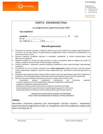 KARTA GWARANCYJNA na podgrzewacz pojemnościowy CWU Typ urządzenia: zasobnik …………………………………………………………………….. TE Nr ser. ……………………………… zg. z fakturą nr ………….. z dnia ……………… 1 szt. Warunki gwarancji: Gwarancja na sprawne działanie urządzenia udzielana jest przez producenta zwanego dalej Gwarantem, na okres 5 lat od daty zakupu na pojemnościowy podgrzewacz wody w wykonaniu standardowym, na części elektroniczne 2 lata. Gwarant zapewnia bezpłatną naprawę w przypadku wystąpienia w okresie gwarancyjnym wad fabrycznych urządzenia. Naprawa urządzenia u klienta lub jego wymiana na nowy w przypadku wady nie dającej się usunąć na miejscu, nastąpi w terminie 30 dni od daty przyjęcia reklamacji. Uznanie reklamacji i dokonanie naprawy powoduje przedłużenie okresu gwarancyjnego naprawianego urządzenia. Przynajmniej raz na 12 miesięcy sprawdzić stan anody magnezowej (należy zachować rachunek zakupu anody magnezowej). Regularna wymiana anody magnezowej jest warunkiem utrzymania gwarancji na zbiornik. Podstawę napraw gwarancyjnych stanowi faktura zakupu oraz karta gwarancyjna poprawnie wypełniona, kompletna i nie zawierającą żadnych poprawek (należy przechowywać ją przez cały okres gwarancji). Gwarant ma prawo odmówić naprawy lub wymiany, o której mowa w pkt.3, jeżeli: stwierdzone zostaną uszkodzenia mechaniczne lub chemiczne powstałe z przyczyn leżących po stronie użytkownika i będących następstwem użytkowania urządzenia niezgodnie z jego przeznaczeniem; - przekroczono dopuszczalne ciśnienia pracy urządzenia określone przez jego charakterystykę techniczną lub brak jest urządzeń ograniczających to ciśnienie do wartości okreslonych w tabliczce znamionowej produktu jako ciśnienie robocze. SAMOWOLNE DOKONYWANIE NAPRAW LUB PRZERÓBEK PRZEZ OSOBY NIEUPRAWNIONE POWODUJE UTRATĘ GWARANCJI UWAGA: Warunkiem utrzymania gwarancji jest przestrzeganie instrukcji montażu i eksploatacji pojemnościowych podgrzewaczy wody a w szczególności schematu podłączenia ciepłej wody (patrz instrukcja pkt. 4) ........................................................ data sprzedaży …………………………………………… pieczęć i podpis sprzedającego Naprawy gwarancyjne i przeglądy okresowe Data montażu Nr Data przeglądu /naprawy Typ i nazwa urządzenia Zakres przeglądu/naprawy Podpis instalatora Potwierdzenie Przeglądu/naprawy Serwisant 1 2 3 Użytkownik
