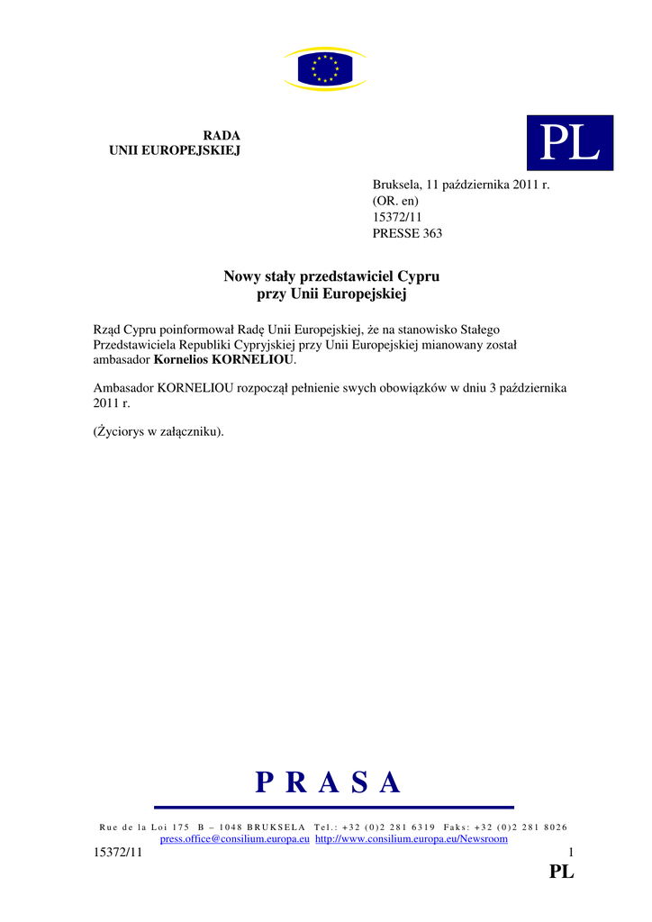 PL RADA UNII EUROPEJSKIEJ Bruksela, 11 października 2011 r. (OR. en) 15372/11 PRESSE 363 Nowy stały przedstawiciel Cypru przy Unii Europejskiej Rząd Cypru poinformował Radę Unii Europejskiej, że na stanowisko Stałego Przedstawiciela Republiki Cypryjskiej przy Unii Europejskiej mianowany został ambasador Kornelios KORNELIOU. Ambasador KORNELIOU rozpoczął pełnienie swych obowiązków w dniu 3 października 2011 r. (Życiorys w załączniku). PRASA Rue de la Loi 175 B – 1048 BRUKSELA Tel.: +32 (0)2 281 6319 Faks: +32 (0)2 281 8026 [email protected] http://www.consilium.europa.eu/Newsroom 15372/11 1 PL ANNEX Curriculum Vitae H. E. Mr Kornelios KORNELIOU Born on 29 June 1963 in Nicosia, Cyprus [email protected] EDUCATION 1984 – 1989: MA in Political Science, Philosophy and American Culture History at the Ludwig Maximilian University, Munich, Germany Thesis on: “Membership of Greece in the European Economic Community and its consequences on its foreign and internal policies” CAREER October 2011 Ambassador, Permanent Representative of the Republic of Cyprus to the European Union September 2010 - September 2011 Ambassador Extraordinary and Plenipotentiary of the Republic of Cyprus to France Permanent Delegate to the Unesco March 2008 - August 2010 Director of the Diplomatic Office of the Minister of Foreign Affairs 2005-2008 Ambassador of the Republic of Cyprus to Austria. Permanent Representative to OSCE, IAEA, UNIDO, CTBT and the UN Office in Vienna. Parallel accreditation to Slovenia, Croatia, Slovakia and Liechtenstein. 2000-2005 Deputy Permanent Representative of Cyprus to the European Union, Brussels 1998-2000 Director of the Office of the Permanent Secretary of the Ministry of Foreign Affairs in Cyprus 15372/11 2 PL 1995-1997 Permanent Mission of the Republic of Cyprus to the United Nations, New York 1990-1995 Embassy of Cyprus in Bonn, Germany 1989-1990 Ministry of Foreign Affairs in Cyprus LANGUAGES Greek, English, German, French (basics) DECORATIONS “Cross of Merit, First Class”, of the Federal Republic of Germany (1995) “The Golden Order for Services” of the Republic of Slovenia (2006) “Grand Decoration of Honour in Silver with Sash” for Services to the Republic of Austria (2007) “REDOM KNEZA BRANIMIRA S OGRLICOM” of the Republic of Croatia (2008) Honorary Doctor of European University of Republic of Serbia (2008) «EQVITEM COMMENDATOREM ORDINIS SANCTI GREGORII MAGNI, Holy Seat (2010) HOBBIES Music, Jogging, Reading Married to Xenia Nicolaides, one daughter, Maria 15372/11 3 PL