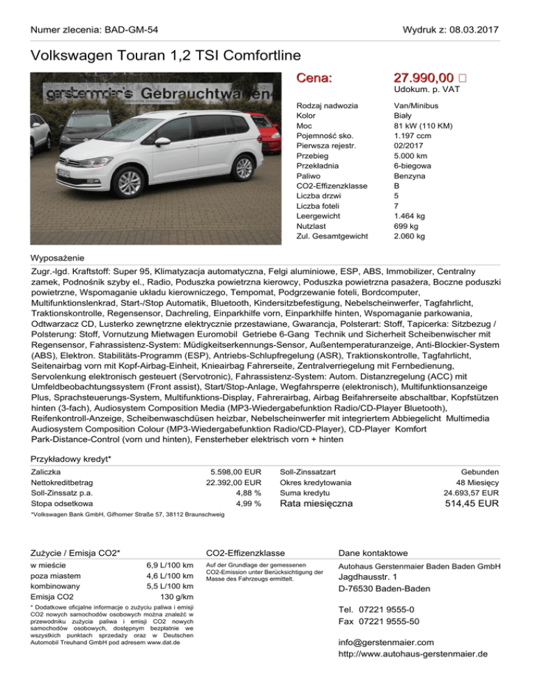 Numer zlecenia: BAD-GM-54 Wydruk z: 08.03.2017 Volkswagen Touran 1,2 TSI Comfortline Cena: 27.990,00 Rodzaj nadwozia Kolor Moc Pojemność sko. Pierwsza rejestr. Przebieg Przekładnia Paliwo CO2-Effizenzklasse Liczba drzwi Liczba foteli Leergewicht Nutzlast Zul. Gesamtgewicht Van/Minibus Biały 81 kW (110 KM) 1.197 ccm 02/2017 5.000 km 6-biegowa Benzyna B 5 7 1.464 kg 699 kg 2.060 kg Udokum. p. VAT Wyposażenie Zugr.-lgd. Kraftstoff: Super 95, Klimatyzacja automatyczna, Felgi aluminiowe, ESP, ABS, Immobilizer, Centralny zamek, Podnośnik szyby el., Radio, Poduszka powietrzna kierowcy, Poduszka powietrzna pasażera, Boczne poduszki powietrzne, Wspomaganie układu kierowniczego, Tempomat, Podgrzewanie foteli, Bordcomputer, Multifunktionslenkrad, Start-/Stop Automatik, Bluetooth, Kindersitzbefestigung, Nebelscheinwerfer, Tagfahrlicht, Traktionskontrolle, Regensensor, Dachreling, Einparkhilfe vorn, Einparkhilfe hinten, Wspomaganie parkowania, Odtwarzacz CD, Lusterko zewnętrzne elektrycznie przestawiane, Gwarancja, Polsterart: Stoff, Tapicerka: Sitzbezug / Polsterung: Stoff, Vornutzung Mietwagen Euromobil Getriebe 6-Gang Technik und Sicherheit Scheibenwischer mit Regensensor, Fahrassistenz-System: Müdigkeitserkennungs-Sensor, Außentemperaturanzeige, Anti-Blockier-System (ABS), Elektron. Stabilitäts-Programm (ESP), Antriebs-Schlupfregelung (ASR), Traktionskontrolle, Tagfahrlicht, Seitenairbag vorn mit Kopf-Airbag-Einheit, Knieairbag Fahrerseite, Zentralverriegelung mit Fernbedienung, Servolenkung elektronisch gesteuert (Servotronic), Fahrassistenz-System: Autom. Distanzregelung (ACC) mit Umfeldbeobachtungssystem (Front assist), Start/Stop-Anlage, Wegfahrsperre (elektronisch), Multifunktionsanzeige Plus, Sprachsteuerungs-System, Multifunktions-Display, Fahrerairbag, Airbag Beifahrerseite abschaltbar, Kopfstützen hinten (3-fach), Audiosystem Composition Media (MP3-Wiedergabefunktion Radio/CD-Player Bluetooth), Reifenkontroll-Anzeige, Scheibenwaschdüsen heizbar, Nebelscheinwerfer mit integriertem Abbiegelicht Multimedia Audiosystem Composition Colour (MP3-Wiedergabefunktion Radio/CD-Player), CD-Player Komfort Park-Distance-Control (vorn und hinten), Fensterheber elektrisch vorn + hinten Przykładowy kredyt* Zaliczka Nettokreditbetrag Soll-Zinssatz p.a. Stopa odsetkowa 5.598,00 EUR 22.392,00 EUR 4,88 % 4,99 % Soll-Zinssatzart Okres kredytowania Suma kredytu Gebunden 48 Miesięcy 24.693,57 EUR Rata miesięczna 514,45 EUR *Volkswagen Bank GmbH, Gifhorner Straße 57, 38112 Braunschweig Zużycie / Emisja CO2* w mieście poza miastem kombinowany Emisja CO2 6,9 L/100 km 4,6 L/100 km 5,5 L/100 km 130 g/km * Dodatkowe oficjalne informacje o zużyciu paliwa i emisji CO2 nowych samochodów osobowych można znaleźć w przewodniku zużycia paliwa i emisji CO2 nowych samochodów osobowych, dostępnym bezpłatnie we wszystkich punktach sprzedaży oraz w Deutschen Automobil Treuhand GmbH pod adresem www.dat.de CO2-Effizenzklasse Dane kontaktowe Auf der Grundlage der gemessenen CO2-Emission unter Berücksichtigung der Masse des Fahrzeugs ermittelt. Autohaus Gerstenmaier Baden Baden GmbH Jagdhausstr. 1 D-76530 Baden-Baden Tel. 07221 9555-0 Fax 07221 9555-50 [email protected] http://www.autohaus-gerstenmaier.de Numer zlecenia: BAD-GM-54 Volkswagen Touran 1,2 TSI Comfortline Wydruk z: 08.03.2017 Numer zlecenia: BAD-GM-54 Volkswagen Touran 1,2 TSI Comfortline Wydruk z: 08.03.2017