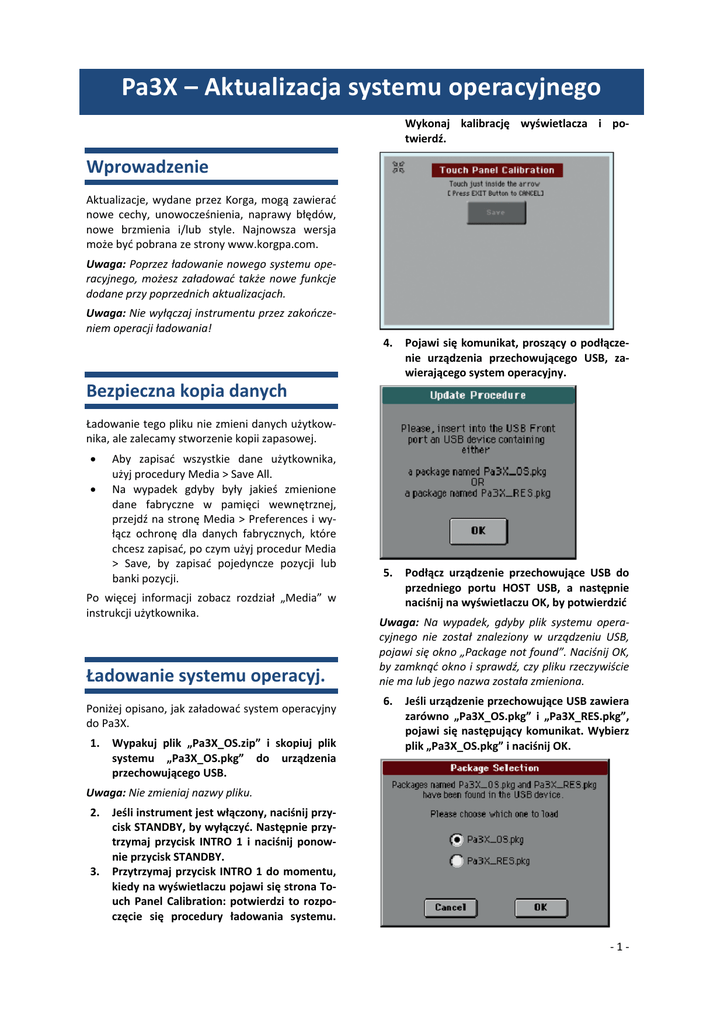 Pa3X – Aktualizacja systemu operacyjnego Wykonaj kalibrację wyświetlacza i po‐ twierdź. Wprowadzenie Aktualizacje, wydane przez Korga, mogą zawierać nowe cechy, unowocześnienia, naprawy błędów, nowe brzmienia i/lub style. Najnowsza wersja może być pobrana ze strony www.korgpa.com. Uwaga: Poprzez ładowanie nowego systemu ope‐ racyjnego, możesz załadować także nowe funkcje dodane przy poprzednich aktualizacjach. Uwaga: Nie wyłączaj instrumentu przez zakończe‐ niem operacji ładowania! 4. Pojawi się komunikat, proszący o podłącze‐ nie urządzenia przechowującego USB, za‐ wierającego system operacyjny. Bezpieczna kopia danych Ładowanie tego pliku nie zmieni danych użytkow‐ nika, ale zalecamy stworzenie kopii zapasowej. • • Aby zapisać wszystkie dane użytkownika, użyj procedury Media > Save All. Na wypadek gdyby były jakieś zmienione dane fabryczne w pamięci wewnętrznej, przejdź na stronę Media > Preferences i wy‐ łącz ochronę dla danych fabrycznych, które chcesz zapisać, po czym użyj procedur Media > Save, by zapisać pojedyncze pozycji lub banki pozycji. Po więcej informacji zobacz rozdział „Media” w instrukcji użytkownika. Ładowanie systemu operacyj. Poniżej opisano, jak załadować system operacyjny do Pa3X. 1. Wypakuj plik „Pa3X_OS.zip” i skopiuj plik systemu „Pa3X_OS.pkg” do urządzenia przechowującego USB. 5. Podłącz urządzenie przechowujące USB do przedniego portu HOST USB, a następnie naciśnij na wyświetlaczu OK, by potwierdzić Uwaga: Na wypadek, gdyby plik systemu opera‐ cyjnego nie został znaleziony w urządzeniu USB, pojawi się okno „Package not found”. Naciśnij OK, by zamknąć okno i sprawdź, czy pliku rzeczywiście nie ma lub jego nazwa została zmieniona. 6. Jeśli urządzenie przechowujące USB zawiera zarówno „Pa3X_OS.pkg” i „Pa3X_RES.pkg”, pojawi się następujący komunikat. Wybierz plik „Pa3X_OS.pkg” i naciśnij OK. Uwaga: Nie zmieniaj nazwy pliku. 2. 3. Jeśli instrument jest włączony, naciśnij przy‐ cisk STANDBY, by wyłączyć. Następnie przy‐ trzymaj przycisk INTRO 1 i naciśnij ponow‐ nie przycisk STANDBY. Przytrzymaj przycisk INTRO 1 do momentu, kiedy na wyświetlaczu pojawi się strona To‐ uch Panel Calibration: potwierdzi to rozpo‐ częcie się procedury ładowania systemu. ‐ 1 ‐ 7. 8. Pojawi się komunikat „Wait Please”, kiedy plik systemowy będzie ładowany, a następ‐ nie pasek postępu procesu. 1. Kiedy procedura będzie zakończona, pojawi się komunikat „Update Completed!” poleca‐ jący zrestartowanie instrumentu. 2. 3. 9. Wyłącz instrument, a następnie włącz go ponownie używając przycisku POWER z tyłu instrumentu. Następnie wyjdź z tryby standby naciskając przycisk STANDBY. 4. Wykonywanie przewrócenia danych fabrycznych Ładowanie systemu operacyjnego może także aktualizować style, pady, brzmienia i przedstawie‐ nia. Ten typ danych nie jest aktualizowany do momentu wykonania przywrócenia danych fa‐ brycznych (Factory Restore). Potrzeba dokonania tego jest pokazana w Release Notes towarzyszą‐ cemu systemowi operacyjnemu. Uwaga: Wykonywanie Factory Restore wykasuje wszystkie dane użytkownika i zmienione dane fabryczne. Zobacz sekcję „Bezpieczna kopia zapa‐ sowa” powyżej po instrukcje, jak dokonać kopii. ‐ 2 ‐ Naciśnij przycisk MEDIA, a następnie dotknij zakładkę Utility, by przejść do strony Utility. Wybierz opcję Factory Restore, po czym naciśnij przycisk Execute. Pojawi się komunikat, pytający, czy chcesz wykasować wszystkie dane z pamięci we‐ wnętrznej. Naciśnij Yes, by potwierdzić (lub No, by anulować). Wszystkie dane fabrycz‐ ne będą załadowane i zaktualizowane, a dane użytkownika wykasowane. Jeśli zapisałeś swoje dane lub zmienione dane fabryczne, załaduj je używając operacji Media > Load. Po więcej informacji zobacz rozdział „Media” w instrukcji użytkownika.