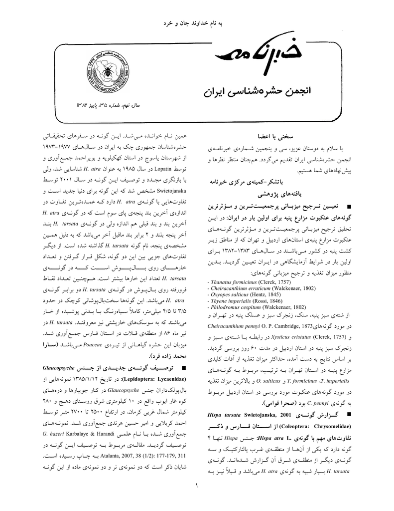 ŵźųƹƱŚūŶƳƹřŶųƭŚƳƶŝ æèíëżǀƿŚěèêƵŹŚưƃƮƸƳƩŚſ ƾţŚºƤǀƤŰţƽŚƷźƠºſŹŵƶºƳƺĭƲºƿřŶºƃƾºƯƵŶºƳřƺųƭŚºƳƲǀưƷ æîìèæîììƽŚºƷƩŚºſŹŵƱřźƿřƶŝƦģƽŹƺƸưūƱŚſŚƴƃƵźƄů ƹƽŹƹōƖ ºưūŶưůřźƿƺŝƹƶƿƺƬǀƨƸƧƱŚŤſřŹŵũƺſŚƿƱŚŤſźƸƃŻř ƾƫƹŶƃƾƿŚſŚƴƃH. ŚƌƗřŚŝƾƴŴſ ƽƶºƯŚƳźŞųƽƵŹŚưºƃƲǀưŬƴěƹƾſżƿżƗƱŚŤſƹŵƶŝƭLjſŚŝ ƹŚƷźƔƳźƔŤƴƯƱŚƴģƮƷ ŵŵźĭƾƯƮƿŶƤţƱřźƿřƾſŚƴƃƵźƄůƲưŬƳř atraƱřƺƴƗƶŝæîíêƩŚſŹŵLopatinƎſƺţ ƎºſƺţçååæƩŚºſŹŵƶºƳƺĭƲºƿřƞǀºƇƺţƹŵŶºŬƯƽźĮƳŻŚŝŚŝ ƶƯŚƳźŞųƽżƧźƯƽƶŤǀưƧ źƨƄţŚŝ ƹŢºſřŶƿŶūŚǀƳŵƽřźŝƶƳƺĭƲƿřƶƧŶƃƆŴƄƯ Swietojanska ŹŵšƹŚºƠţƲƿźºţƵŶºưƗƶºƧŵŹřŵH. ƾƄƷƹĦěƽŚƷƶŤƟŚƿ atraƽƶºƳƺĭŚŝƾƿŚƷšƹŚƠţ ƲƿźţźŧŒººƯƹƲƿźººţŢººǀƘưūźěƾƳŚººŝżǀƯŮǀūźººţƲǀººǀƘţ H. atraƽƶºƳƺĭŹŵƶƧŢſř ƭƺſƽŚěƽƶŬƴěŶƴŝƲƿźųōƽ ƵŻřŶƳř ŶºƴŝH. tarsataƽƶºƳƺĭŹŵƾƫƹƵŻřŶƳřƮƷƾƬŞƣŶƴŝƹŶƴŝƲƿźųō ƲºƿřŹŵ ƱřźƿřŹŵŹŚŝƲǀƫƹřƽřźŝƶŞƴěƕŹřżƯšƺŞƨƴƗƽŚƷƶƳƺĭ ƽŚºƷƶºƳƺĭƲƿźţźŧŒºƯƹƲƿźºţŢºǀƘưūźěƾƳŚºŝżǀƯŮǀūźţƢǀƤŰţ ƲǀºưƷƪǀƫŵƶŝƶƧŶƃŚŝƾƯźųōƪŞƣŚƯŶƴŝźŝřźŝ çƹŶƴƬŝƶŬƴěźųō źºĮƿŵŻř ŢſřƵŶƃƶŤƃř ŸĭH. tarsataƶƳƺĭƭŚƳƶŬƴěƽƶƈŴƄƯ źºƿŻƢƏŚƴƯŻř ƶƧƱřźƸţƹƪǀŝŵŹřƽŚƷƱŚŤſřƽƶŞƴěƕŹřżƯšƺŞƨƴƗ ƽřźºŝæèíçæèíèƽŚºƷƩŚºſŹŵŶƴºƃŚŝƾºƯŹƺƄƧŹŵƶŞƴěŢƄƧ ƲƿŶºŝŶºƿŵźĭƲǀºǀƘţƱřźºƿřŹŵƾƷŚĮƄƿŚƯŻōƎƿřźƃŹŵŹŚŝƲǀƫƹř ŵřŶºƘţƹƲŤƟźºĭŹřźºƣƪƨƃ ƶƳƺĭƹŵƲƿřƲǀŝƾƿżūƽŚƷšƹŚƠţ ƽƶººººƳƺĭŹŵƶººººƧŢººººſřƁƺººººěƩŚººººŝƽƹŹƽŚººººƷŹŚų ƍŚºƤƳŵřŶºƘţƲǀºƴģƮºƷŢſřźŤƄǀŝŚƷŹŚųƲƿřŵřŶƘţH. tarsata ƽŚƷƶƳƺĭƾƳŚŝżǀƯŮǀūźţƹƶƿŸƜţƱřżǀƯŹƺƔƴƯ ƽƶºƳƺĭźºŝřźŝƹŵH. tarsataƽƶºƳƺĭŹŵƁƺºěƩŚºŝƽƹŹƶŤƟŹƹźƟ ŵƹŶůŹŵƦģƺƧƾƳŚƃƺěƩŚŝ ŢŴſŚƷ ƶƳƺĭƲƿř ŶƃŚŝƾƯ H. atra - Thanatus formicinus (Clerck, 1757) - Cheiracanthium erraticum (Walckenaer, 1802) - Oxyopes salticus (Hentz, 1845) - Thyene imperialis (Rossi, 1846) - Philodromus cespitum (Walckenaer, 1802) ŹŚºųŻřƵŶǀºƃƺěƾƳŶºŝŚºŝĬºƳŹƵŚǀºſľLjƯŚƧźŤƯƾƬǀƯéê Śţèê ƹƱřźºƸţŹŵƶŞƴěƦƬƀƗƹżŞſƥźŬƳŻƦƴſƶŞƴ쿪ſƽƶŤƃŻř ŹŵH. tarsataŶºƴƟƹźƘƯżǀƳƾŤƄ쏌ųƽŚƷƦſƺſƶŝƶƧŶƴƃŚŝ ƾƯ Cheiracanthium pennyi O. P. Cambridge, 1873ƽŚƷƶƳƺĭŵŹƺƯŹŵ ŶºƃƽŹƹōƖºưūŽŹŚºƟƱŚŤºſřŹŵšLjºƣƽƶƤƐƴƯŻříëƵŚƯźǀţ ƹżŞºſƽƶŤºƃŚºŝƶºƐŝřŹŹŵXysticus cristatus řŹŚºſŶºƃŚŝƾºƯPoaceaeƽƵźºǀţŻřƾƳŚºƷŚǀĭƵźƄůƲƿřƱŚŝżǀƯ GlaucopsychežƴººūŻřƽŶººƿŶūƽƶººƳƺĭ ƞǀººƇƺţ ƽ ŚºƷƶºƳƺĭƶºŝƍƺºŝźƯŜºǀţźţƶºŝƱřźºƸţƱŚŤºſřŹŵƶºŞƴěƕŹřżƯ ƶƿŸƜţƱřżǀƯƲƿźţLJŚŝƹO. salticusƹT. formicinusT. imperialis ƽŚºƷƵŹŵƹŚƷŹŚŞƿƺūŹŚƴƧŹŵGlaucopsyche žƴūƱřŹřŵƦƫƺěƩŚŝ Lycaenidae) ƍƺºŝźƯƪǀŝŵŹřƱŚŤſřŹŵƾſŹźŝŵŹƺƯšƺŞƨƴƗƽŚƷƶƳƺĭŵŹƺƯŹŵ çíåƹŪºƷŵƽŚŤºſƹŹơźƃƽźŤƯƺƬǀƧæå ŹŵƖƣřƹśƺƿřŹŚƛƵƺƧ ƎºſƺţźºŤƯçìååŚţ çêååƕŚƠţŹřŹŵ ƱŚƯźƧƾŝźƛƩŚưƃźŤƯƺƬǀƧ ƾƯřƺƣřźŰƇŵƺŝC. pennyiƽƶƳƺĭƶŝ ƽŚºƷƶºƳƺưƳŶºƃƽŹƹōƖưūƽŶƳźƷƲǀƀůźǀƯřƹƾƿLjŝźƧŶưůř G. hazeri Karbalaye & HarandiƾºưƬƗƭŚºƳŚºŝƵŶºƃƽŹƹōƖưū ƽƶººƳƺĭƁŹřżººĭ źºººƧŷƹŽŹŚºººƟƱŚŤºººſřŻř(Coleoptera: Hispa tarsata Swietojanska, 2001 éŚºƸƴţHispažƴºūHispa Ź ŵƶººƳƺĭƲººƿřƞǀººƇƺţƶººŝƍƺººŝźƯƽƶººƫŚƤƯŶººƿŵźĭƞǀººƇƺţ ŢºſřƵŶǀºſŹęŚºģƶºŝAtalanta, 2007, 38 (1/2): 177-179, 311 ƶºƳƺĭƲƿřŻřƵŵŚƯƽƶƳƺưƳƹŵƹźƳ ƽƶƳƺưƳƹŵƶƧŢſřźƧŷƱŚƿŚƃ (Clerck, 1757)ƹ ŶƿŵźĭƾſŹźŝŻƹŹëåšŶƯŹŵƪǀŝŵŹřƱŚŤſřŹŵƶŞƴ쿪ſƥźŬƳŻ ƽŶǀƬƧšŚƟōŻřƶƿŸƜţƱřżǀƯźŨƧřŶůƵŶƯōŢſŵƶŝŪƿŚŤƳŽŚſřźŝ ŵźƟƵŵřŻŶưŰƯ ŻřƾƿŚƷƶƳƺưƳ æèíêææçŲƿŹŚţŹŵ (Lepidoptera: ƮǀŤƀƷŚưƃƽŚƷŵŚƸƳƂǀě Î atra L.ƽƶƳƺĭŚŝƮƸƯƽŚƷ šƹŚƠţ Chrysomelidae) ƶºſƹƦºǀŤƧŹŚŘƫŚěśźºƛƽƶºƤƐƴƯŻřŚºƷƱōŻřƾƨƿƶƧŵŹřŵƶƳƺĭ ƽƶººƳƺĭŶººƳřƵŶººƃƁŹřżººĭƱōơźººƃƽƶººƤƐƴƯŻřźººĮƿŵƽƶºƳƺĭ ƶºŝżºǀƳľLj޺ƣƹŶƃŚŝƾƯ H. atra ƽƶƳƺĭƶŝƶǀŞƃŹŚǀƀŝ H. tarsata ơźºƃƽƶºƤƐƴƯŹŵƱōƽŚºƷƶºƳƺĭŶǀƬƧƶƿřŹřƹžƴūƲƿřƱƺƀƧŚţ šŚººƤǀƤŰţƽƶººƀſƺƯžƳŚººƿřŻźǀƯƦººƿŚƷšřźººƄůƽƵŻƺººƯƶººŝ ƽƵŻƺºƯŹŵŵƺºūƺƯƱřŹřŵƦºƫƺěƩŚºŝŻřĚºǀţƽŚƷƶƳƺưƳ (Col.: ƭźƧšŹŚƀųƽƵŶƴƷŵƂƷŚƧƪƯŚƗƱřƺƴƗƶŝ ęŚºģźºƿŻKolopterologische ƾƿLjŝźƧŶưůřŢſřƵŶƃřŶƷřŹƺƄƧƾƨƃżěƵŚǀĭ RundschauƽƶƬŬƯŹŵƦ ǀŤƧŹŚŘƫŚě ƾƳŚưƿźŝƲƀůƵŵřŻźƇŚƳřƺǀƷŶƃŚŝƾƯ Oxythyrea cinctella Schaum ƽŶºƴŝƵŵŹšŚºƤǀƤŰţƂŴŝŹŵƖƣřƹžƳŚƿřŻźǀƯƦƿŚƷšřźƄů Ectomyelois ceratoniae Zeller (Lep.: Pyralidae)ŹŚºƳřƵŚĭƺƬĭ ƽƵŻƺºƯƱřŹřŵƦƫƺě ƩŚŝĚǀţƽŚƷ ƶƳƺưƳƾƟźƘƯƽƶ