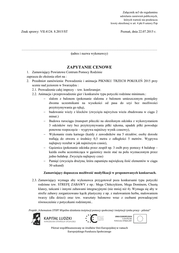 Załącznik nr3 do regulaminu udzielania zamówień publicznych, których wartość nie przekracza kwoty określonej w art. 4 pkt 8 ustawy Pzp Znak sprawy: VII.4124. 8.2015/ST Poznań, dnia 22.07.2015 r. …………………………………………………………………………………………………………… (adres i nazwa wykonawcy) ZAPYTANIE CENOWE 1. Zamawiający Powiatowe Centrum Pomocy Rodzinie zaprasza do złożenia ofert na : 2. Przedmiot zamówienia: Prowadzenie i animacja PIKNIKU TRZECH POKOLEŃ 2015 przy scenie nad jeziorem w Swarzędzu : 2.1. Prowadzenie całej imprezy – tzw. konferansjer. 2.2. Animacja i przeprowadzenie gier i konkursów typu potyczki rodzinne minimum.: slalom z balonem (pokonanie slalomu z balonem umieszczonym pomiędzy dwoma uczestnikami na wysokości od pasa do szyi bez możliwości przytrzymywania go ręką), budowanie wieży z klocków (zwycięża najwyższa wieża zbudowana w ciągu 2 minut.) Budowa rurociągu (transport piłeczki na określonym odcinku z wykorzystaniem 3 odcinków rury bez przytrzymywania piłki rękoma, upadek piłki powoduje ponowne rozpoczęcie – wygrywa najniższy wynik czasowy), Wykonanie rzutu karnego (każdy z zawodników ma 5 strzałów; osoby dorosłe trafiają do otworu o średnicy 0,5 metra z odległości 5 metrów. Wygrywa najlepszy rezultat w jak najniższym czasie), Gąsienica (pokonanie odcinka przez zespół np. 3 osób przy pomocy 4 hulahop – każda osoba uczestnicząca w gąsienicy może stać na polu wyznaczonym przez jedno hulahop. Zwycięża najlepszy czas) Pamięć (zwycięża drużyna, która zapamięta największą ilość elementów w ciągu 30 sekund) Zamawiający dopuszcza możliwość modyfikacji w proponowanych konkursach. 2.3. Zamawiający wymaga aby wykonawca przygotował poza konkursami typu potyczki rodzinne tzw. STREFĘ ZABAWY z np.: Mega Chińczykiem, Mega Dominem, Chustą klanzy, tańcami i innymi zabawami integracyjnymi (nie mniej niż 4). Wymaga się aby w strefie zabawy zorganizowano kącik plastyczny z np. z malowaniem herbu, malowaniem twarzy (dla dzieci) oraz tzw. warsztaty balonowe wraz z osobami prowadzącymi równocześnie z potyczkami rodzinnymi.. Projekt „Schematom STOP! Wspólne działania instytucji pomocy społecznej i instytucji rynku pracy - pilotaż” Pilotaż współfinansowany ze środków Unii Europejskiej w ramach Europejskiego Funduszu Społecznego 3. 4. 5. 6. 7. 8. 9. 10. 11. 2.4. Wykonawca przygotuje dla uczestników konkursów typu potyczki rodzinne nagrody za zajęcie I, II, i III miejsca w każdej z konkurencji z osobna. Nagrody muszą uwzględniać fakt, iż Piknik jest imprezą otwartą. 2.5. Dla każdego uczestnika wykonawca przygotuje tzw. słodki poczęstunek oraz drobny upominek. 2.6. Wykonawca zobowiązuje się do zapewnienia wykwalifikowanej i doświadczonej kadry prowadzącej konkurencje. 2.7. Wykonawca zobowiązuje się do zapewnienia uczestnikom pikniku ubezpieczenia od następstw nieszczęśliwych wypadków (w zakresie prowadzonych przez wykonawcę gier i zabaw) w okresie trwania pikniku. 2.8. Przewidywana ilość uczestników – ok. 300. Na ilość osób biorących udział w Pikniku mogą mieć wpływ warunki atmosferyczne. Termin realizacji: 30.08.2015 r 14:00 – 18:00. Kryteria oceny ofert : - cena za usługę – 80 pkt. - ilość przewidzianych atrakcji – 20 pkt. W kryterium cena, najwyższą ilość punktów - max. 80 otrzyma oferta, której cena będzie najniższa. W kryterium ilość przewidzianych atrakcji – największą ilość punktów - max. 20 otrzyma oferta, w której zaoferowano największą ilość atrakcji ponad minimalne określone w punktach 2.2 i 2.3. Miejsce i termin złożenia oferty : Powiatowe Centrum Pomocy Rodzinie, ul. Słowackiego 8, 60-823 POZNAŃ (I piętro) – sekretariat. Termin składania ofert: 27.07.2015 r. do godz. 10:00 Termin otwarcia ofert : 27.07.2015 r., godz. 10:15. Warunki płatności : termin płatności 30 dni. Osoba upoważniona do kontaktu z wykonawcami : Tomasz Woźnica Sposób przygotowania oferty : ofertę należy sporządzić w formie pisemnej, w języku polskim. Zamawiający informuje, że ogłoszenie nie jest postępowaniem o udzielenie zamówienia publicznego w rozumieniu ustawy Prawo zamówień publicznych i możliwa jest zmiana lub odwołanie ogłoszenia bez podania przyczyny na każdym etapie prowadzonej procedury. Niniejsze ogłoszenie nie stanowi oferty zawarcia umowy w rozumieniu Kodeksu cywilnego. Projekt „Schematom STOP! Wspólne działania instytucji pomocy społecznej i instytucji rynku pracy - pilotaż” Pilotaż współfinansowany ze środków Unii Europejskiej w ramach Europejskiego Funduszu Społecznego 12. Treść oferty (wypełnia Wykonawca) : 1. nazwa wykonawcy : ………………………………………………………………………… 2. adres wykonawcy : ………………………………………………………………………… 3. NIP : ……………………………………………………………………………………… 4. REGON : …………………………………………………………………………………… 5. oferuję wykonanie przedmiotu zamówienia za : Cena brutto łącznie za prowadzenie i animacja PIKNIKU TRZECH POKOLEŃ 2015: ……………………… zł w tym: 5.1 Przewidywane atrakcje (wymienione z osobna): ………………………………………………………………………………………………… ………………………………………………………………………….……………………… ………………………………………………………………………………………………… ………………………………………………………………………………………………… ………………………………………………………………………………………………… …………………………