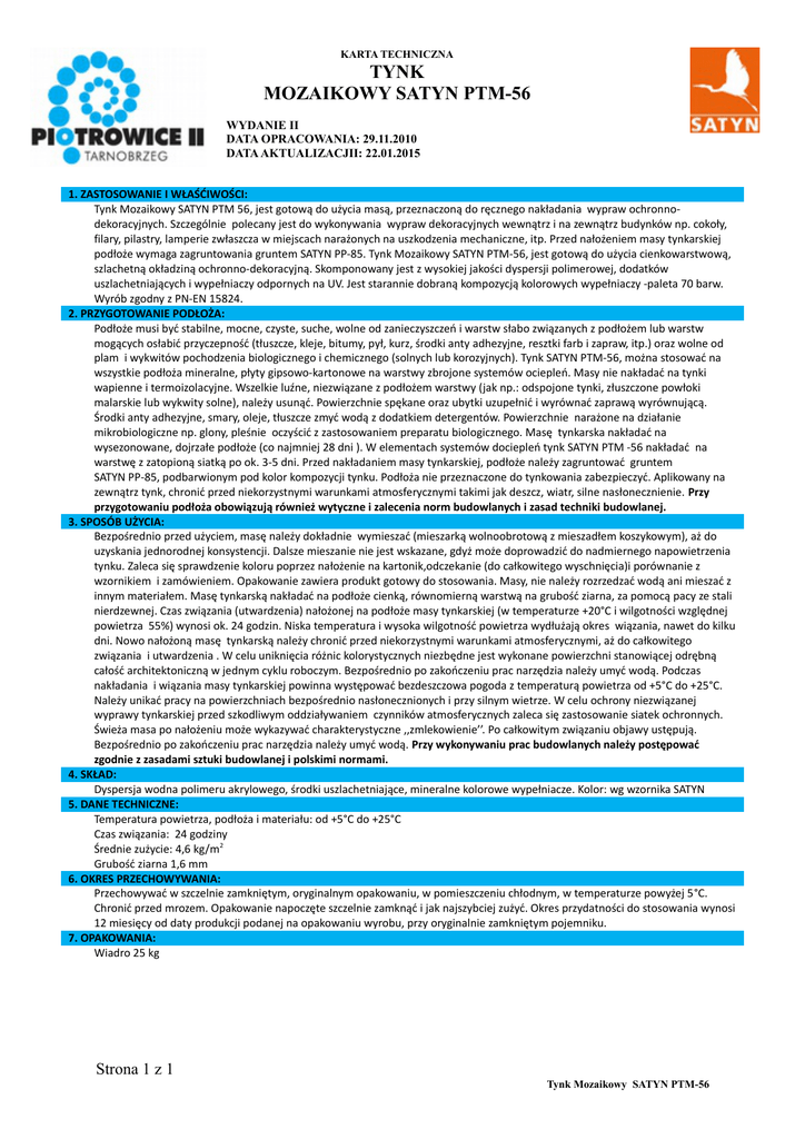 KARTA TECHNICZNA TYNK MOZAIKOWY SATYN PTM-56 WYDANIE II DATA OPRACOWANIA: 29.11.2010 DATA AKTUALIZACJII: 22.01.2015 1. ZASTOSOWANIE I WŁAŚĆIWOŚCI: Tynk Mozaikowy SATYN PTM 56, jest gotową do użycia masą, przeznaczoną do ręcznego nakładania wypraw ochronnodekoracyjnych. Szczególnie polecany jest do wykonywania wypraw dekoracyjnych wewnątrz i na zewnątrz budynków np. cokoły, filary, pilastry, lamperie zwłaszcza w miejscach narażonych na uszkodzenia mechaniczne, itp. Przed nałożeniem masy tynkarskiej podłoże wymaga zagruntowania gruntem SATYN PP-85. Tynk Mozaikowy SATYN PTM-56, jest gotową do użycia cienkowarstwową, szlachetną okładziną ochronno-dekoracyjną. Skomponowany jest z wysokiej jakości dyspersji polimerowej, dodatków uszlachetniających i wypełniaczy odpornych na UV. Jest starannie dobraną kompozycją kolorowych wypełniaczy -paleta 70 barw. Wyrób zgodny z PN-EN 15824. 2. PRZYGOTOWANIE PODŁOŻA: Podłoże musi być stabilne, mocne, czyste, suche, wolne od zanieczyszczeń i warstw słabo związanych z podłożem lub warstw mogących osłabić przyczepność (tłuszcze, kleje, bitumy, pył, kurz, środki anty adhezyjne, resztki farb i zapraw, itp.) oraz wolne od plam i wykwitów pochodzenia biologicznego i chemicznego (solnych lub korozyjnych). Tynk SATYN PTM-56, można stosować na wszystkie podłoża mineralne, płyty gipsowo-kartonowe na warstwy zbrojone systemów ociepleń. Masy nie nakładać na tynki wapienne i termoizolacyjne. Wszelkie luźne, niezwiązane z podłożem warstwy (jak np.: odspojone tynki, złuszczone powłoki malarskie lub wykwity solne), należy usunąć. Powierzchnie spękane oraz ubytki uzupełnić i wyrównać zaprawą wyrównującą. Środki anty adhezyjne, smary, oleje, tłuszcze zmyć wodą z dodatkiem detergentów. Powierzchnie narażone na działanie mikrobiologiczne np. glony, pleśnie oczyścić z zastosowaniem preparatu biologicznego. Masę tynkarska nakładać na wysezonowane, dojrzałe podłoże (co najmniej 28 dni ). W elementach systemów dociepleń tynk SATYN PTM -56 nakładać na warstwę z zatopioną siatką po ok. 3-5 dni. Przed nakładaniem masy tynkarskiej, podłoże należy zagruntować gruntem SATYN PP-85, podbarwionym pod kolor kompozycji tynku. Podłoża nie przeznaczone do tynkowania zabezpieczyć. Aplikowany na zewnątrz tynk, chronić przed niekorzystnymi warunkami atmosferycznymi takimi jak deszcz, wiatr, silne nasłonecznienie. Przy przygotowaniu podłoża obowiązują również wytyczne i zalecenia norm budowlanych i zasad techniki budowlanej. 3. SPOSÓB UŻYCIA: Bezpośrednio przed użyciem, masę należy dokładnie wymieszać (mieszarką wolnoobrotową z mieszadłem koszykowym), aż do uzyskania jednorodnej konsystencji. Dalsze mieszanie nie jest wskazane, gdyż może doprowadzić do nadmiernego napowietrzenia tynku. Zaleca się sprawdzenie koloru poprzez nałożenie na kartonik,odczekanie (do całkowitego wyschnięcia)i porównanie z wzornikiem i zamówieniem. Opakowanie zawiera produkt gotowy do stosowania. Masy, nie należy rozrzedzać wodą ani mieszać z innym materiałem. Masę tynkarską nakładać na podłoże cienką, równomierną warstwą na grubość ziarna, za pomocą pacy ze stali nierdzewnej. Czas związania (utwardzenia) nałożonej na podłoże masy tynkarskiej (w temperaturze +20°C i wilgotności względnej powietrza 55%) wynosi ok. 24 godzin. Niska temperatura i wysoka wilgotność powietrza wydłużają okres wiązania, nawet do kilku dni. Nowo nałożoną masę tynkarską należy chronić przed niekorzystnymi warunkami atmosferycznymi, aż do całkowitego związania i utwardzenia . W celu uniknięcia różnic kolorystycznych niezbędne jest wykonane powierzchni stanowiącej odrębną całość architektoniczną w jednym cyklu roboczym. Bezpośrednio po zakończeniu prac narzędzia należy umyć wodą. Podczas nakładania i wiązania masy tynkarskiej powinna występować bezdeszczowa pogoda z temperaturą powietrza od +5°C do +25°C. Należy unikać pracy na powierzchniach bezpośrednio nasłonecznionych i przy silnym wietrze. W celu ochrony niezwiązanej wyprawy tynkarskiej przed szkodliwym oddziaływaniem czynników atmosferycznych zaleca się zastosowanie siatek ochronnych. Świeża masa po nałożeniu może wykazywać charakterystyczne ,,zmlekowienie’’. Po całkowitym związaniu objawy ustępują. Bezpośrednio po zakończeniu prac narzędzia należy umyć wodą. Przy wykonywaniu prac budowlanych należy postępować zgodnie z zasadami sztuki budowlanej i polskimi normami. 4. SKŁAD: Dyspersja wodna polimeru akrylowego, środki uszlachetniające, mineralne kolorowe wypełniacze. Kolor: wg wzornika SATYN 5. DANE TECHNICZNE: Temperatura powietrza, podłoża i materiału: od +5°C do +25°C Czas związania: 24 godziny Średnie zużycie: 4,6 kg/m2 Grubość ziarna 1,6 mm 6. OKRES PRZECHOWYWANIA: Przechowywać w szczelnie zamkniętym, oryginalnym opakowaniu, w pomieszczeniu chłodnym, w temperaturze powyżej 5°C. Chronić przed mrozem. Opakowanie napoczęte szczelnie zamknąć i jak najszybciej zużyć. Okres przydatności do stosowania wynosi 12 miesięcy od daty produkcji podanej na opakowaniu wyrobu, przy oryginalnie zamkniętym pojemniku. 7. OPAKOWANIA: Wiadro 25 kg Strona 1 z 1 Tynk Mozaikowy SATYN PTM-56