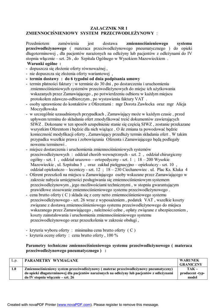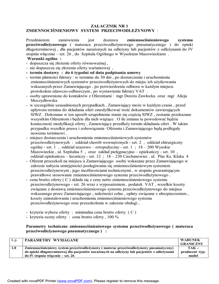 ZAŁACZNIK NR 1 ZMIENNOCIŚNIENIOWY SYSTEM PRZECIWODLEŻYNOWY : Przedmiotem zamówienia jest dostawa zmiennociśnieniowego systemu przeciwodleżynowego ( materaca przeciwodleżynowego pneumatycznego ) do opieki długoterminowej , dla pacjentów narażonych na odleżyny lub pacjentów z odleżynami do IV stopnia włącznie – szt. 26 , do Szpitala Ogólnego w Wysokiem Mazowieckiem . Warunki ogólne : - dopuszcza się złożenie oferty równoważnej , - nie dopuszcza się złożenia oferty wariantowej , - termin dostawy : do 6 tygodni od dnia podpisania umowy - termin płatności faktury : w terminie do 30 dni , po dostarczeniu i uruchomieniu zmiennociśnieniowych systemów przeciwodleżynowych do miejsc ich użytkowania wskazanych przez Zamawiającego , po potwierdzeniu odbioru w każdym miejscu protokołem zdawczo-odbiorczym , po wystawieniu faktury VAT . - osoby uprawnione do kontaktów z Oferentami : mgr Dorota Zawłocka oraz mgr Alicja Moczydłowska - w szczególnie uzasadnionych przypadkach , Zamawiający może w każdym czasie , przed upływem terminu do składania ofert zmodyfikować treść dokumentów zawierających SIWZ . Dokonane w ten sposób uzupełnienie stanie się częścią SIWZ , zostanie przekazane wszystkim Oferentom i będzie dla nich wiążące . O ile zmiana ta powodować będzie konieczność modyfikacji oferty , Zamawiający przedłuży termin składania ofert . W takim przypadku wszelkie prawa i zobowiązania Oferenta i Zamawiającego będą podlegały nowemu terminowi . - miejsce dostarczenia i uruchomienia zmiennociśnieniowych systemów przeciwodleżynowych : oddział chorób wewnętrznych - szt. 2 , oddział chirurgiczny ogólny - szt. 1 , oddział urazowo – ortopedyczny - szt. 1 ; 18 – 200 Wysokie Mazowieckie , ul. Szpitalna 5 , oraz zakład pielęgnacyjno – opiekuńczy - szt. 10 , oddział opiekuńczo – leczniczy - szt. 12 ; 18 – 230 Ciechanowiec . ul. Plac Ks. Kluka 4 - Oferent przeszkoli na miejscu u Zamawiającego osoby wskazane przez Zamawiającego w zakresie nabycia umiejętności posługiwania się zmiennociśnieniowym systemem przeciwodleżynowym , jego możliwościami technicznymi , w stopniu gwarantującym prawidłowe stosowanie zmiennociśnieniowego systemu przeciwodleżynowego . - cena brutto oferty ( C ) składa się z ceny netto zmiennociśnieniowego systemu przeciwodleżynowego - szt. 26 wraz z wyposażeniem , podatek VAT , wszelkie koszty związane z dostawą zmiennociśnieniowego systemu przeciwodleżynowego do miejsca wskazanego przez Zamawiającego , należności celne , opłaty związane z ubezpieczeniem , koszty zainstalowania i uruchomienia zmiennociśnieniowego systemu przeciwodleżynowego oraz przeszkolenia w zakresie obsługi , - kryteria wyboru oferty : minimalna cena brutto oferty ( C ) - kryteria oceny oferty : cena brutto oferty , 100 % Parametry techniczne zmiennociśnieniowego systemu przeciwodleżynowego ( materaca przeciwodleżynowego pneumatycznego ) : L.p. PARAMETRY WYMAGANE 1.0 Zmiennociśnieniowy system przeciwodleżynowy ( materac przeciwodleżynowy pneumatyczny) do opieki długoterminowej dla pacjentów narażonych na odleżyny lub pacjentów z odleżynami do IV stopnia włącznie – szt. 26 Created with novaPDF Printer (www.novaPDF.com). Please register to remove this message. WARUNEK GRANICZNY TAK – producent -typmodel 1.1 1.2 1.3 1.4 1.5 1.6 1.7 1.8 1.9 1.10 1.11 1.12 1.13 1.14 1.15 1.16 1.17 2.0 2.1 2.2 2.3 2.4 2.5 2.6 2.7 2.8 2.9 2.10 3.0 Produkt fabrycznie nowy wyprodukowany w 2007 roku Materac przeznaczony do szpitalnej opieki długoterminowej dla osób dorosłych Oferent jest podmiotem uprawnionym do wprowadzania wyrobu medycznego do obrotu i do używania zgodnie z ustawą o wyrobach medycznych z dnia 20 kwietnia 2004 r. ( Dz. U. Nr 93 , poz. 896 ) Nowoczesna konstrukcja materaca Zastosowanie nowoczesnych materiałów i technologii przyjaznych dla pacjenta Materac wykonany z trwałych materiałów zapewniających wieloletnie użytkowanie , zbudowany z poprzecznych komór o wysokości powyżej 11 cm , z funkcją transportową , dla pacjentów o wadze do 150 kg Rozmiary materaca dostosowane do standardowego łóżka szpitalnego , materac kładziony na standardowy materac szpitalny Materac odporny na mycie i dezynfekcję Pokrowiec na materac przepuszczający parę wodną i powietrze , a zatrzymujący ciecze , wykonany z dzianiny rozciągliwej we wszystkich kierunkach , zawierającego środki bakterio- i grzybobójcze , elektrostatyczny . Tkanina , z której uszyty jest pokrowiec winna być odporna na dezynfekcję termiczną ( gotowanie , suszenie , prasowanie ) w zakresie 130oC System pracy zmiennociśnieniowy . Komory umieszczone w kilkunastu rzędach winny napełniać się powietrzem i opróżniać na przemian ( co druga ) w cyklu 10 minutowym . Ciśnienie wywierane na ciało pacjenta przez materac od poziomu nie wyższego niż 15 mm Hg. do poziomu nie niższego niż - 70 mm Hg. , regulowane ręcznym manometrem w zależności od wagi i pozycji pacjenta . Materac zapewniający ciśnienie poniżej 20 mm Hg. w czasie przynajmniej 50 % cyklu pracy materaca – potwierdzić wykresem Możliwość szybkiego spuszczenia powietrza Zmiennociśnieniowa pompa powietrzna z elektronicznym systemem kontroli o wydajności > 8 litrów / minutę , zaczepy umożliwiające zawieszenie pompy na łóżku Pompa zaopatrzona w mechaniczny filtr powietrza Pompa zaopatrzona w : funkcję wyboru trybu standardowego lub zmiennego co umożliwia wprowadzenie stałego wypełnienia dla przeprowadzenia czynności medycznych i pielęgnacyjnych , sygnalizację świetlną pracy materaca , sygnalizację świetlną i dźwiękową spadku ciśnienia , sygnalizację przerwy w zasilaniu , Materac wyposażony , poza pokrowcem spełniającym częściowo funkcje redukcji sił tarcia oraz poprzecznie ścinających , w komory o kształcie zapewniającym dodatkową redukcję sił tarcia oraz poprzecznie ścinających w stosunku do komór prostych D
