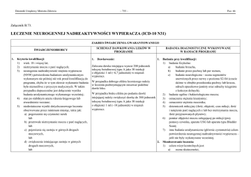 Dziennik Urzędowy Ministra Zdrowia – 755 – Poz. 66 Załącznik B.73. LECZENIE NEUROGENNEJ NADREAKTYWNOŚCI WYPIERACZA (ICD-10 N31) ZAKRES ŚWIADCZENIA GWARANTOWANEGO SCHEMAT DAWKOWANIA LEKÓW W PROGRAMIE ŚWIADCZENIOBIORCY 1. Kryteria kwalifikacji: 1) wiek: 18 i więcej lat; 2) nietrzymanie moczu z parć naglących; 3) neurogenna nadreaktywność mięśnia wypieracza (NNW) potwierdzona badaniem urodynamicznym wykonanym nie później niż rok przed kwalifikacją do programu, chyba że w tym okresie wykonanie badania było niemożliwe z przyczyn medycznych. W takim przypadku dopuszczalne jest dołączenie wyniku badania urodynamicznego wykonanego wcześniej; 4) stan po stabilnym urazie rdzenia kręgowego lub stwardnienie rozsiane; 5) niedostateczne wyniki dotychczasowego leczenia obserwowane przez minimum miesiąc, takie jak: a) pogorszenie się czynności nerek lub b) przetrwałe nietrzymanie moczu z parć naglących, lub c) pojawienie się zastoju w górnych drogach moczowych, lub d) zwiększenie istniejącego zastoju w górnych drogach moczowych, lub 1. Dawkowanie: BADANIA DIAGNOSTYCZNE WYKONYWANE W RAMACH PROGRAMU 1. Zalecana dawka inicjująca wynosi 200 jednostek toksyny botulinowej typu A jako 30 iniekcji o objętości 1 ml (~6,7 jednostek) w mięsień wypieracz. W przypadku dobrego efektu leczniczego należy w leczeniu podtrzymującym stosować podobne dawki leku. W przypadku braku efektu po podaniu dawki inicjującej należy zwiększyć dawkę do 300 jednostek toksyny botulinowej typu A jako 30 iniekcji o objętości 1 ml (~10 jednostek) w mięsień wypieracz. 2. Badania przy kwalifikacji: 1) badanie fizykalne: a) badanie brzucha, b) badanie przez pochwę lub per rectum, c) badanie neurologiczne - ocena segmentów unerwionych przez nerwy z poziomu S2-S4 (czucie skórne w obrębie przedsionka pochwy lub krocza, odruch opuszkowo-jamisty oraz odruchy ścięgniste z kończyn dolnych); 2) badanie ogólne i bakteriologiczne moczu; 3) oznaczenie stężenia kreatyniny; 4) oznaczenie stężenia mocznika; 5) dzienniczek mikcyjny (ilość, objętość, czas mikcji, ilość i natężenie parć naglących z lub bez nietrzymania moczu, ilość przyjmowanych płynów); 6) pomiar objętości moczu zalegającej po mikcji (przy pomocy cewnika, aparatu USG lub aparatu typu Bladder Scan); 7) inne badania urodynamiczne (głównie cystometria) celem potwierdzenia neurogennej nadreaktywności wypieracza – jeśli nie były wykonywane wcześniej. Monitorowanie leczenia: 1) celem wizyt kontrolnych jest: a) ocena skuteczności, Dziennik Urzędowy Ministra Zdrowia e) pojawienie się objawowych, nawracających zakażeń górnych dróg moczowych, lub nietolerancja leczenia antycholinergicznego (należy wypróbować minimum dwa leki antycholinergiczne, każdy przez minimum miesiąc): a) zaburzenia rytmu serca, b) zaburzenia pamięci, c) zaburzenia żołądkowo-jelitowe i połykania, powodujące zaburzenia odżywiania, d) zaburzenia widzenia powodujące istotne upośledzenie wzroku; 6) zgoda pacjenta na konieczność czystego przerywanego cewnikowania (CIC) w razie potrzeby; 7) negatywny wywiad w kierunku nadwrażliwości na kompleks neurotoksyny Clostridium botulinum typu A lub na którykolwiek ze składników produktu; 8) negatywny wywiad w kierunku: a) neuropatii obwodowych, b) zaburzeń przewodnictwa nerwowo-mięśniowego (myasthenia gravis, miasteniczny zespół Lamberta-Eatona); 9) niestosowanie aminoglikozydów, pochodnych kurary czy innych leków zaburzających przewodnictwo nerwowo-mięśniowe. Kryteria kwalifikacji muszą być spełnione łącznie. 2. Określenie czasu leczenia w programie: 1) leczenie trwa do czasu podjęcia przez lekarza prowadzącego decyzji o wyłączeniu świadczeniobiorcy z programu, w wyniku braku skuteczności leczenia lub zgodnie z pozostałymi kryteriami wyłączenia; 2) w sytuacji niepowodzenia terapii (pierwszego podania), podanie toksyny botulinowej można powtórzyć, – 756 – Poz. 66 ocena ewentualnych wskazań do wdrożenia samocewnikowania, c) ocena objętości moczu zalegającego po mikcji u pacjentów niecewnikowanych, d) monitorowanie w kierunku ewentualnych zakażeń dróg moczowych; 2) wizyty kontrolne według następującego schematu: a) pierwsza wizyta po 2 tygodniach (lub wcześniej, jeżeli istnieją wskazania), b) kolejne wizyty co 3 miesiące (lub wcześniej, jeżeli istnieją wskazania). b) 3. Monitorowanie programu 1) gromadzenie w dokumentacji medycznej pacjenta danych dotyczących monitorowania leczenia i każdorazowe ich przedstawianie na żądanie kontrolerów Narodowego Funduszu Zdrowia. 2) uzupełnienie danych zawartych w rejestrze (SMPT) dostępnym za pomocą aplikacji internetowej udostępnionej przez OW NFZ, z częstotliwością zgodną z opisem programu oraz na zakończenie leczenia. 3) przekazywanie informacji sprawozdawczorozliczeniowych do NFZ: informacje przekazuje się do NFZ w formie papierowej lub w formie elektronicznej, zgodnie z wymaganiami opublikowanymi przez Narodowy Fundusz Zdrowia. Dziennik Urzędowy Ministra Zdrowia 3. jednakże nie wcześniej niż po 3 miesiącach. W sytuacji niepowodzenia po dwóch kolejnych podaniach toksyny botulinowej, pacjent jest dyskwalifikowany z programu lekowego; 3) w sytuacji powodzenia terapii, podania toksyny botulinowej można powtarzać, jednakże nie częściej niż od 6 do 9 miesięcy. Kryteria wyłączenia z programu: 1) brak skuteczności leczenia definiowany jako nieuzyskanie zmniejszenia liczby epizodów nietrzymania moczu na tydzień o ≥ 50 % w stosunku do poziomu wyjściowego (ocena na podstawie dzienniczka mikcji prowadzonego przez 7 dni, nie wcześniej niż po upływie 6 tygodni i nie później niż po upływie 12 tygodni od podania toksyny botulinowej); 2) nieprowadzenie dzienniczka mikcji; 3) brak zgody lub przeciwwskazania do wykonania czystego przerywanego cewnikowania; 4) nadwrażliwość na kompleks neurotoksyny Clostridium botulinum typu A lub na którykolwiek ze składn