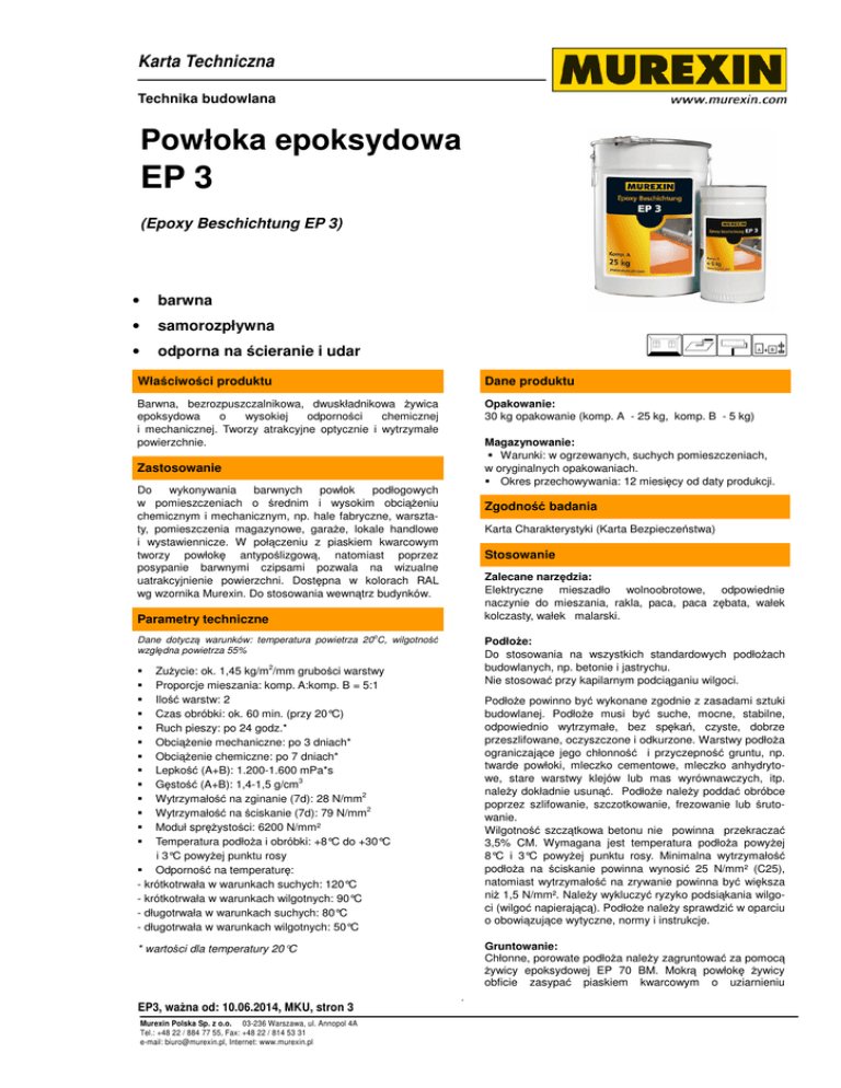 Karta Techniczna Technika BAT_EP3budowlana Powłoka epoksydowa EP 3 (Epoxy Beschichtung EP 3) • barwna • samorozpływna • odporna na ścieranie i udar Właściwości produktu Dane produktu Barwna, bezrozpuszczalnikowa, dwuskładnikowa żywica epoksydowa o wysokiej odporności chemicznej i mechanicznej. Tworzy atrakcyjne optycznie i wytrzymałe powierzchnie. Opakowanie: 30 kg opakowanie (komp. A - 25 kg, komp. B - 5 kg) Magazynowanie: Warunki: w ogrzewanych, suchych pomieszczeniach, w oryginalnych opakowaniach. Okres przechowywania: 12 miesięcy od daty produkcji. Zastosowanie Do wykonywania barwnych powłok podłogowych w pomieszczeniach o średnim i wysokim obciążeniu chemicznym i mechanicznym, np. hale fabryczne, warsztaty, pomieszczenia magazynowe, garaże, lokale handlowe i wystawiennicze. W połączeniu z piaskiem kwarcowym tworzy powłokę antypoślizgową, natomiast poprzez posypanie barwnymi czipsami pozwala na wizualne uatrakcyjnienie powierzchni. Dostępna w kolorach RAL wg wzornika Murexin. Do stosowania wewnątrz budynków. Zgodność badania Karta Charakterystyki (Karta Bezpieczeństwa) Stosowanie Zalecane narzędzia: Elektryczne mieszadło wolnoobrotowe, odpowiednie naczynie do mieszania, rakla, paca, paca zębata, wałek kolczasty, wałek malarski. Parametry techniczne Dane dotyczą warunków: temperatura powietrza 20oC, wilgotność względna powietrza 55% Podłoże: Do stosowania na wszystkich standardowych podłożach budowlanych, np. betonie i jastrychu. Nie stosować przy kapilarnym podciąganiu wilgoci. Zużycie: ok. 1,45 kg/m2/mm grubości warstwy Proporcje mieszania: komp. A:komp. B = 5:1 Ilość warstw: 2 Czas obróbki: ok. 60 min. (przy 20°C) Ruch pieszy: po 24 godz.* Obciążenie mechaniczne: po 3 dniach* Obciążenie chemiczne: po 7 dniach* Lepkość (A+B): 1.200-1.600 mPa*s Gęstość (A+B): 1,4-1,5 g/cm3 Wytrzymałość na zginanie (7d): 28 N/mm2 Wytrzymałość na ściskanie (7d): 79 N/mm2 Moduł sprężystości: 6200 N/mm² Temperatura podłoża i obróbki: +8°C do +30°C i 3°C powyżej punktu rosy Odporność na temperaturę: - krótkotrwała w warunkach suchych: 120°C - krótkotrwała w warunkach wilgotnych: 90°C - długotrwała w warunkach suchych: 80°C - długotrwała w warunkach wilgotnych: 50°C Podłoże powinno być wykonane zgodnie z zasadami sztuki budowlanej. Podłoże musi być suche, mocne, stabilne, odpowiednio wytrzymałe, bez spękań, czyste, dobrze przeszlifowane, oczyszczone i odkurzone. Warstwy podłoża ograniczające jego chłonność i przyczepność gruntu, np. twarde powłoki, mleczko cementowe, mleczko anhydrytowe, stare warstwy klejów lub mas wyrównawczych, itp. należy dokładnie usunąć. Podłoże należy poddać obróbce poprzez szlifowanie, szczotkowanie, frezowanie lub śrutowanie. Wilgotność szczątkowa betonu nie powinna przekraczać 3,5% CM. Wymagana jest temperatura podłoża powyżej 8°C i 3°C powyżej punktu rosy. Minimalna wytrzymałość podłoża na ściskanie powinna wynosić 25 N/mm² (C25), natomiast wytrzymałość na zrywanie powinna być większa niż 1,5 N/mm². Należy wykluczyć ryzyko podsiąkania wilgoci (wilgoć napierającą). Podłoże należy sprawdzić w oparciu o obowiązujące wytyczne, normy i instrukcje. Gruntowanie: Chłonne, porowate podłoża należy zagruntować za pomocą żywicy epoksydowej EP 70 BM. Mokrą powłokę żywicy obficie zasypać piaskiem kwarcowym o uziarnieniu * wartości dla temperatury 20°C EP3, ważna od: 10.06.2014, MKU, stron 3 Murexin Polska Sp. z o.o. 03-236 Warszawa, ul. Annopol 4A Tel.: +48 22 / 884 77 55, Fax: +48 22 / 814 53 31 e-mail: [email protected], Internet: www.murexin.pl 1 Karta Techniczna Technika BAT_EP3budowlana 0,4-0,8 mm (ok. 2,5 kg/m2). Po wyschnięciu żywicy luźny piasek zebrać a powierzchnię dokładnie odkurzyć. Ważne informacje Należy przestrzegać norm i wytycznych oraz zaleceń podanych w kartach technicznych. Wysoka wilgotność oraz niska temperatura powietrza mogą być przyczyną wydłużenia czasu schnięcia. Wysoka temperatura powietrza może przyczynić się do przyspieszenia schnięcia. Nie dodawać żadnych obcych materiałów. Nie spożywać. Chronić przed dziećmi. Mieszanie: Pojemniki z żywicą EP3 przed użyciem należy doprowadzić do temperatury pokojowej. Komponenty dostarczone w oryginalnych opakowaniach należy mieszać ze sobą w proporcji komp. A : komp. B = 5:1. Dokładnie wymieszać komp. A., a następnie wlać całą ilość komponentu B do pojemnika z komponentem A. Całość starannie wymieszać za pomocą mieszadła wolnoobrotowego (max 300 obrotów/min) przez ok. 2-3 minuty, aż do uzyskania jednorodnej masy. Należy zwrócić szczególną uwagę, aby całość materiału została starannie wymieszana, głównie na dnie i przy ściankach pojemnika. Żywicę przelać do czystego pojemnika i jeszcze raz starannie wymieszać. Temperatura produktów podczas mieszania nie powinna być niższa niż 12 °C. Uwaga: Po przekroczeniu dopuszczalnego czasu użycia produkt pozostawiony w pojemniku może ulec rozgrzaniu i wydzielać nieprzyjemny zapach. Ochrona pracy i ochrona środowiska: Należy przestrzegać oznaczeń na opakowaniu dotyczących bezpieczeństwa produktów oraz kart bezpieczeństwa produktu. Usuwanie odpadów: Resztki produktów należy w miarę możliwości zebrać i zużyć. Nie wylewać do kanalizacji i zbiorników wodnych. Dokładnie opróżnione puste opakowania mogą być powtórnie przerobione w procesie recyklingu. Bezpieczeństwo i higiena pracy: Przestrzegać specyfikacji oraz informacji o stosowaniu, czyszczeniu i utylizacji podanych w Karcie Charakterystyki produktu. Obróbka: Wszystkie spoiny należy zamknąć w trwale elastyczny sposób. Żywicę epoksydową bezrozpuszczalnikową EP 70 BM lub żywicę epoksydową GH 50 nałożyć na suche, odpowiednio przygotowane podłoże i poddać obróbce zgodnie z kartą techniczną. Świeżo wymieszaną żywicę EP 3 należy wylać na