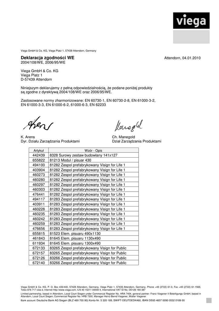 Viega GmbH & Co. KG, Viega Platz 1, 57439 Attendorn, Germany Deklaracja zgodności WE Attendorn, 04.01.2010 2004/108/WE, 2006/95/WE Viega GmbH & Co. KG Viega Platz 1 D-57439 Attendorn Niniejszym deklarujemy z pełną odpowiedzialnością, Ŝe podane poniŜej produkty są zgodne z dyrektywą 2004/108/WE oraz 2006/95/WE. Zastosowane normy zharmonizowane: EN 60730-1, EN 60730-2-8, EN 61000-3-2, EN 61000-3-3, EN 61000-6-2, 61000-6-3, EN 62233 K. Arens Dyr. Działu Zarządzania Produktami Artykuł 442439 655822 494100 403904 460273 460280 460297 460303 476441 494117 403911 460228 460235 460242 460259 476656 655815 461843 611934 672133 672157 672126 672140 Ch. Manegold Dział Zarządzania Produktami Wzór - Opis 8328 Surowy zestaw budowlany 141x127 81213 Modul / pisuar 430 81282 Zespol prefabrykowany Visign for Life 1 81282 Zespol prefabrykowany Visign for Life 1 81282 Zespol prefabrykowany Visign for Life 1 81282 Zespol prefabrykowany Visign for Life 1 81282 Zespol prefabrykowany Visign for Life 1 81282 Zespol prefabrykowany Visign for Life 1 81282 Zespol prefabrykowany Visign for Life 1 81283 Zespol prefabrykowany Visign for Life 1 81283 Zespol prefabrykowany Visign for Life 1 81283 Zespol prefabrykowany Visign for Life 1 81283 Zespol prefabrykowany Visign for Life 1 81283 Zespol prefabrykowany Visign for Life 1 81283 Zespol prefabrykowany Visign for Life 1 81283 Zespol prefabrykowany Visign for Life 1 81523 Elem. pisuaru 490x1130 81645 Elem. pisuaru 1130x490 81645 Elem. pisuaru 1300x490 83265 Zespol prefabrykowany Visign for Public 83265 Zespol prefabrykowany Visign for Public 83266 Zespol prefabrykowany Visign for Public 83266 Zespol prefabrykowany Visign for Public Viega GmbH & Co. KG, P. O. Box 430/440, 57428 Attendorn, Germany, Viega Platz 1, 57439 Attendorn, Germany, Phone +49 (2722) 61-0, Fax +49 (2722) 61-1566, Telex 876 717 viea d, Internet http://www.viega.com, ILN 40 15211 00000 4, International VAT ID No. DE126 180 387 Limited partnership, based in Attendorn, Local Court Siegen under Commercial Register No. HRA 7404, general partner: Franz Viegener II Beteiligungs GmbH, based in Attendorn, Local Court Siegen, Commercial Register No. HRB 7200, Manager Heinz-Bernd Viegener, Walter Viegener Bank account: Deutsche Bank AG Siegen (BLZ 460 700 90) Konto-Nr. 5 320 189, SWIFT-DEUTDEDK460, IBAN DE65 4607 0090 0532 0189 00 Artykuł 630980 610937 610944 610951 610968 610975 610982 610999 611002 611095 611101 631000 611019 611026 611033 611040 611057 611064 611071 611088 611118 611125 630997 609764 609771 609788 609795 609801 609818 609825 631017 609832 609849 611156 611163 611170 611194 611200 656058 Wzór - Opis 83515 Zespol prefabrykowany Visign for More 100 83515 Zespol prefabrykowany Visign for More 100 83515 Zespol prefabrykowany Visign for More 100 83515 Zespol prefabrykowany Visign for More 100 83515 Zespol prefabrykowany Visign for More 100 83515 Zespol prefabrykowany Visign for More 100 83515 Zespol prefabrykowany Visign for More 100 83515 Zespol prefabrykowany Visign for More 100 83515 Zespol prefabrykowany Visign for More 100 83515 Zespol prefabrykowany Visign for More 100 83515 Zespol prefabrykowany Visign for More 100 83516 Zespol prefabrykowany Visign for More 100 83516 Zespol prefabrykowany Visign for More 100 83516 Zespol prefabrykowany Visign for More 100 83516 Zespol prefabrykowany Visign for More 100 83516 Zespol prefabrykowany Visign for More 100 83516 Zespol prefabrykowany Visign for More 100 83516 Zespol prefabrykowany Visign for More 100 83516 Zespol prefabrykowany Visign for More 100 83516 Zespol prefabrykowany Visign for More 100 83516 Zespol prefabrykowany Visign for More 100 83516 Zespol prefabrykowany Visign for More 100 83555 Zespol prefabrykowany Visign for More 103 83555 Zespol prefabrykowany Visign for More 103 83555 Zespol prefabrykowany Visign for More 103 83555 Zespol prefabrykowany Visign for More 103 83555 Zespol prefabrykowany Visign for More 103 83555 Zespol prefabrykowany Visign for More 103 83555 Zespol prefabrykowany Visign for More 103 83555 Zespol prefabrykowany Visign for More 103 83556 Zespol prefabrykowany Visign for More 103 83556 Zespol prefabrykowany Visign for More 103 83556 Zespol prefabrykowany Visign for More 103 83556 Zespol prefabrykowany Visign for More 103 83556 Zespol prefabrykowany Visign for More 103 83556 Zespol prefabrykowany Visign for More 103 83556 Zespol prefabrykowany Visign for More 103 83556 Zespol prefabrykowany Visign for More 103 812833 Modul / pisuar 430 Viega GmbH & Co. KG, P. O. Box 430/440, 57428 Attendorn, Germany, Viega Platz 1, 57439 Attendorn, Germany, Phone +49 (2722) 61-0, Fax +49 (2722) 61-1566, Telex 876 717 viea d, Internet http://www.viega.com, ILN 40 15211 00000 4, International VAT ID No. DE126 180 387 Limited partnership, based in Attendorn, Local Court Siegen under Commercial Register No. HRA 7404, general partner: Franz Viegener II Beteiligungs GmbH, based in Attendorn, Local Court Siegen, Commercial Register No. HRB 7200, Manager Heinz-Bernd Viegener, Walter Viegener Bank account: Deutsche Bank AG Siegen (BLZ 460 700 90) Konto-Nr. 5 320 189, SWIFT-DEUTDEDK460, IBAN DE65 4607 0090 0532 0189 00