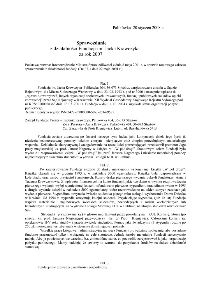 Palikówka 20 styczeń 2008 r. Sprawozdanie z działalności Fundacji im. Jacka Krawczyka za rok 2007 Podstawa prawna: Rozporządzenie Ministra Sprawiedliwości z dnia 8 maja 2001 r. w sprawie ramowego zakresu sprawozdania z działalności fundacji (Dz. U. z dnia 22 maja 2001 r.). Pkt. 1 Fundacja im. Jacka Krawczyka Palikówka 404, 36-073 Strażów, zarejestrowana została w Sądzie Rejonowym dla Miasta Stołecznego Warszawy w dniu 23. 08. 1993 r. pod nr 3906 a następnie wpisana do „rejestru stowarzyszeń, innych organizacji społecznych i zawodowych, fundacji publicznych zakładów opieki zdrowotnej” przez Sąd Rejonowy w Rzeszowie, XII Wydział Gospodarczy Krajowego Rejestru Sądowego pod nr KRS: 0000028363 dnia 17. 07. 2001 r. Fundacja w dniu 1. 10. 2004 r. uzyskała status organizacji pożytku publicznego. Numer identyfikacyjny: P-692422-95000000-59-3-963-69585. Zarząd Fundacji: Prezes – Tadeusz Krawczyk, Palikówka 404, 36-073 Strażów Z-ca Prezesa – Anna Krawczyk, Palikówka 404, 36-073 Strażów Czł. Zarz. – ks.dr Piotr Kieniewicz Lublin ul. Bazylianówka 54 B Fundacja została utworzona po śmierci naszego syna Jacka, jako kontynuacja dzieła jego życia tj. niesienia bezinteresownej pomocy ludziom chorym i cierpiącym oraz ubogim potrzebującym materialnego wsparcia. Działalność charytatywną i zaangażowanie na rzecz ludzi potrzebujących przedstawił promotor Jego pracy magisterskiej ks. prof. Janusz Nagórny w książce pt. „W pół drogi” .Statutowym celem Fundacji było wydanie i rozprowadzenie książki „W pół drogi” ks. prof. Janusza Nagórnego i niesienie materialnej pomocy najbiedniejszym świeckim studentom Wydziału Teologii KUL w Lublinie. Pkt. 2 Po zarejestrowaniu Fundacji złożono do druku maszynopis wspomnianej książki „W pół drogi”. Książka ukazała się w grudniu 1993 r. w nakładzie 3000 egzemplarzy. Książka była rozprowadzana w kościołach, oraz wśród przyjaciół i znajomych. Koszty druku pierwszego wydania pokryli fundatorzy: Anna i Tadeusz Krawczykowie. Z wpływów finansowych na konto fundacji, jakie uzyskano w wyniku rozprowadzenia pierwszego wydania wyżej wymienionej książki, ufundowano pierwsze stypendium, oraz sfinansowano w 1995 r. drugie wydanie książki w nakładzie 5000 egzemplarzy, które rozprowadzono na takich samych zasadach jak wydanie pierwsze. Stypendium otrzymała świecka studentka piątego roku teologii, wychowanka Domu Dziecka w Krośnie. Od 1994 r. stypendia otrzymują kolejni studenci. Przydzielając stypendia, (już 12 lat) Fundacja wspiera materialnie najuboższych świeckich studentów, pochodzących z rodzin wielodzietnych lub bezrobotnych, studiujących na Wydziale Teologii Moralnej KUL w Lublinie, na którym studiował również nasz Syn. Stypendia przyznawane są (w głosowaniu tajnym) przez powołaną na KUL Komisję, której (po śmierci ks. prof. Janusza Nagórnego) przewodniczy ks. dr Piotr Kieniewicz. Członkami komisji są: opiekunowie II-V roku studiów i przedstawiciele studentów. Pomoc jaką świadczymy (3 stypendia rocznie po 250 zł. miesięcznie)jest zbyt mała w stosunku do istniejących potrzeb. Wszelkie prace księgowe i administracyjne na rzecz Fundacji prowadzimy społecznie, aby posiadane fundusze przeznaczyć tylko i wyłącznie na cele statutowe. Jednak zasoby materialne Fundacji sukcesywnie maleją. Aby je powiększyć, we wrześniu b.r. zmieniliśmy statut, co pozwoliło zarejestrować ją jako organizację pożytku publicznego. Mamy nadzieję, że stworzy to warunki do pozyskania środków na dalszą działalność statutową. Pkt. 3 Fundacja nie prowadzi działalności gospodarczej. Pkt. 4 Uchwała Zarządu Fundacji z dnia 15. 10. 2007 r. W roku akademickim 2007/2008 Zarząd Fundacji postanowił przeznaczyć kwotę 6.750 zł. na trzy stypendia dla świeckich studentów Wydziału Teologii KUL w Lublinie. Stypendia w wysokości 250 zł. miesięcznie będą wypłacane kwartalnie. W październiku 2007 r. Komisja Fundacji pod przewodnictwem ks. dr Piotra Kieniewicza rozpatrzy wnioski i przyzna trzy stypendia, oraz prześle do Zarządu Fundacji protokół z posiedzenia Komisji z adresami wyróżnionych studentów. Zarząd Fundacji: Prezes Tadeusz Krawczyk Pkt. 5 W okresie sprawozdawczym przychody Fundacji wyniosły: 6.311,03 zł. w tym: - darowizny: --- wpłaty z tyt. 1%: 4747,90 zł. - odsetki: 1563,13 zł. Pkt. 6 Na cele statutowe (stypendia za I, II, IV kw. 2007 r.) wydano kwotę: 6.750,00 zł. Inne wydatki: - prowizja dla banków za prowadzenie rachunków: 85,00 zł. -opłaty pocztowe za wysyłane stypendia :22,50 zł. - zakup opłaty sądowej za sprawozdania za rok 2006: 40 zł. Pkt. 7 – Fundacja nie zatrudnia osób pobierających wynagrodzenia. – Na rachunku bankowym ulokowane są kwoty: Kredyt Bank S. A. – rachunek bankowy depozytowy : 47.588,06 zł. - Aktywa obrotowe: środki pieniężne - 47.588,06 zł. - Suma aktywów : 47.588,06 zł. Podpunkty: b, c, d, e, g, h, i, nie dotyczą naszej Fundacji. Pkt. 8 Nie dotyczy Pkt.9 Fundacja nie prowadzi żadnej działalności gospodarczej. Funkcjonuje dzięki darowiznom osób, które pragną nieść materialną pomoc najbiedniejszym świeckim studentom Wydziału Teologii KUL w Lublinie. Zgodnie z ustawą dochody Fundacji przeznaczone są wyłącznie na cele statutowe a zatem wolne od podatku. Składa do II Urzędu Skarbowego w Rzeszowie roczne zeznanie CIT-8 o wysokości osiągniętego dochodu. Urząd Skarbowy zwolnił Fundację z obowiązku składania miesięcznych deklaracji CIT-2. W okresie sprawozdawczym nie była przeprowadzana kontrola w naszej Fundacji. Z-ca Prezesa Fundacji Anna Krawczyk Prezes Fundacji Tadeusz Krawczyk