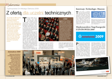 Wydarzenia Ogólnopolskie Dni Młodego Elektryka 2009 Z ofertą dla uczelni techn icznych Już od kilku lat ABB czynnie wspiera Stowarzyszenie Elektryków Polskich oraz uczelnie techniczne w Polsce przy organizowaniu Ogólnopolskich Dni Młodego Elektryka. Jako sponsor główny organizuje konkursy dla studenckich zespołów uczelnianych, fundując jednocześnie nagrodę dla zwycięskiej drużyny. W tym roku był to wyłącznik średnich napięć typu VD4, który stanie się doskonałą pomocą dydaktyczną dla studentów zwycięskiej uczelni. Fot. na kolumnach: A. Gabler/Arch. ABB; Międzynarodowe Targi Poznańskie Automaticon 2009 Tegoroczny Automaticon przyciągnął 330 wystawców, którzy zaprezentowali ofertę ponad 600 firm. Jednak zwiedzający, których liczba po raz pierwszy od wielu lat nie wzrosła, często podkreślali, że na stoiskach widać spowolnienie gospodarki. Mimo to na targach nie zabrakło największych na rynku spółek, dla których Automaticon jest swoistym wyznacznikiem branży. 4 Dzisiaj Kwiecień 2009 T egoroczne ODME odbyły się w dniach 16–19 kwietnia. Inauguracja miała miejsce w auli Politechniki Łódzkiej, gdzie zgromadziło się ponad 130 studentów z uczelni technicznych, zasłużeni pracownicy energetyki w Polsce, przedstawiciele Stowarzyszenia Elektryków Polskich, prezes SEP prof. dr hab. inż. Jerzy Barglik i prezes Naczelnej Organizacji Technicznej Ewa Mańkiewicz-Cudny. Na inaugurację przybyli też uczniowie szkół średnich zainteresowani podjęciem studiów na uczelniach technicznych. Uczestników przywitał Andrzej Szumiński, dyrektor fabryki transformatorów ABB w Łodzi, który przedstawił m.in. zakres produkcji i kierunki eksportu łódzkiej fabryki. Podczas części oficjalnej wręczono odznaczenia działaczom SEP i pracownikom energetyki oraz przyznano stypendia dla najlepszych studentów. Następnie wygłoszony został referat pt. „Łódź – transformatory wczoraj, dziś i jutro”. Po południu około 40 studentów odwiedziło fabrykę transformatorów ABB w Łodzi. Tam mieli okazję zapoznać się z działalnością firmy i zwiedzić halę produkcyjną. Szczególne wrażenie zrobiła na nich jedna z najnowocześniejszych na świecie stacja prób transformatorów mocy. Kolejne dwa dni ODME odbyły się w hotelu Wodnik położonym w sąsiedztwie elek- »ODME« U czestnictwo w ODME jest jednym z wielu sposobów współpracy ABB z uczelniami oraz bezpośrednio ze studentami, którzy stanowią bardzo aktywną część społeczności akademickiej. ABB bierze też udział w targach pracy, gdzie informuje studentów o działalności firmy, możliwości odbycia praktyk czy podjęcia pracy. Organizuje wycieczki dla studentów do swoich fabryk w Polsce, corocznie przyznaje nagrodę dla najlepszej pracy magisterskiej lub doktoranckiej, a od dwóch lat także specjalne stypendium dla studentów Akademii Górniczo-Hutniczej, finansowane przez Fundację Jürgena Dormanna. trowni Bełchatów. Tam studenci spotkali się z przedstawicielami SEP, m.in. z prof. Jerzym Barglikiem. Zwiedzili elektrownię Bełchatów i uczestniczyli w Lidze Elektryków – konkursie zorganizowanym przez przedstawicieli ABB. Zwyciężyła drużyna studentów z Politechniki Rzeszowskiej, która dla swojej uczelni wygrała wyłącznik VD4 ufundowany przez ABB. Studenci mieli też okazję zapoznać się z bogatą ofertą praktyk i współpracy z uczelniami prezentowaną przez Departament Zarządzania Zasobami Ludzkimi ABB. Andrzej Gabler Innowacje–Technologie–Maszyny T argi ITM Polska to największe w kraju targi nowoczesnych technologii dla przemysłu. W ubiegłorocznej edycji wzięło udział blisko 1400 wystawców z 34 krajów. Z ekspozycją zapoznało się ponad 20 tysięcy specjalistów z Polski i zagranicy. W 2009 roku impreza odbędzie się w dniach 16–19 czerwca. Honorowy patronat nad targami sprawują minister gospodarki oraz minister nauki i szkolnictwa wyższego. Targowe hale będzie można zwiedzać w godzinach 9.00–17.00. ABB zaprezentuje swoją ofertę w Salonie Obrabiarek i Narzędzi MACH-TOOL, zlokalizowanym w pawilonie 3A, na terenie Międzynarodowych Targów Poznańskich, przy ul. Głogowskiej 14. Międzynarodowe Targi Energetyki EXPOPOWER 2009 P rzed nami trzecia już edycja Międzynarodowych Targów Energetyki EXPOPOWER 2009. Impreza zostanie zorganizowana w dniach 19–21 maja na terenie Międzynarodowych Targów Poznańskich. Zainteresowani udziałem w wydarzeniu są wiodący reprezentanci branży energetycznej i elektrotechnicznej. ABB zaprezentuje swoją ofertę na stoisku nr 28 w pawilonie 7 (codziennie w godz. 9–17). Ciekawie zapowiadają się towarzyszące targom „Dni z ABB”, czyli cykl seminariów technicznych. Specjaliści firmy przedstawią nowoczesne rozwiązania z zakresu terminali zabezpieczeniowych i systemów sterowania dla stacji WN, technologii HVDC czy transformatorów blokowych oraz dynamicznych układów kompensacji dla farm wiatrowych i sieci energetycznych FACTS. Spotkania odbędą się w sali EF w pawilonie 7. Ubiegłoroczna edycja EXPOPOWER zgromadziła dwukrotnie więcej wystawców niż premiera targów dwa lata temu. W tym roku organizatorzy spodziewają się równie dobrej frekwencji. Kwiecień 2009 Dzisiaj 5