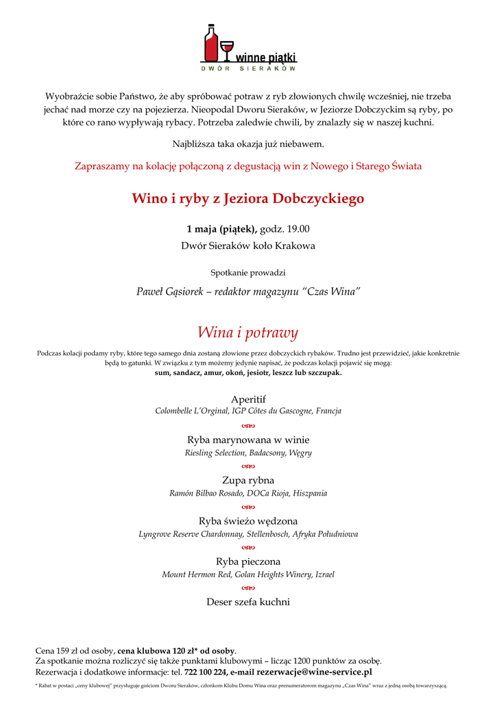 Wyobraźcie sobie Państwo, że aby spróbować potraw z ryb złowionych chwilę wcześniej, nie trzeba jechać nad morze czy na pojezierza. Nieopodal Dworu Sieraków, w Jeziorze Dobczyckim są ryby, po które co rano wypływają rybacy. Potrzeba zaledwie chwili, by znalazły się w naszej kuchni. Najbliższa taka okazja już niebawem. Zapraszamy na kolację połączoną z degustacją win z Nowego i Starego Świata Wino i ryby z Jeziora Dobczyckiego 1 maja (piątek), godz. 19.00 Dwór Sieraków koło Krakowa Spotkanie prowadzi Paweł Gąsiorek – redaktor magazynu “Czas Wina” Wina i potrawy Podczas kolacji podamy ryby, które tego samego dnia zostaną złowione przez dobczyckich rybaków. Trudno jest przewidzieć, jakie konkretnie będą to gatunki. W związku z tym możemy jedynie napisać, że podczas kolacji pojawić się mogą: sum, sandacz, amur, okoń, jesiotr, leszcz lub szczupak. Aperitif Colombelle L’Orginal, IGP Côtes du Gascogne, Francja Ryba marynowana w winie Riesling Selection, Badacsony, Węgry Zupa rybna Ramón Bilbao Rosado, DOCa Rioja, Hiszpania Ryba świeżo wędzona Lyngrove Reserve Chardonnay, Stellenbosch, Afryka Południowa Ryba pieczona Mount Hermon Red, Golan Heights Winery, Izrael Deser szefa kuchni Cena 159 zł od osoby, cena klubowa 120 zł* od osoby. Za spotkanie można rozliczyć się także punktami klubowymi – licząc 1200 punktów za osobę. Rezerwacja i dodatkowe informacje: tel. 722 100 224, e-mail [email protected] * Rabat w postaci „ceny klubowej” przysługuje gościom Dworu Sieraków, członkom Klubu Domu Wina oraz prenumeratorom magazynu „Czas Wina” wraz z jedną osobą towarzyszącą.