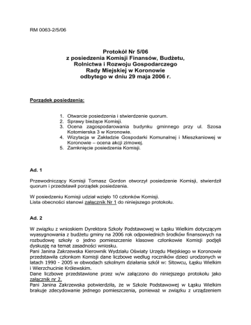 RM 0063-2/5/06 Protokół Nr 5/06 z posiedzenia Komisji Finansów, Budżetu, Rolnictwa i Rozwoju Gospodarczego Rady Miejskiej w Koronowie odbytego w dniu 29 maja 2006 r. Porządek posiedzenia: 1. Otwarcie posiedzenia i stwierdzenie quorum. 2. Sprawy bieżące Komisji. 3. Ocena zagospodarowania budynku gminnego przy ul. Szosa Kotomierska 3 w Koronowie. 4. Wizytacja w Zakładzie Gospodarki Komunalnej i Mieszkaniowej w Koronowie – ocena akcji zimowej. 5. Zamknięcie posiedzenia Komisji. Ad. 1 Przewodniczący Komisji Tomasz Gordon otworzył posiedzenie Komisji, stwierdził quorum i przedstawił porządek posiedzenia. W posiedzeniu Komisji udział wzięło 10 członków Komisji. Lista obecności stanowi załącznik Nr 1 do niniejszego protokołu. Ad. 2 W związku z wnioskiem Dyrektora Szkoły Podstawowej w Łąsku Wielkim dotyczącym wyasygnowania z budżetu gminy na 2006 rok odpowiednich środków finansowych na rozbudowę szkoły o jedno pomieszczenie klasowe członkowie Komisji podjęli dyskusję na temat zasadności wniosku. Pani Janina Zakrzewska Kierownik Wydziału Oświaty Urzędu Miejskiego w Koronowie przedstawiła członkom Komisji dane liczbowe według roczników dzieci urodzonych w latach 1990 - 2005 w obwodach szkolnym działania szkół w: Sitowcu, Łąsku Wielkim i Wierzchucinie Królewskim. Dane liczbowe przedstawione przez w/w załączono do niniejszego protokołu jako załącznik nr 2. Pani Janina Zakrzewska potwierdziła, że w Szkole Podstawowej w Łąsku Wielkim brakuje zdecydowanie jednego pomieszczenia, ponieważ w związku z urządzeniem pracowni komputerowej (otrzymaliśmy 10 komputerów + 1 komputer dla nauczyciela + serwer) pracownię urządzono w pokoju nauczycielskim. W chwili obecnej warunki lokalowe, jeśli chodzi o pokój nauczycielski są fatalne. W takich warunkach nauczyciele pracować nie mogą. Burmistrz Koronowa Zygmunt Michalak – Na dzień dzisiejszy poszukujemy środków finansowych, aby rozpocząć rozbudowę szkoły w Wierzchucinie. Planujemy, że w związku z tą rozbudową dzieci z Wiskitna znalazłyby miejsce w Wierzchucienie Królewskim. Planujemy, że szkoła w Łąsku Wielkim będzie szkołą dla klas I – IV. Na dzień dzisiejszy brakuje pomieszczenia na pokój nauczycielski. Radny Włodzimierz Glonek – Żeby nie było rozbudowy w Łąsku Wielkim, czy teraz jest możliwość umieszczenia dzieci w Wierzchucinie Królewskim lub Sitowcu? Pani Janina Zakrzewska – My musimy liczyć się z opinią rodziców, czy można tak przerzucać dzieci? Radny Czesław Januszewski – Nie można tak dzieci przenosić, jak mówi Pani Kierownik z miejsca na miejsce. Myślę, że należy to jedno pomieszczenie pobudować. Nie wiadomo, kiedy rozbudowa szkoły w Wierzchucinie Królewskim będzie rozpoczęta. Radna Maria Kulczyk – A skąd wziąć środki? Skarbnik Gminy Pani Aleksandra Szyszka – Można wziąć kredyt. Radny Marian Januszewskiego. Kuropatwiński – Podzielam stanowisko kolegi Czesława Radny Wojciech Radgowski – Ja również przychylam się do sugestii radnego Czesława Januszewskiego. Radny Tadeusz Klonowski – Jestem za i za zaciągnięciem kredytu na ten cel. Radna Anna Zwara – Jestem za, rozumiem te dzieci, bo sama byłam uczennicą dojeżdżającą. Radna Maria Kulczyk – Jestem za, również, jeśli jest możliwość, popieram zaciągnięcie kredytu. Radny Włodzimierz Glonek – Nie jestem do końca przekonany, o tym powinna zadecydować następna Rada. Pani Janina Zakrzewska – Sale lekcyjne w Sitowcu liczą do 20 dzieci, jak dojdzie 8 - 9 dzieci to te klasy będą za małe. Członkowie Komisji 8 głosami „za”, przy 1 głosie „wstrzymującym się” wyrazili opinie, że na rozbudowę Szkoły Podstawowej w Łąsku Wielkim należy zaciągnąć kredyt bankowy. Na posiedzenie Komisji przybył radny Stanisław Gliszczyński. W dalszej części posiedzenia Komisji Skarbnik Gminy P. Aleksandra Szyszka przedstawiła projekty uchwał, które będą przedmiotem obrad XLIII sesji rady Miejskiej w Koronowie w dniu 31 maja 2006 r. i tak: 1. Projekty uchwały zmieniającej Uchwałę Nr XXXVIII/438/05 Rady Miejskiej w Koronowie w sprawie uchwalenia budżetu gminy na 2006 rok. 2. Projekt uchwały uchylającej Uchwałę Nr XL/466/06 Rady Miejskiej w Koronowie z dnia 22 lutego 2006 roku w sprawie zaciągnięcia kredytu bankowego na realizację projektu z odnowy wsi pn.: „Modernizacja budynku Wiejskiego Domu Kultury w Wierzchucinie Królewskim”. 3. Projekt uchwały uchylającej Uchwałę Nr XLII/490/06 Rady Miejskiej w Koronowie z dnia 26 kwietnia 2006 roku w sprawie zaciągnięcia kredytu bankowego na prefinansowanie zadania pn.: Kanalizacja sanitarna w Mąkowarsku – III etap”. 4. Projekt uchwały uchylającej w części Uchwałę Nr XLII/489/06 Rady Miejskiej w Koronowie z dnia 26 kwietnia 2006 roku w sprawie zaciągnięcia kredytu bankowego na realizację i prefinansowanie zadania pn.: „Budowa pieszo jezdni w Pieczyskach.” Członkowie Komisji nie wnieśli uwag do w/w projektów uchwał. Ad. 3 Członkowie Komisji udali się do budynku gminnego przy ul. Szosa Kotomierska 3 w Koronowie celem dokonania oceny zagospodarowania budynku. Ad. 4. Członkowie Komisji wizytowali Zakład Gospodarki Komunalnej i Mieszkaniowej w Koronowie i dokonali oceny przebiegu akcji zimowej 2005/2006. Na tym protokół zakończono. Protokół sporządziła Adela Rojek Przewodniczący Komisji Tomasz Gordon