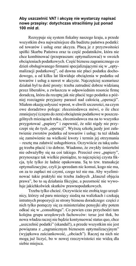 Aby uszczelnić VAT i akcyzę nie wystarczy napisać nowe przepisy: dotychczas straciliśmy już ponad 100 mld zł. Rozsypuje się system fiskalny naszego kraju, a przede wszystkim dwa najważniejsze dla budżetu państwa podatki: od towarów i usług oraz akcyza. Płacą je z przyzwoitości spółki Skarbu Państwa oraz ta część podatników, która nie chce kombinować (przepraszam: optymalizować) w swoich obciążeniach podatkowych. Część biznesu zagranicznego co dzień obsługiwanego firmami specjalizującymi się w „optymalizacji podatkowej”, od dawna nie płaci podatku dochodowego, a od kilku lat likwiduje obciążenia w podatku od towarów i usług a nawet w akcyzie. Najczęściej scenariusz działań był tu dość prosty: trzeba zatrudnić dobrze widzianą przez liberałów, a zwłaszcza w odpowiednim resorcie firmę doradczą, która da receptę jak nie płacić tego podatku a później rozciągnie przyjazny parasol nad całością „operacji”. Miałem okazję usłyszeć wprost, w chwili szczerości, na czym owe doradztwo polega: zleceniodawca mówi, o ile chce zmniejszyć (często do zera) obciążenie podatkowe w poszczególnych miesiącach roku, zleceniodawca ma na to wszystko przygotować „papiery” i zapewnić, że nikt nigdy nie przyczepi się do tych „operacji”. Wyższą szkołą jazdy jest załatwienie zwrotów podatku od towarów i usług: tu też składa się zamówienie na wielkość kwoty i termin jej otrzymania – resztę ma załatwić usługobiorca. Oczywiście za taką usługę trzeba płacić i to dobrze. Wiadomo, że zwykły śmiertelni nie odważyłby się na coś takiego. Przecież owe „papiery”, przynoszące tak wielkie pieniądze, to najczęściej czysta fikcja, tyle tylko że ładnie opakowana. Są to tzw. transakcje optymalizacyjne, czyli ja sprzedam nic komuś, kogo nie ma, on za to zapłaci mi czymś, czego też nie ma. Aby wyeliminować takie praktyki nie trzeba żadnych „klauzul objęcia prawa”, bo to są działania fikcyjne, a pozorność nie wywołuje jakichkolwiek skutków prawnopodatkowych. Trzeba tylko chcieć. Oczywiście nie zrobią tego urzędnicy, którzy od paru miesięcy siedzą na walizkach i czekają intratnych propozycji ze strony biznesu doradczego: części z nich tylko pomęczy się za ministerialne pensyjki aby potem odkuć się w „consultingu”. Co pewien czas przychodzi tam kolejna grupa urzędowych fachowców: teraz jest tłok, bo nowa władza raczej nie będzie kontynuować status quo, chce „uszczelnić podatki” (skandal!), a przede wszystkim nie jest powiązana z „zagranicznym biznesem optymalizacyjnym” (wyjątkowa zaściankowość, „obciach”). Raczej na nich nie mogą już liczyć, bo w nowej rzeczywistości nie widzą dla siebie miejsca. Zresztą sam sposób zarządzania tymi podatkami jest dziwny z istoty, bo ich interpretacjami rządzą niezależne izby skarbowe, podległe jednemu z wiceministrów, kontrolę całości odrębne urzędy kontroli skarbowej, podległe innemu wiceministrowi, a przepisy pisze (przynajmniej formalnie) jeszcze inny departament podległy jeszcze innemu wiceministrowi. Czy to, kto chce ratować te podatki, może w takim bajzlu zrobić coś sensownego? Żadnych szans. Najlepiej gdyby powołano pełnomocnika rządu, który będzie kierować oraz nadzorować działania ratunkowe dotyczące tych podatków na wszystkich szczeblach administracji rządowej. Oczywiście całość legislacji należy wyprowadzić z tych patologicznych struktur, bo tam rządzą dziwne układy „koleżeńskie” relacje, a przede wszystkim znajomości z byłymi urzędnikami, którzy już przeszli do biznesu optymalizacyjnego. Nawet gdy szczelnie zatrzaśnie się przed nimi drzwi wszystkich politycznych i ministerialnych gabinetów (co jest chyba postanowione), to pozostaną relacje nieformalne, równie groźne dla interesu publicznego, a może nawet bardziej. Warto sobie uświadomić, że przez ów patologiczny sposób rządzenia systemem podatkowym budżet stracił (a ktoś zarobił) w ciągu ostatnich ośmiu lat minimum 90 mld zł w podatku od towarów i usług. Ile w akcyzie? To trudne do oszacowania, ale idzie tu też o co najmniej 15 mld zł.