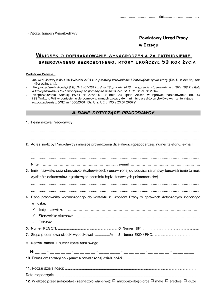 ........................................., dnia .................................... ........................................................... (Pieczęć firmowa Wnioskodawcy) Powiatowy Urząd Pracy w Brzegu W NIOSEK O DOFIN ANSOWANIE WYN AGRODZENIA ZA Z ATRUDNIENIE SKIEROWANEGO BEZROBOTNEGO , KTÓRY UKOŃCZYŁ 50 ROK ŻYCIA Podstawa Prawna: - art. 60d Ustawy z dnia 20 kwietnia 2004 r. o promocji zatrudnienia i instytucjach rynku pracy (Dz. U. z 2015r., poz. 149 z późn. zm.), Rozporządzenie Komisji (UE) Nr 1407/2013 z dnia 18 grudnia 2013 r. w sprawie stosowania art. 107 i 108 Traktatu o funkcjonowaniu Unii Europejskiej do pomocy de minimis /Dz. UE L 352 z 24.12.2013/ Rozporządzenia Komisji (WE) nr 875/2007 z dnia 24 lipiec 2007r. w sprawie zastosowania art. 87 i 88 Traktatu WE w odniesieniu do pomocy w ramach zasady de mini mis dla sektora rybołówstwa i zmieniające rozporządzenie z (WE) nr 1860/2004 (Dz. Urz. UE L 193 z 25.07.2007)* A. DANE DOTYCZĄCE PRACODAWCY 1. Pełna nazwa Pracodawcy : ........................................................................................................................................................ ........................................................................................................................................................ 2. Adres siedziby Pracodawcy i miejsce prowadzenia działalności gospodarczej, numer telefonu, e-mail ........................................................................................................................................................ ........................................................................................................................................................ Nr tel. ……………………………………………………… e-mail: ……………………………………...…………. 3. Imię i nazwisko oraz stanowisko służbowe osoby uprawnionej do podpisania umowy (upoważnienie to musi wynikać z dokumentów rejestrowych podmiotu bądź stosownych pełnomocnictw) ........................................................................................................................................................ ........................................................................................................................................................ 4. Dane pracownika wyznaczonego do kontaktu z Urzędem Pracy w sprawach dotyczących złożonego wniosku: Imię i nazwisko: ………………………………………………………………………………………………… Stanowisko służbowe: ……………………………………………………………………………………….… Telefon: ………………………………………………………………………………………………………….. 5. Numer REGON: ........................................................... 6. Numer NIP: ........................................................ 7. Stopa procentowa składki wypadkowej ...............% 8. Numer EKD / PKD: ............................................. 9. Nazwa banku i numer konta bankowego ................................................................................................... Nr __ __ - __ __ __ __ - __ __ __ __ - __ __ __ __ - __ __ __ __ - __ __ __ __ - __ __ __ __ 10. Forma organizacyjno - prawna prowadzonej działalności ……………………………………………………... 11. Rodzaj działalności: ..................................................................................................................................... Data rozpoczęcia ............................................................................................................................................... 12. Wielkość przedsiębiorstwa (zaznaczyć właściwe): mikroprzedsiębiorca małe średnie duże A1. Zatrudnienie w przeliczeniu na pełny wymiar czasu pracy w okresie ostatnich 12 miesięcy przed złożeniem wniosku, a w przypadku prowadzenia działalności przez krótszy okres należy podać zatrudnienie w poszczególnych miesiącach prowadzenia działalności gospodarczej: Miesiąc/rok Ogółem Liczba pracowników w przeliczeniu na pełne etaty∗ Liczba osób, z którymi rozwiązano stosunek pracy 1. Średni stan zatrudnienia w przeliczeniu na pełne etaty z okresu ostatnich 12 miesięcy przed złożeniem wniosku wynosi........................osób. 2. Stan zatrudnienia na dzień złożenia wniosku w przeliczeniu na pełne etaty wynosi ...........................osób. 3. W przypadku zmniejszenia stanu zatrudnienia proszę podać przyczynę: ………………………………………………………………………………………………………………………………… ………………………………………………………………………………………………………………………………… B. DANE DOTYCZĄCE SKIEROWANIA I ZATRUDNIENIA BEZROBOTNYCH 1. Wnioskuję o dofinansowanie wynagrodzenia za zatrudnienie osób bezrobotnych w pełnym wymiarze czasu pracy na okres (właściwe zaznaczyć x): 12 miesięcy – w przypadku zatrudnienia bezrobotnego, który ukończył 50 lat, a nie ukończył 60 lat, warunek dalszego zatrudnienia w ramach własnych środków pracodawcy po zakończonym okresie dofinansowania wynosi 6 miesięcy 24 miesięcy - w przypadku zatrudnienia bezrobotnego, który ukończył 60 lat, warunek dalszego zatrudnienia w ramach własnych środków pracodawcy po zakończonym okresie dofinansowania wynosi 12 miesięcy Lp. * Nazwa stanowiska Liczba osób bezrobotnych proponowanych do zatrudnienia Wysokość proponowanego wynagrodzenia miesięcznego brutto dla jednego skierowanego bezrobotnego 1. 2. 3. 2. Ewentualne dane kandydata do zatrudnienia w ramach dofinansowania (imię i nazwisko, adres zameldowania oraz PESEL): ……………………………………………………………………