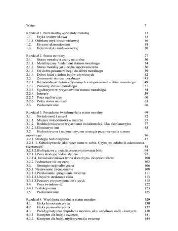 Wstęp 7 Rozdział 1. Poza ludzką wspólnotę moralną 1.1. Etyka środowiskowa 1.1.1. Odmiany etyki środowiskowej 1.2. Etyczny ekstensjonizm 1.3. Holizm etyki środowiskowej 13 13 16 18 20 Rozdział 2. Status moralny 2.1. Status moralny a cechy naturalne 2.1.1. Metafizyczny fundament statusu moralnego 2.1.2. Status moralny jako cecha superwenientna 2.1.3. Od dobra pozamoralnego do dobra moralnego 2.1.4. Dobro ludzi a dobro bytów ożywionych 2.2. Zmienność statusu moralnego 2.2.1. Różnorodność bytów ożywionych a stopniowanie statusu moralnego 2.2.2. Poziomy statusu moralnego 2.2.3. Egalitaryzm w przyznawaniu statusu moralnego 2.2.4. Interesy 2.2.5. Poza egalitaryzm 2.2.6 Pełny status moralny 2.3. Podsumowanie 27 30 34 36 39 42 45 49 51 54 59 60 63 66 Rozdział 3. Posiadanie świadomości a status moralny 69 3.1. Świadomość i umysł 72 3.1.1. Miejsce świadomości w naturze 75 3.1.2. Redukcjonistyczne wyjaśnianie świadomości, luka eksplanacyjna 77 3.1.2.1.Eliminatywizm 83 3.2. Hedonistyczna i racjonalistyczna strategia przypisywania statusu moralnego 86 3.2.1. Strategia hedonistyczna 87 3.2.1. 1. Subiektywność jako rzecz sama w sobie. Czym jest zdolność odczuwania (sentience)? 88 3.2.1.2.Biologiczne a metafizyczne pojmowanie bólu 94 3.2.1.3.Poza strategię hedonistyczna 97 3.2.1.4. Doświadczeniowa teoria dobrobytu- eksperientalizm 100 3.2.2. Podmiotowość zwierząt 102 3.3. Strategia racjonalistyczna 106 3.3.1. Nastawienie intencjonalne 108 3.3.1.1.Przekonania i pragnienia zwierząt 111 3.3.1.2.Umysł w strukturze ciała 113 3.3.1.3.Postawy propozycjonalne a język 115 3.4. Poza świadomość 122 3.4.1. Perfekcjonizm 123 3.5. Podsumowanie 125 Rozdział 4. Wspólnota moralna a status moralny 4.1. Etyka homocentryczna 4.2. Etyka personalistyczna 4.3. Paradygmatyczna wspólnota moralna jako wspólnota osób - kantyzm 4.3.1 Kantyzm dla ludzi i zwierząt 4.3.2. Kantyzm dla ludzi, utylitaryzm dla zwierząt 129 130 132 138 141 144 4.3.3. Teoria umowy społecznej a status moralny istot pozaludzkich 4.4. Współczesny kontraktualizm 4.4.1. Sytuacja początkowa (pierwotna) 4.4.2. Autonomia. Osoba moralna 4.4.3. Istoty pozaludzkie 4.4.4. Kryteria przynależności do wspólnoty moralnej 4.4.5. Status przypadków marginalnych 4.4.6. Przypadki marginalne a prawa zwierząt 4.5. Podatność na cierpienie jako fundament wspólnoty moralnej 4.6 Kontraktualizm a dwie płaszczyzny myślenia moralnego 4.6.1. Stabilność społeczna i równia pochyła 4.7. Wspólnota biotyczna 4.8. Podsumowanie 150 156 158 159 161 164 165 168 174 179 182 184 187