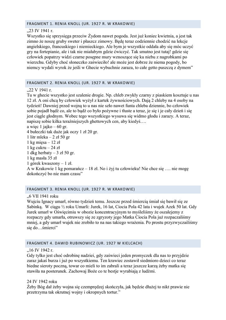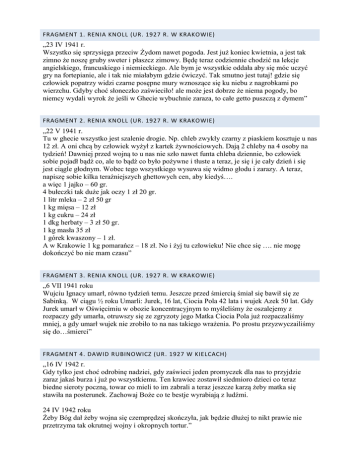 FRAGMENT 1. RENIA KNOLL (UR. 1927 R. W KRAKOWIE) „23 IV 1941 r. Wszystko się sprzysięga przeciw Żydom nawet pogoda. Jest już koniec kwietnia, a jest tak zimno że noszę gruby sweter i płaszcz zimowy. Będę teraz codziennie chodzić na lekcje angielskiego, francuskiego i niemieckiego. Ale bym je wszystkie oddała aby się móc uczyć gry na fortepianie, ale i tak nie miałabym gdzie ćwiczyć. Tak smutno jest tutaj! gdzie się człowiek popatrzy widzi czarne posępne mury wznoszące się ku niebu z nagrobkami po wierzchu. Gdyby choć słoneczko zaświeciło! ale może jest dobrze że niema pogody, bo niemcy wydali wyrok że jeśli w Ghecie wybuchnie zaraza, to całe getto puszczą z dymem” FRAGMENT 2. RENIA KNOLL (UR. 1927 R. W KRAKOWIE) „22 V 1941 r. Tu w ghecie wszystko jest szalenie drogie. Np. chleb zwykły czarny z piaskiem kosztuje u nas 12 zł. A oni chcą by człowiek wyżył z kartek żywnościowych. Dają 2 chleby na 4 osoby na tydzień! Dawniej przed wojną to u nas nie szło nawet funta chleba dziennie, bo człowiek sobie pojadł bądź co, ale to bądź co było pożywne i tłuste a teraz, je się i je cały dzień i się jest ciągle głodnym. Wobec tego wszystkiego wysuwa się widmo głodu i zarazy. A teraz, napiszę sobie kilka teraźniejszych ghettowych cen, aby kiedyś…. a więc 1 jajko – 60 gr. 4 bułeczki tak duże jak oczy 1 zł 20 gr. 1 litr mleka – 2 zł 50 gr 1 kg mięsa – 12 zł 1 kg cukru – 24 zł 1 dkg herbaty – 3 zł 50 gr. 1 kg masła 35 zł 1 górek kwaszony – 1 zł. A w Krakowie 1 kg pomarańcz – 18 zł. No i żyj tu człowieku! Nie chce się …. nie mogę dokończyć bo nie mam czasu” FRAGMENT 3. RENIA KNOLL (UR. 1927 R. W KRAKOWIE) „6 VII 1941 roku Wujciu Ignacy umarł, równo tydzień temu. Jeszcze przed śmiercią śmiał się bawił się ze Sabinką. W ciągu ½ roku Umarli: Jurek, 16 lat, Ciocia Pola 42 lata i wujek Azek 50 lat. Gdy Jurek umarł w Oświęcimiu w obozie koncentracyjnym to myśleliśmy że oszalejemy z rozpaczy gdy umarła, otruwszy się ze zgryzoty jego Matka Ciocia Pola już rozpaczaliśmy mniej, a gdy umarł wujek nie zrobiło to na nas takiego wrażenia. Po prostu przyzwyczailiśmy się do…śmierci” FRAGMENT 4. DAWID RUBINOWICZ (UR. 1927 W KIELCACH) „16 IV 1942 r. Gdy tylko jest choć odrobinę nadziei, gdy zaświeci jeden promyczek dla nas to przyjdzie zaraz jakaś burza i już po wszystkiemu. Ten krawiec zostawił siedmioro dzieci co teraz biedne sieroty poczną, towar co mieli to im zabrali a teraz jeszcze karzą żeby matka się stawiła na posterunek. Zachowaj Boże co te bestje wyrabiają z ludźmi. 24 IV 1942 roku Żeby Bóg dał żeby wojna się czemprędzej skończyła, jak będzie dłużej to nikt prawie nie przetrzyma tak okrutnej wojny i okropnych tortur.”