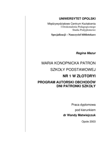 UNIWERSYTET OPOLSKI Mi dzywydziałowe Centrum Kształcenia I Doskonalenia Pedagogicznego Studia Podyplomowe Specjalizacji – Nauczyciel bibliotekarz Regina Mazur MARIA KONOPNICKA PATRON SZKOŁY PODSTAWOWEJ NR 1 W ZŁOTORYI PROGRAM AUTORSKI OBCHODÓW DNI PATRONKI SZKOŁY Praca dyplomowa pod kierunkiem dr Wandy Matwiejczuk Opole 2003 PROGRAM AUTORSKI OBCHODÓW „DNI PATRONKI SZKOŁY” SPIS TRE CI Wst p ........................................................................................... 2 Rozdział I Zarys historyczny Szkoły Podstawowa nr 1 im. M. Konopnickiej w Złotoryi ......................................... 4 Rozdział II Sylwetka Marii Konopnickiej ............................................. 9 Rozdział III wi to Patronki Szkoły ..................................................... 12 - Dzie Pierwszy ......................................................... 13 - Dzie Drugi .............................................................. 17 - Dzie Trzeci ............................................................. 22 - Dzie Czwarty .......................................................... 24 Zako czenie .............................................................................. 39 Bibliografia ............................................................................... 40 1 PROGRAM AUTORSKI OBCHODÓW „DNI PATRONKI SZKOŁY” 1 WST P W niniejszej pracy przedstawiono propozycj obchodów zorganizowania wi ta Patrona Szkoły. W zamierzony sposób wybrałam przykład patrona placówki, w której pracuj – osob Marii Konopnickiej. Autorka jest wybitn postaci w polskiej literaturze, zwłaszcza tej adresowanej do dzieci, jednak cz sto zapominan i niezbyt „atrakcyjn ” dla współczesnych młodych czytelników. Dlatego te głównym celem proponowanego przeze mnie przedsi wzi cia jest przybli enie twórczo ci wielkiej poetki uczniom szkoły, a przede wszystkim dzieciom klas nauczania zintegrowanego. Chciałam, aby po obchodach wi ta szkoły uczniowie zauwa yli, e opowie „O krasnoludkach i sierotce Marysi” oraz inne piosenki, liryki, opowie ci poetyckie dla dzieci „ostały si nietkni te czasem” 1) – s ponadczasowe, i e Konopnicka w swych utworach „nie przychodzi ani uczy dzieci, ani tez ich bawi . Przychodzi piewa z nimi” 2). Przygotowuj c program starałam si tak uło y plan poszczególnych imprez, aby ukaza ich wieloaspektowo . Zdaj c sobie spraw ró norodnych preferencji uczniów, bior c pod uwag z ró ne formy eksponowania wiedzy i aktywno ci, zaproponowałam im udział w nast puj cych przedsi wzi ciach: 1 2 J. Baculewski, Maria Konopnicka, Warszawa 1969, s.28. Tam e, s. 32. 2 PROGRAM AUTORSKI OBCHODÓW „DNI PATRONKI SZKOŁY” - zorganizowanie wystawy ksi ek po wi conych Marii Konopnickiej oraz pozycji autorstwa samej poetki, - przeprowadzenie Szkolnego Konkursu Poezji Marii Konopnickiej, - zorganizowanie konkursu czytelniczego pt. „Czy znasz Stefka Burczymuch ? ” - zaprezentowanie inscenizacji opartej o teksty M. Konopnickiej Pa dziernikowe wi to szkoły zaplanowałam na 4 dni, w ka dym dniu miała miejsce inna forma prezentacji, tak, aby ka dy z uczniów mógł aktywnie wł czy si w uroczysto ci szkolne zwi zane z patronk . 3 PROGRAM AUTORSKI OBCHODÓW „DNI PATRONKI SZKOŁY” ROZDZIAŁ I 4 PROGRAM AUTORSKI OBCHODÓW „DNI PATRONKI SZKOŁY” Zarys historyczny Szkoły Podstawowej nr 1 im. Marii Konopnickiej w Złotoryi W strukturze szkolnictwa podstawowego w Złotoryi bardzo wa n perspektywiczn funkcj reprezentuje Szkoła Podstawowa nr 1, kształc ca najwi ksz liczb uczniów w mie cie. Placówka rozpocz ła sw działalno 22 wrze nia 1945 roku w budynku nr 13 przy ulicy Marii Konopnickiej i w tym wła nie roku nadano jej imi wielkiej poetki Marii Konopnickiej. Tymczasowa lokalizacja szkoły przy wspomnianej ulicy trwała tylko dwa lata, po czym w roku 1947 Szkoła Podstawowa nr 1 zaj ła budynek przy Placu Zwyci zców 7, dzi Plac Niepodległo ci 7, gdzie nauk rozpocz to dnia 1 wrze nia. Spo ród wa niejszych wydarze szkoły nale y wymieni potwierdzenie w 1960 roku nadania placówce imienia Marii Konopnickiej i otrzymania w 1965 roku sztandaru. Istotnym momentem w yciu szkoły było te wybudowanie w latach 1966-67 sali gimnastycznej, a w 1968 roku rozpocz cie kapitalnego remontu budynku szkolnego. Miar za sukcesów dydaktycznych szkoły było powierzenie jej w latach 1972-75 funkcji powiatowej szkoły wicze dla kadry kierowniczej i nauczycieli powiatu. Podobnie jak w innych dziedzinach, tak i tu, efekty zale ały i zale kierowników, głównie od ludzi. Była i jest to rzetelna praca licznych a pó niej dyrektorów szkoły oraz całego grona pedagogicznego. 5 PROGRAM AUTORSKI OBCHODÓW „DNI PATRONKI SZKOŁY” Obecnie w Szkole Podstawowej nr 1 im. Marii Konopnickiej w Złotoryi, kierowanej przez pani Dyrektor Danut Balsk , uczy si 768 uczniów w 24 oddziałach. Dzieci kształc si pod fachow opiek 45 pedagogów. Doskonałe przygotowanie zawodowe nauczycieli pozwala im na wszechstronno działa dydaktycznych nastawionych na sukces ucznia. To oni ucz i wychowawczych twórczego, aktywnego my lenia, operatywno ci i skutecznego działania. Wiedz , e powodzenie wszelkich poczyna zale y od tego, czy potrafimy wyposa y dzieci w wiedz i umiej tno ci wykorzystywane w praktyce. Dobra organizacja pracy, aktywne metody nauczania oraz doskonała współpraca pomi dzy uczniami, rodzicami, nauczycielami i rodowiskiem lokalnym s ródłem wielu sukcesów szkoły. Uczniowie bior udział w licznych konkursach na szczeblu wojewódzkim, a nawet ogólnopolskim, zajmuj c w nich czołowe miejsca. Du ym wsparciem dla działa dyrekcji i nauczycieli placówki s oddani jej rodzice. To oni stoj w „cieniu” dziecka, ale zawsze s obecni. Uczestnicz w yciu szkoły i czuj si współodpowiedzialni za jej działanie. Wa ne miejsce w wieloletnim yciu placówki zajmuje posta patronki Marii Konopnickiej. 21 listopada 1964 roku z inicjatywy ówczesnego kierownika szkoły powsta