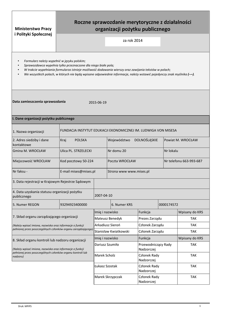 ZŽĐnjŶĞƐƉƌĂǁŽnjĚĂŶŝĞŵĞƌLJƚŽƌLJĐnjŶĞnjĚnjŝĂųĂůŶŽƑĐŝ ŽƌŐĂŶŝnjĂĐũŝƉŽǏLJƚŬƵƉƵďůŝĐnjŶĞŐŽ Ministerstwo Pracy ŝWŽůŝƚLJŬŝ^ƉŽųĞĐnjŶĞũ za rok 2014 • • • • &ŽƌŵƵůĂƌnjŶĂůĞǏLJǁLJƉĞųŶŝđǁũħnjLJŬƵƉŽůƐŬŝŵ͖ ^ƉƌĂǁŽnjĚĂǁĐĂǁLJƉĞųŶŝĂƚLJůŬŽƉƌnjĞnjŶĂĐnjŽŶĞĚůĂŶŝĞŐŽďŝĂųĞƉŽůĂ͖ tƚƌĂŬĐŝĞǁLJƉĞųŶŝĂŶŝĂĨŽƌŵƵůĂƌnjĂŝƐƚŶŝĞũĞŵŽǏůŝǁŽƑđĚŽĚĂǁĂŶŝĂǁŝĞƌƐnjLJŽƌĂnjnjĂǁŝũĂŶŝĂƚĞŬƐƚſǁǁƉŽůĂĐŚ͖ tĞǁƐnjLJƐƚŬŝĐŚƉŽůĂĐŚ͕ǁŬƚſƌLJĐŚŶŝĞďħĚČǁƉŝƐĂŶĞŽĚƉŽǁŝĞĚŶŝĞŝŶĨŽƌŵĂĐũĞ͕ŶĂůĞǏLJǁƐƚĂǁŝđƉŽũĞĚLJŶĐnjLJnjŶĂŬŵLJƑůŶŝŬĂ (--–). Data zamieszczenia sprawozdania 2015-06-19 /͘ĂŶĞŽƌŐĂŶŝnjĂĐũŝƉŽǏLJƚŬƵƉƵďůŝĐnjŶĞŐŽ 1. Nazwa organizacji FUNDACJA INSTYTUT EDUKACJI EKONOMICZNEJ IM. LUDWIGA VON MISESA 2. Adres siedziby i dane kontaktowe Kraj 'ŵŝŶĂD͘tZKBt POLSKA tŽũĞǁſĚnjƚǁŽK>EK_>^</ WŽǁŝĂƚD͘tZKBt Ulica PL. STRZELECKI Nr domu 20 Nr lokalu DŝĞũƐĐŽǁŽƑđtZKBt Kod pocztowy 50-224 WŽĐnjƚĂtZKBt Nr telefonu 663-993-687 Nr faksu - E-mail [email protected] Strona www www.mises.pl ϯ͘ĂƚĂƌĞũĞƐƚƌĂĐũŝǁ<ƌĂũŽǁLJŵZĞũĞƐƚƌnjĞ^ČĚŽǁLJŵ ϰ͘ĂƚĂƵnjLJƐŬĂŶŝĂƐƚĂƚƵƐƵŽƌŐĂŶŝnjĂĐũŝƉŽǏLJƚŬƵ publicznego 5. Numer REGON 93294923400000 ϳ͘^ŬųĂĚŽƌŐĂŶƵnjĂƌnjČĚnjĂũČĐĞŐŽŽƌŐĂŶŝnjĂĐũŝ ;EĂůĞǏLJǁƉŝƐĂđŝŵŝŽŶĂ͕ŶĂnjǁŝƐŬĂŽƌĂnjŝŶĨŽƌŵĂĐũĞŽĨƵŶŬĐũŝ ƉĞųŶŝŽŶĞũƉƌnjĞnjƉŽƐnjĐnjĞŐſůŶLJĐŚĐnjųŽŶŬſǁŽƌŐĂŶƵnjĂƌnjČĚnjĂũČĐĞŐŽͿ ϴ͘^ŬųĂĚŽƌŐĂŶƵŬŽŶƚƌŽůŝůƵďŶĂĚnjŽƌƵŽƌŐĂŶŝnjĂĐũŝ ;EĂůĞǏLJǁƉŝƐĂđŝŵŝŽŶĂ͕ŶĂnjǁŝƐŬĂŽƌĂnjŝŶĨŽƌŵĂĐũĞŽĨƵŶŬĐũŝ ƉĞųŶŝŽŶĞũƉƌnjĞnjƉŽƐnjĐnjĞŐſůŶLJĐŚĐnjųŽŶŬſǁŽƌŐĂŶƵŬŽŶƚƌŽůŝůƵď nadzoru) Druk: MPiPS 2007-04-10 6. Numer KRS 0000174572 /ŵŝħŝŶĂnjǁŝƐŬŽ Funkcja Wpisany do KRS Mateusz Benedyk WƌĞnjĞƐĂƌnjČĚƵ TAK ƌŬĂĚŝƵƐnj^ŝĞƌŽŷ njųŽŶĞŬĂƌnjČĚƵ TAK ^ƚĂŶŝƐųĂǁ<ǁŝĂƚŬŽǁƐŬŝ njųŽŶĞŬĂƌnjČĚƵ TAK /ŵŝħŝŶĂnjǁŝƐŬŽ Funkcja ĂƌŝƵƐnj^njƵŵŝųŽ WƌnjĞǁŽĚŶŝĐnjČĐLJZĂĚLJ Nadzorczej TAK Marek Scholz njųŽŶĞŬZĂĚLJ Nadzorczej TAK BƵŬĂƐnj^njŽƐƚĂŬ njųŽŶĞŬZĂĚLJ Nadzorczej TAK Marek Skrzypczak njųŽŶĞŬZĂĚLJ Nadzorczej TAK Wpisany do KRS 1 9. Cele statutowe organizacji ;EĂůĞǏLJŽƉŝƐĂđĐĞůĞŶĂƉŽĚƐƚĂǁŝĞƐƚĂƚƵƚƵŽƌŐĂŶŝnjĂĐũŝͿ Celem Fundacji jest: 1ͿƉƌŽǁĂĚnjĞŶŝĞŝǁƐƉŝĞƌĂŶŝĞĚnjŝĂųĂůŶŽƑĐŝŶĂƵŬŽǁĞũ͕ĞĚƵŬĂĐLJũŶĞũŝ ŽƑǁŝĂƚŽǁĞũ͕njĞƐnjĐnjĞŐſůŶLJŵƵǁnjŐůħĚŶŝĞŶŝĞŵŶĂƵŬŝĞŬŽŶŽŵŝŝ͕ĚŽƌŽďŬƵ ƐnjŬŽųLJĂƵƐƚƌŝĂĐŬŝĞũĞŬŽŶŽŵŝŝŽƌĂnjŬůĂƐLJĐnjŶĞŐŽůŝďĞƌĂůŝnjŵƵ͖ 2ͿĚnjŝĂųĂŶŝĞŶĂƌnjĞĐnjƉƌnjĞƐƚƌnjĞŐĂŶŝĂŶĂƚƵƌĂůŶLJĐŚƉƌĂǁĐnjųŽǁŝĞŬĂ͕ǁ ƐnjĐnjĞŐſůŶŽƑĐŝǁŽůŶŽƑĐŝũĞĚŶŽƐƚŬŝ͕ǁųĂƐŶŽƑĐŝƉƌLJǁĂƚŶĞũŝƉƌĂǁĂĚŽǏLJĐŝĂ͘ &ƵŶĚĂĐũĂŽƐŝČŐĂƐǁŽũĞĐĞůĞƉŽƉƌnjĞnj͗ 1ͿƉƌŽǁĂĚnjĞŶŝĞƉƌŽŐƌĂŵſǁŶĂƵŬŽǁLJĐŚŵĂũČĐLJĐŚĚŽƐƚĂƌĐnjLJđŝŶĨŽƌŵĂĐũŝ ŝƐƚŽƚŶLJĐŚnjĞǁnjŐůħĚƵŶĂĐĞů&ƵŶĚĂĐũŝ͖ 10. Sposób realizacji celów statutowych organizacji 2) organizowanie i finansowanie: a) konferencji, seminariów i zjazdów naukowych; ;EĂůĞǏLJŽƉŝƐĂđƐƉŽƐſďƌĞĂůŝnjĂĐũŝĐĞůſǁƐƚĂƚƵƚŽǁLJĐŚŽƌŐĂŶŝnjĂĐũŝŶĂ ďͿŽĚĐnjLJƚſǁ͕ŬƵƌƐſǁ͕ƐnjŬŽůĞŷ͕ǁĂƌƐnjƚĂƚſǁ͖ c) konkursów na prace naukowe; podstawie statutu organizacji) 3ͿǁƐƉſųƉƌĂĐħŝŬŽŽƌĚLJŶĂĐũħĚnjŝĂųĂŷnjŽƐŽďĂŵŝŝŽƌŐĂŶŝnjĂĐũĂŵŝ ĚnjŝĂųĂũČĐLJŵŝǁnjĂŬƌĞƐŝĞŽďũħƚLJŵĐĞůĞŵ&ƵŶĚĂĐũŝ͖ 4ͿŐƌŽŵĂĚnjĞŶŝĞƑƌŽĚŬſǁĨŝŶĂŶƐŽǁLJĐŚŝnjĂƐŽďſǁŵĂƚĞƌŝĂůŶLJĐŚǁĐĞůƵ rozwoju bazy badawczej; 5ͿƵĚŽƐƚħƉŶŝĂŶŝĞŶĂƐƚƌŽŶŝĞŝŶƚĞƌŶĞƚŽǁĞũ&ƵŶĚĂĐũŝƉƌĂĐŝĂƌƚLJŬƵųſǁnj njĂŬƌĞƐƵĞŬŽŶŽŵŝŝŽƌĂnjŬŽŵĞŶƚĂƌnjLJĚŽƚLJĐnjČĐLJĐŚďŝĞǏČĐLJĐŚǁLJĚĂƌnjĞŷǁ sferze gospodarczej; 6) prowadzenie akcji informacyjnych; 7ͿĨŝŶĂŶƐŽǁĂŶŝĞƐƚLJƉĞŶĚŝſǁĚůĂŽƐſďƌĞĂůŝnjƵũČĐLJĐŚĐĞůĞ&ƵŶĚĂĐũŝ͖ 8ͿǁƐƉſųĚnjŝĂųĂŶŝĞnjŝŶŶLJŵŝŝŶƐƚLJƚƵĐũĂŵŝ͕ŽƌŐĂŶŝnjĂĐũĂŵŝŝŽƐŽďĂŵŝĚůĂ ŽƐŝČŐŶŝħĐŝĂǁƐƉſůŶLJĐŚĐĞůſǁ͕ǁĨŽƌŵŝĞǁƐƉĂƌĐŝĂŽƌŐĂŶŝnjĂĐLJũŶĞŐŽ͕ ĐnjħƑĐŝŽǁĞŐŽůƵďĐĂųŬŽǁŝƚĞŐŽĨŝŶĂŶƐŽǁĂŶŝĂƉƌnjĞĚƐŝħǁnjŝħđůƵďƉŽŵŽĐLJǁ ƵnjLJƐŬĂŶŝƵĨƵŶĚƵƐnjLJnjŝŶŶLJĐŚǍƌſĚĞų͘ //͘ŚĂƌĂŬƚĞƌLJƐƚLJŬĂĚnjŝĂųĂůŶŽƑĐŝŽƌŐĂŶŝnjĂĐũŝƉŽǏLJƚŬƵƉƵďůŝĐnjŶĞŐŽǁŽŬƌĞƐŝĞƐƉƌĂǁŽnjĚĂǁĐnjLJŵ ϭ͘KƉŝƐĚnjŝĂųĂůŶŽƑĐŝƉŽǏLJƚŬƵƉƵďůŝĐnjŶĞŐŽ ϭ͘ϭ͘KƉŝƐŐųſǁŶLJĐŚ ĚnjŝĂųĂŷƉŽĚũħƚLJĐŚ ƉƌnjĞnjŽƌŐĂŶŝnjĂĐũħ Druk: MPiPS 2 W 2014ƌ͘ŶĂŬųĂĚĞŵ&ƵŶĚĂĐũŝƵŬĂnjĂųLJƐŝħŬƐŝČǏŬŝ͗ ͻ:ƂƌŐ'ƵŝĚŽ,ƺůƐŵĂŶŶ͕ƚLJŬĂƉƌŽĚƵŬĐũŝƉŝĞŶŝČĚnjĂ͘ ͻ&ƌŝĞĚƌŝĐŚǀŽŶ,ĂLJĞŬ͕WŝĞŶŝČĚnjŝŬƌLJnjLJƐLJ͕njŝĞųĂǁLJďƌĂŶĞ͕ƚ͘/͘ tnjǁŝČnjŬƵnjǁLJĚĂŶŝĞŵŬƐŝČǏŬŝ,ĂLJĞŬĂǁ40͘ƌŽĐnjŶŝĐħŽƚƌnjLJŵĂŶŝĂƉƌnjĞnjŶŝĞŐŽĞŬŽŶŽŵŝĐnjŶĞũEĂŐƌŽĚLJ EŽďůĂ͕/ŶƐƚLJƚƵƚnjŽƌŐĂŶŝnjŽǁĂųŬŽŶŬƵƌƐŶĂĞƐĞũĚŽ