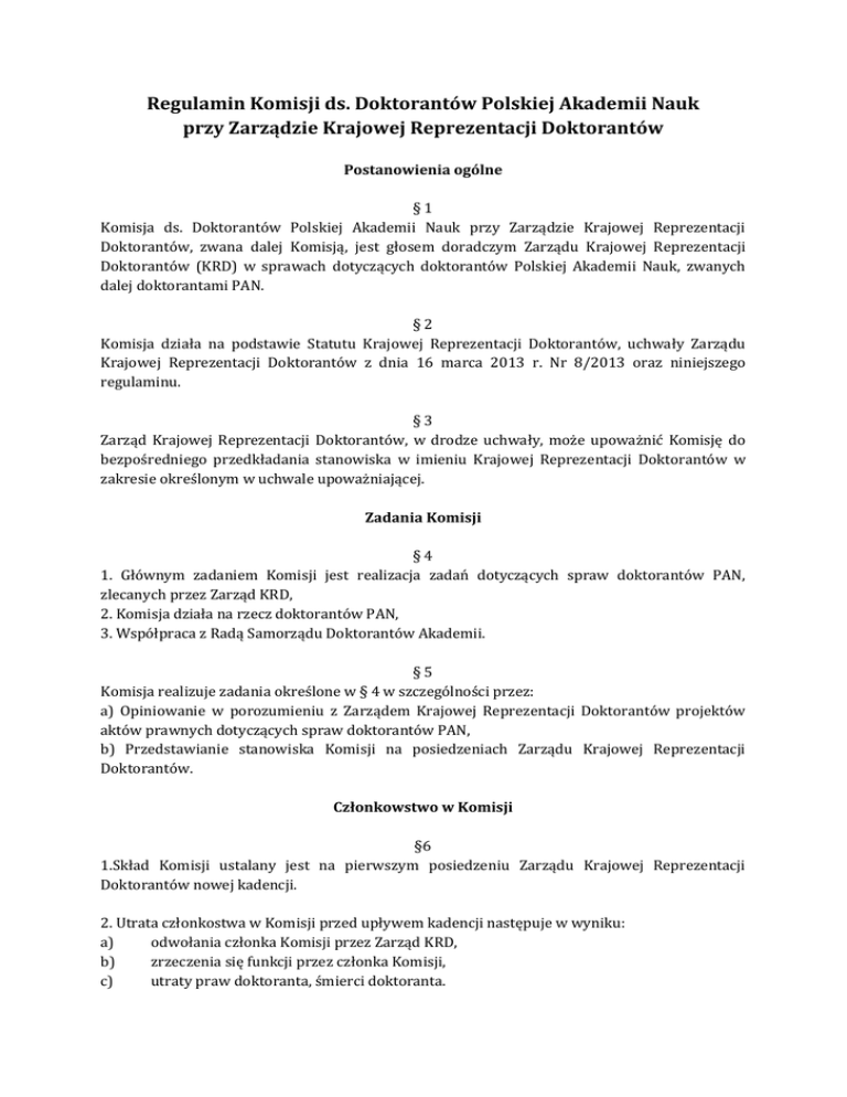 Regulamin Komisji ds. Doktorantów Polskiej Akademii Nauk przy Zarządzie Krajowej Reprezentacji Doktorantów Postanowienia ogólne §1 Komisja ds. Doktorantów Polskiej Akademii Nauk przy Zarządzie Krajowej Reprezentacji Doktorantów, zwana dalej Komisją, jest głosem doradczym Zarządu Krajowej Reprezentacji Doktorantów (KRD) w sprawach dotyczących doktorantów Polskiej Akademii Nauk, zwanych dalej doktorantami PAN. §2 Komisja działa na podstawie Statutu Krajowej Reprezentacji Doktorantów, uchwały Zarządu Krajowej Reprezentacji Doktorantów z dnia 16 marca 2013 r. Nr 8/2013 oraz niniejszego regulaminu. §3 Zarząd Krajowej Reprezentacji Doktorantów, w drodze uchwały, może upoważnić Komisję do bezpośredniego przedkładania stanowiska w imieniu Krajowej Reprezentacji Doktorantów w zakresie określonym w uchwale upoważniającej. Zadania Komisji §4 1. Głównym zadaniem Komisji jest realizacja zadań dotyczących spraw doktorantów PAN, zlecanych przez Zarząd KRD, 2. Komisja działa na rzecz doktorantów PAN, 3. Współpraca z Radą Samorządu Doktorantów Akademii. §5 Komisja realizuje zadania określone w § 4 w szczególności przez: a) Opiniowanie w porozumieniu z Zarządem Krajowej Reprezentacji Doktorantów projektów aktów prawnych dotyczących spraw doktorantów PAN, b) Przedstawianie stanowiska Komisji na posiedzeniach Zarządu Krajowej Reprezentacji Doktorantów. Członkowstwo w Komisji §6 1.Skład Komisji ustalany jest na pierwszym posiedzeniu Zarządu Krajowej Reprezentacji Doktorantów nowej kadencji. 2. Utrata członkostwa w Komisji przed upływem kadencji następuje w wyniku: a) odwołania członka Komisji przez Zarząd KRD, b) zrzeczenia się funkcji przez członka Komisji, c) utraty praw doktoranta, śmierci doktoranta. Zwoływanie i przebieg posiedzenia Komisji §7 Posiedzenie Komisji zwołuje Przewodniczący Komisji lub inny wyznaczony przez niego członek Komisji. §8 Osoba zwołująca ma obowiązek powiadomić członków Komisji o miejscu, terminie i programie posiedzenia Komisji, nie później niż na tydzień przed rozpoczęciem posiedzenia. §9 W każdym roku akademickim odbywają się co najmniej dwa posiedzenia Komisji. § 10 Posiedzenie Komisji prowadzi Przewodniczący lub wyznaczona przez niego osoba. § 11 1. Komisja podejmuje uchwały zwykłą większością głosów w obecności ponad połowy członków Komisji. 2. Uchwały mogą być również podejmowane bez zwoływania posiedzenia w przypadku ich asygnowania przez większość uprawnionych do głosowania. § 12 Komisja podejmuje uchwały w głosowaniu jawnym. Uchwały w sprawach personalnych podejmowane są w głosowaniu tajnym. Postanowienia końcowe §13 Niniejszy regulamin wchodzi w życie z chwilą uchwalenia przez Zarząd Krajowej Reprezentacji Doktorantów.