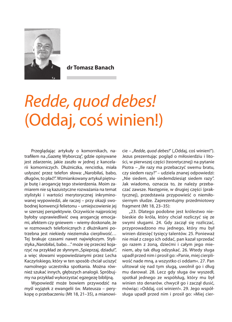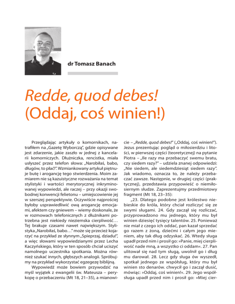 dr Tomasz Banach Redde, quod debes! (Oddaj, coś winien!) Przeglądając artykuły o komornikach, natrafiłem na „Gazetę Wyborczą”, gdzie opisywane jest zdarzenie, jakie zaszło w jednej z kancelarii komorniczych. Dłużniczka, rencistka, miała usłyszeć przez telefon słowa: „Narobiłaś, babo, długów, to płać!”. Wzmiankowany artykuł piętnuje butę i arogancję tego stwierdzenia. Moim zamiarem nie są kazuistyczne rozważania na temat stylistyki i wartości merytorycznej inkryminowanej wypowiedzi, ale raczej – przy okazji swobodnej konwencji felietonu – umiejscowienie jej w szerszej perspektywie. Oczywiście najprościej byłoby usprawiedliwić ową arogancję emocjami, afektem czy gniewem – wiemy doskonale, że w rozmowach telefonicznych z dłużnikami potrzebna jest niekiedy nieziemska cierpliwość… Tej brakuje czasami nawet największym. Stylistyka „Narobiłaś, babo…” może się przecież kojarzyć na przykład ze słynnym „Spieprzaj, dziadu!”, a więc słowami wypowiedzianymi przez Lecha Kaczyńskiego, który w ten sposób chciał uciszyć namolnego uczestnika spotkania. Można również szukać innych, głębszych analogii. Spróbujmy na przykład wykorzystać egzegezę biblijną. Wypowiedź może bowiem przywodzić na myśl wyjątek z ewangelii św. Mateusza – perykopę o przebaczeniu (Mt 18, 21–35), a mianowi- cie – „Redde, quod debes!” („Oddaj, coś winien!”). Jezus prezentując pogląd o miłosierdziu i litości, w pierwszej części (teoretycznej) na pytanie Piotra – „Ile razy ma przebaczyć swemu bratu, czy siedem razy?” – udziela znanej odpowiedzi: „Nie siedem, ale siedemdziesiąt siedem razy”. Jak wiadomo, oznacza to, że należy przebaczać zawsze. Następnie, w drugiej części (praktycznej), przedstawia przypowieść o niemiłosiernym słudze. Zaprezentujmy przedmiotowy fragment (Mt 18, 23–35): „23. Dlatego podobne jest królestwo niebieskie do króla, który chciał rozliczyć się ze swymi sługami. 24. Gdy zaczął się rozliczać, przyprowadzono mu jednego, który mu był winien dziesięć tysięcy talentów. 25. Ponieważ nie miał z czego ich oddać, pan kazał sprzedać go razem z żoną, dziećmi i całym jego mieniem, aby tak dług odzyskać. 26. Wtedy sługa upadł przed nim i prosił go: »Panie, miej cierpliwość nade mną, a wszystko ci oddam«. 27. Pan ulitował się nad tym sługą, uwolnił go i dług mu darował. 28. Lecz gdy sługa ów wyszedł, spotkał jednego ze współsług, który mu był winien sto denarów. chwycił go i zaczął dusić, mówiąc: »Oddaj, coś winien!«. 29. Jego współsługa upadł przed nim i prosił go: »Miej cier- Lux veritatis pliwość nade mną, a oddam tobie«. 30. On jednak nie chciał, lecz poszedł i wtrącił go do więzienia, dopóki nie odda długu. 31. Współsłudzy jego widząc, co się działo, bardzo się zasmucili. poszli i opowiedzieli swemu panu wszystko, co zaszło. 32. Wtedy pan jego wezwał go przed siebie i rzekł mu: »Sługo niegodziwy! Darowałem ci cały ten dług, ponieważ mnie prosiłeś. 33. Czyż więc i ty nie powinieneś był ulitować się nad swoim współsługą, jak ja ulitowałem się nad tobą?«. 34. I uniesiony gniewem pan jego kazał wydać go katom, dopóki mu całego długu nie odda. 35. Podobnie uczyni wam ojciec mój niebieski, jeżeli każdy z was nie przebaczy z serca swemu bratu”. Przypowieść ta nie oznacza nic innego jak to, że Bóg (w przypowieści król) nie będzie okazywał miłosierdzia tym, którzy są niemiłosierni dla swoich braci. Pozostaje pytanie – jak powyższe rozważania mają się do przytoczonej na wstępie wypowiedzi i czy komornik sądowy w ogóle może być miłosierny? Otóż, jak wiadomo, w zawód komornika wpisany jest immanentnie spór – dłużnik przecież dobrowolnie długu nie spłaca. Spór z kolei często wiąże się z emocjami. Podkreślić jednak wypada, że komornik zgodnie z Kodeksem Etyki Zawodowej winien „unikać arogancji i nieposzanowania godności stron podejmowanych czynności”. I może tak należy rozumieć aspekt miłosierdzia w zawodzie komornika sądowego – komornika, który we wszelkich kontaktach z dłużnikami zachowuje spokój, cierpliwość i opanowanie, ale stara się także zrozumieć niejednokrotnie trudną sytuację dłużnika i okazać, przy sumiennym wykonywaniu swych obowiązków, zwyczajną, „ludzką” życzliwość. Przeciwko dłużnikom z natury agresywnym i grubiańskim należy zaś „uzbroić się pancerzem cierpliwości”, a na słowa obelżywe nie zważać „jak człowiek, co nie słyszy; i nie ma w ustach odpowiedzi” (Ps 38, 15). 63